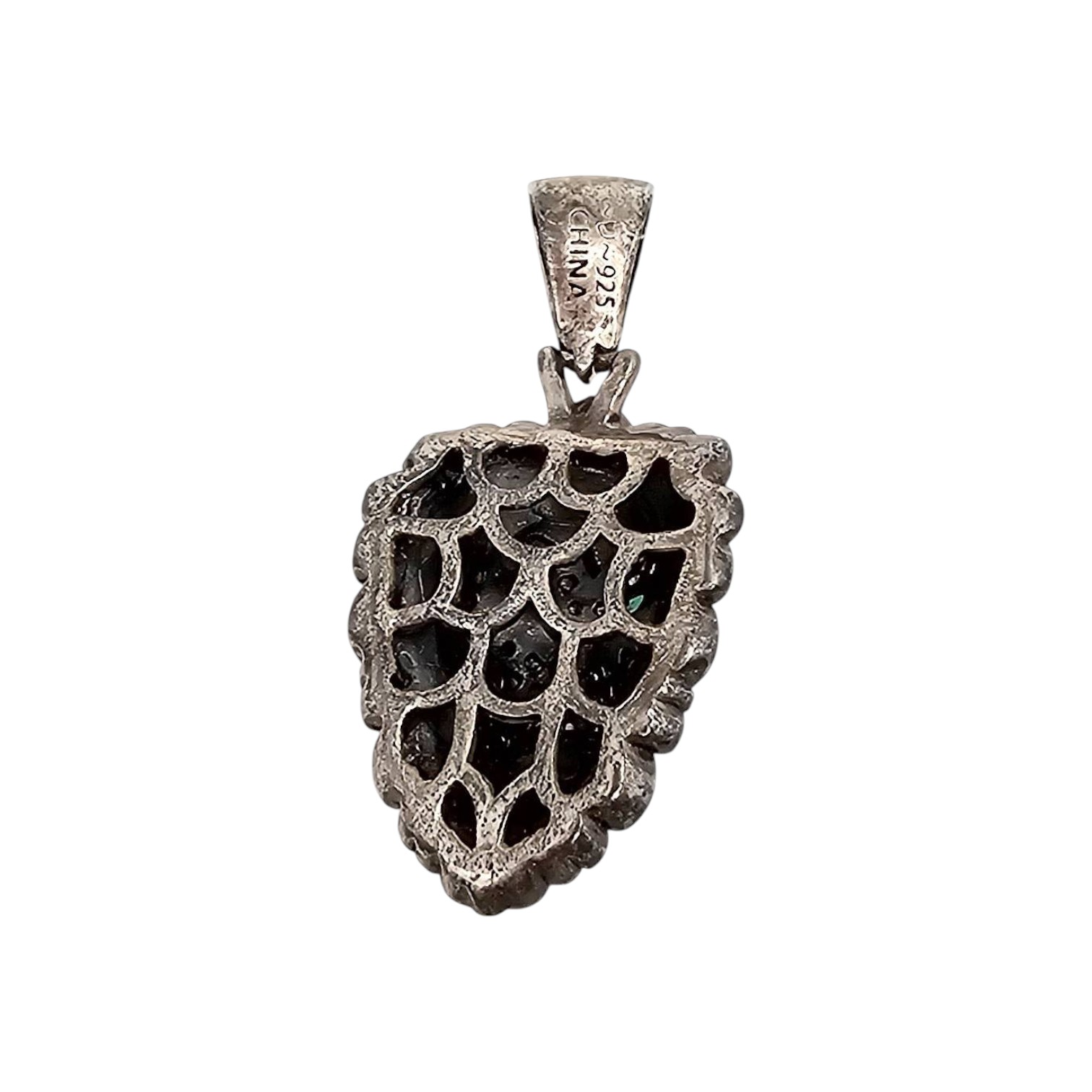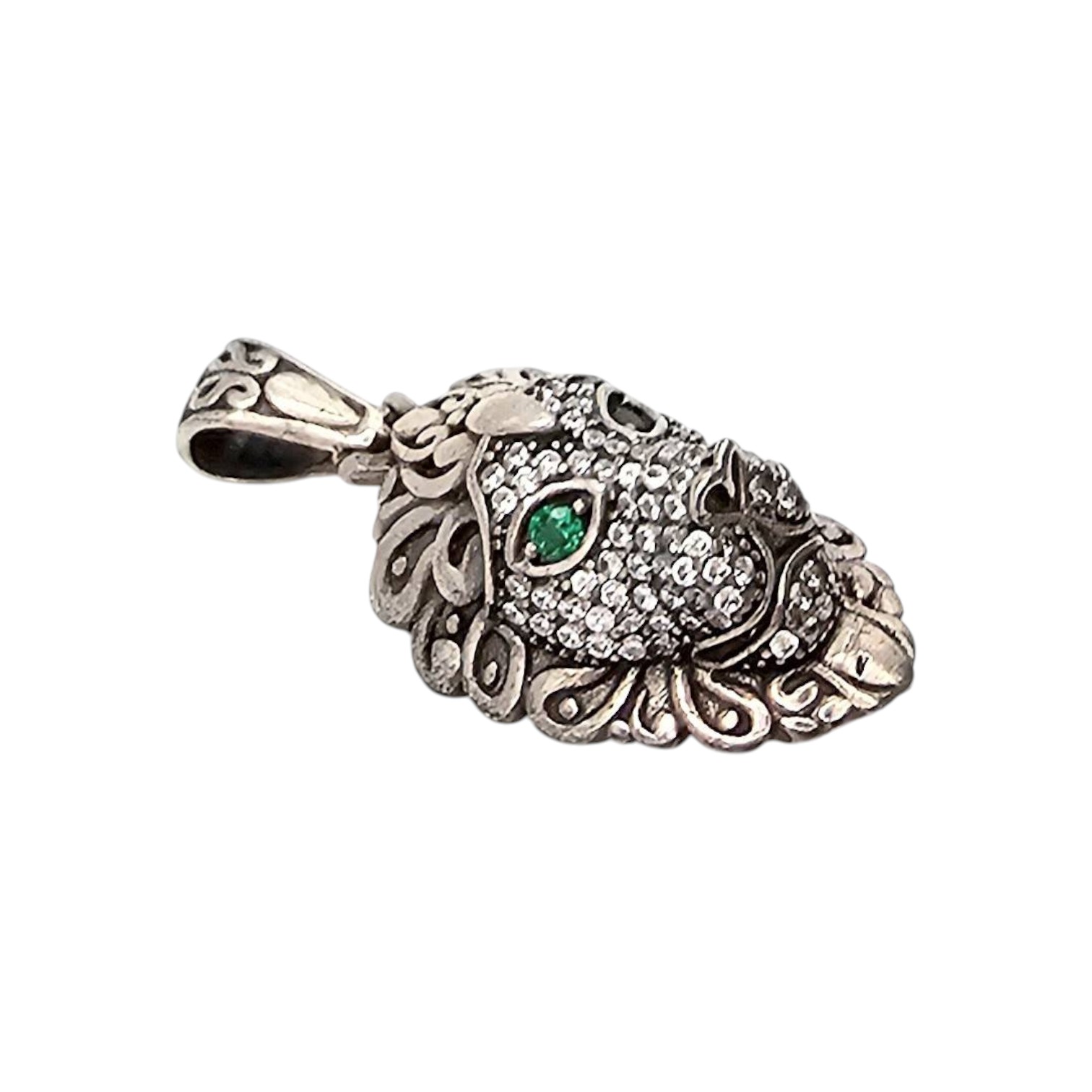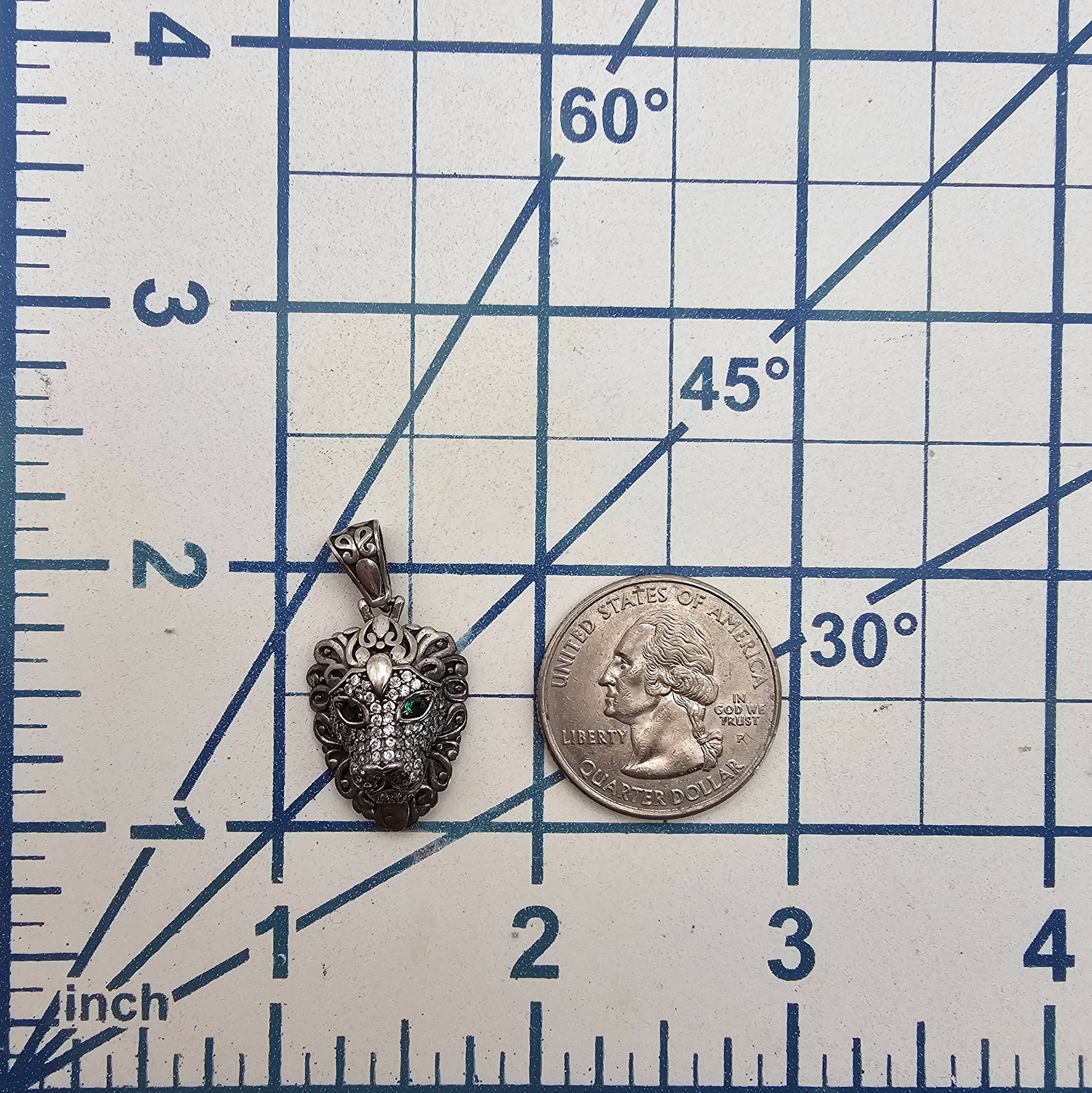 Sterling silver lion head pendant featuring detailed craftsmanship with green accents symbolizing the eyes. Weighing approximately 4.8 grams, the pendant displays an intricately patterned design. The back side reveals an open weave structure and is stamped ‘.925 China.’ Suitable for fine jewelry collections.