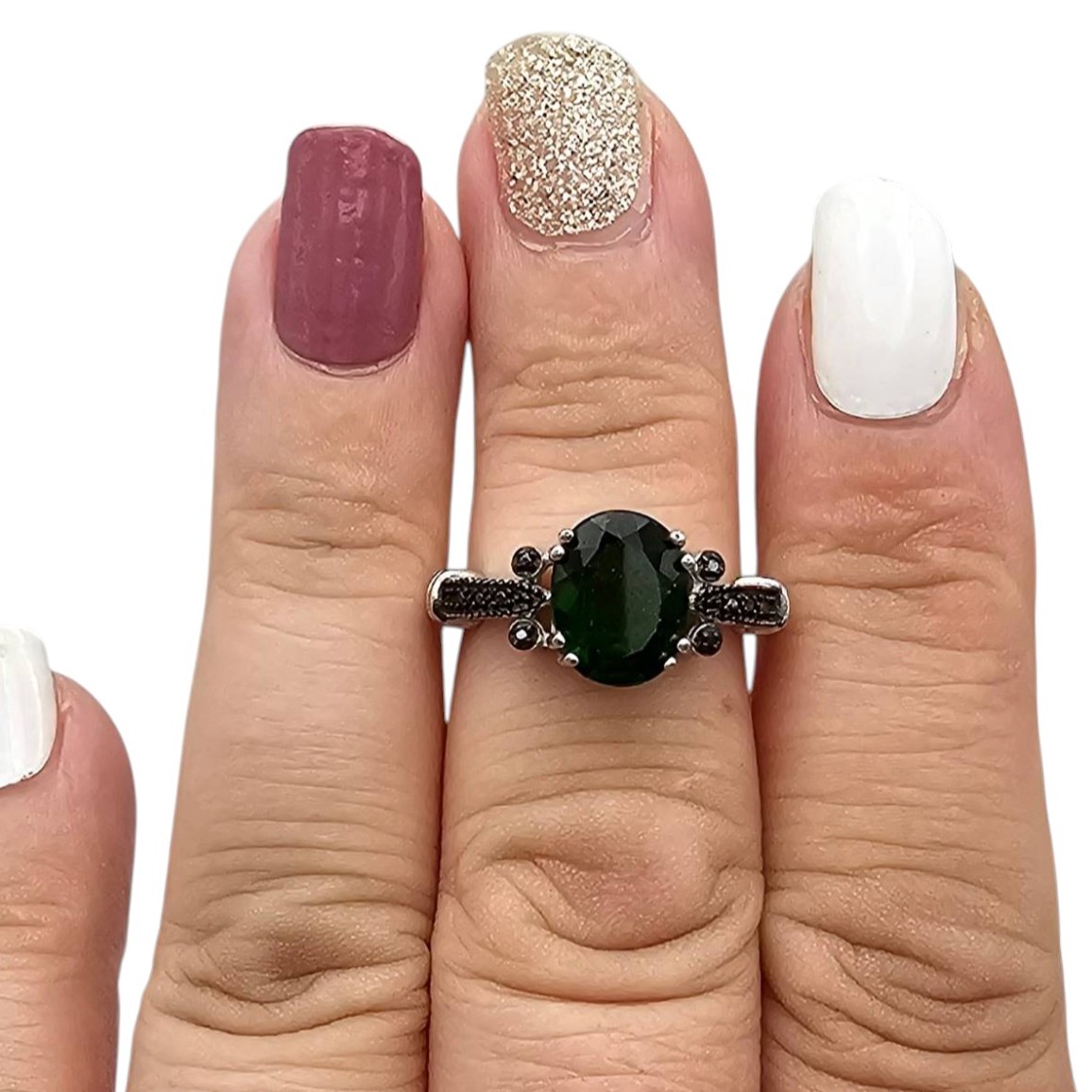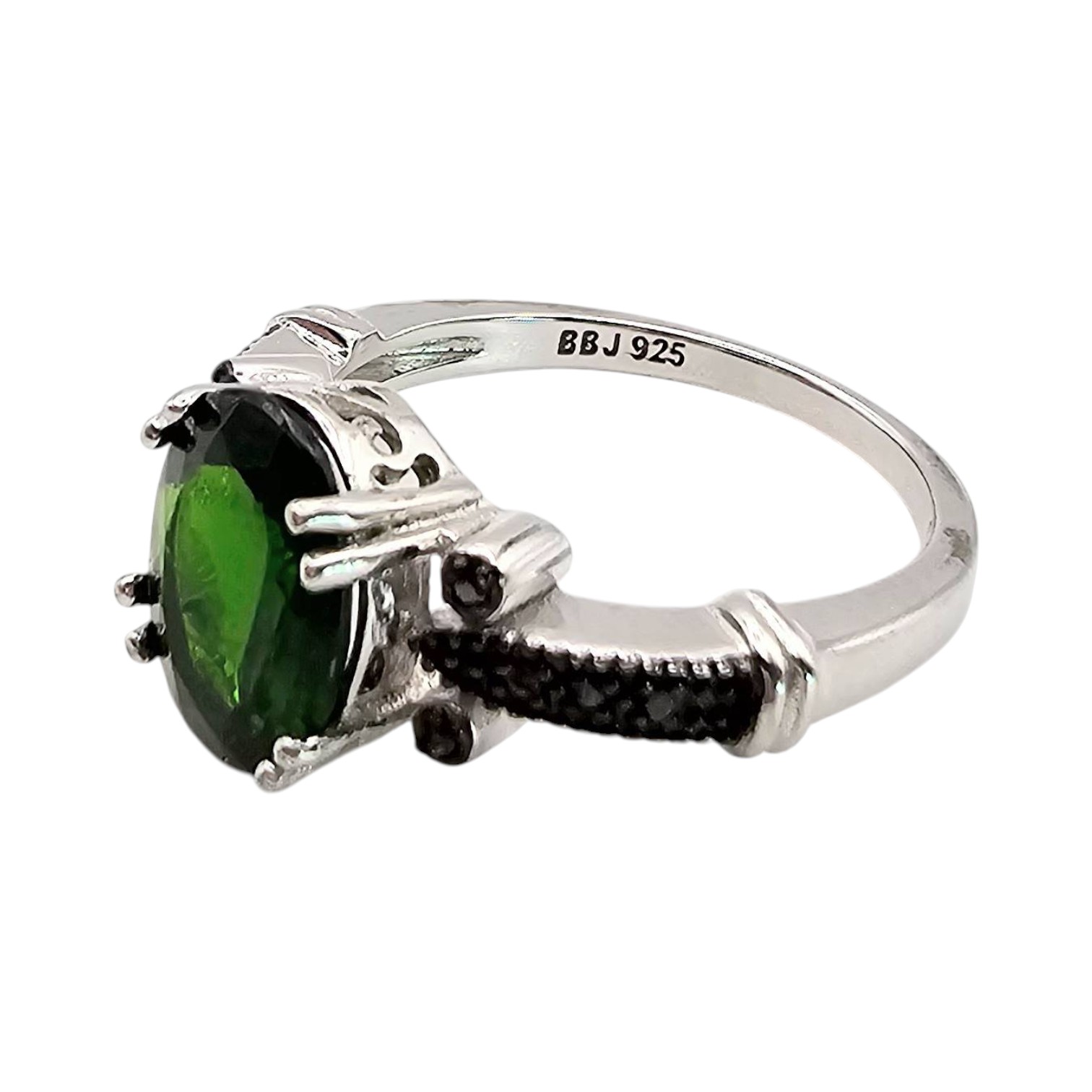 BBJ stamped sterling silver ring featuring a vibrant oval-cut green chrysoprase stone set in a secure prong arrangement. The ring is accented with black stones along the band for added contrast, weighing approximately 3.5g. Size 6.25, marked 925 for sterling silver purity.