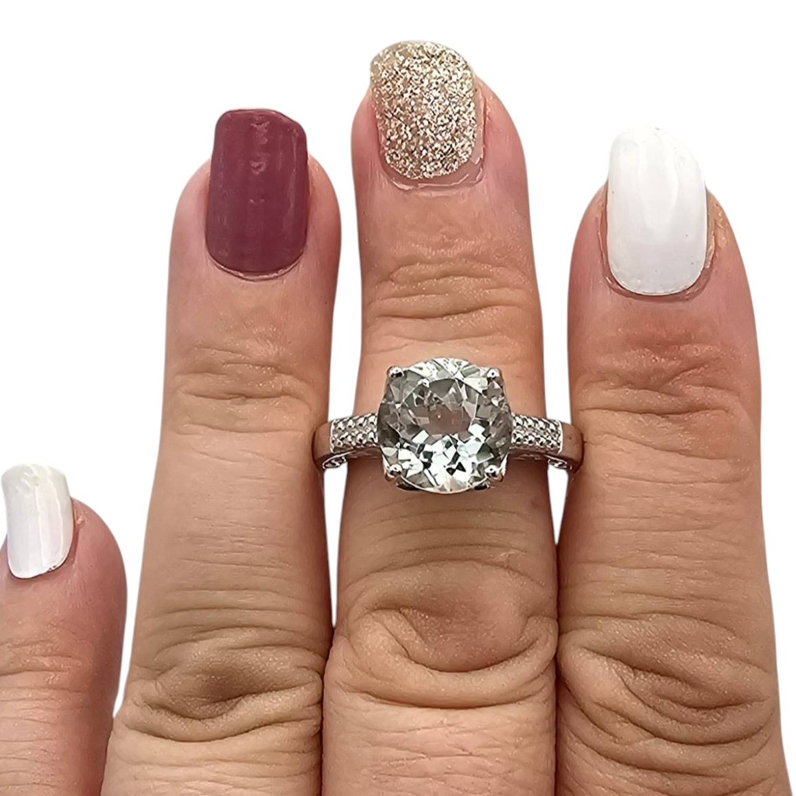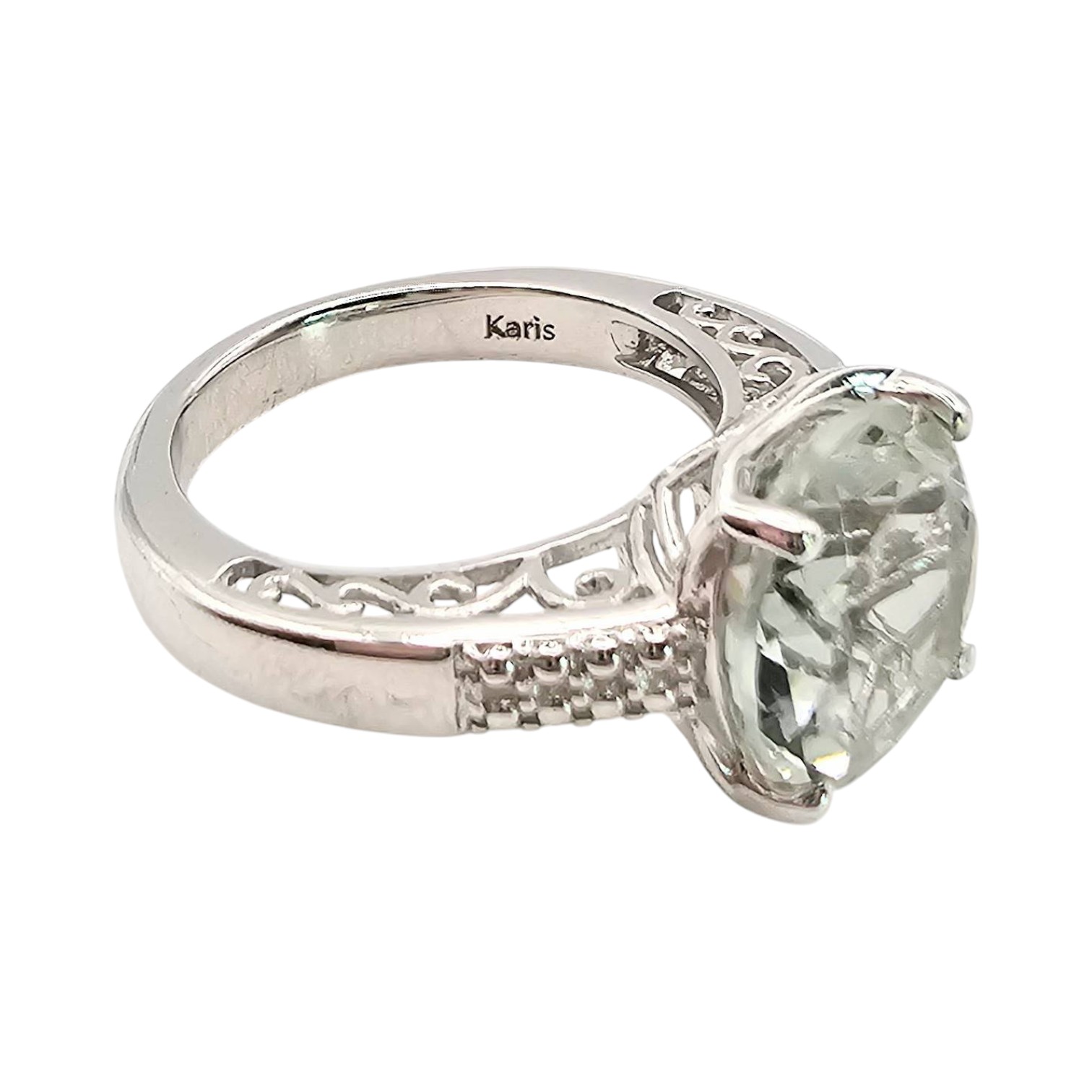 Karis brand ring crafted from sterling silver, featuring a large round-cut aquamarine gemstone. The ring is adorned with additional decorative elements along the band and has a total weight of 4.3 grams. Designed in a size 7, this ring combines elegant materials with a lightweight build, making it an exquisite accessory for various occasions.