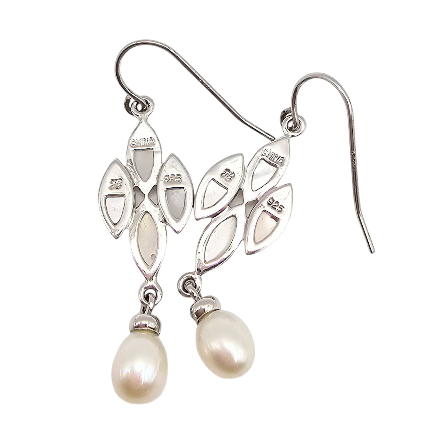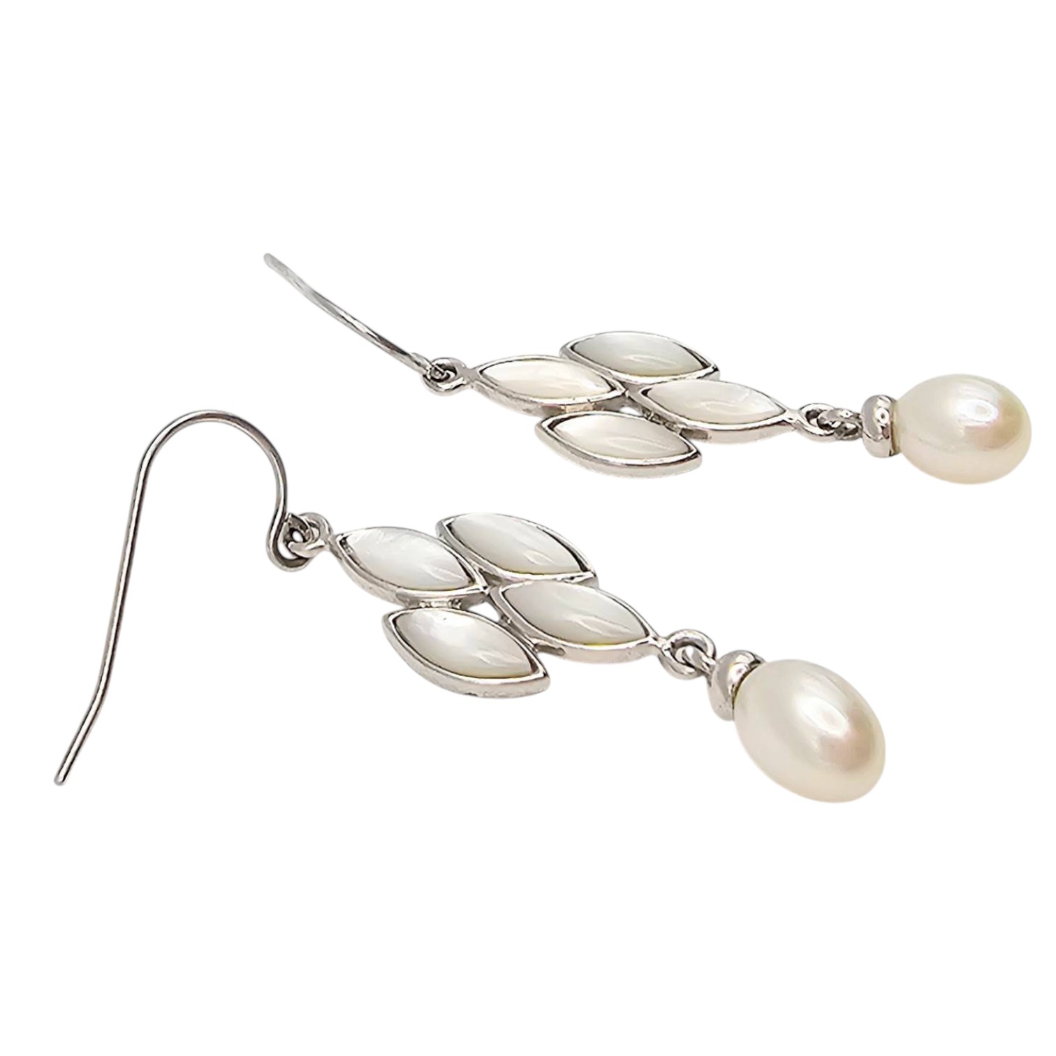 Honora drop earrings crafted from sterling silver featuring a design with marquise-like shapes and pearl accents. Weighing 3.4 grams, these earrings feature delicate, elegant details and a secure hook back. A perfect addition to any jewelry collection.
