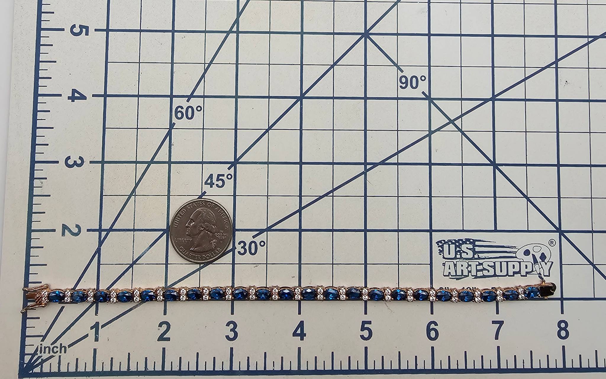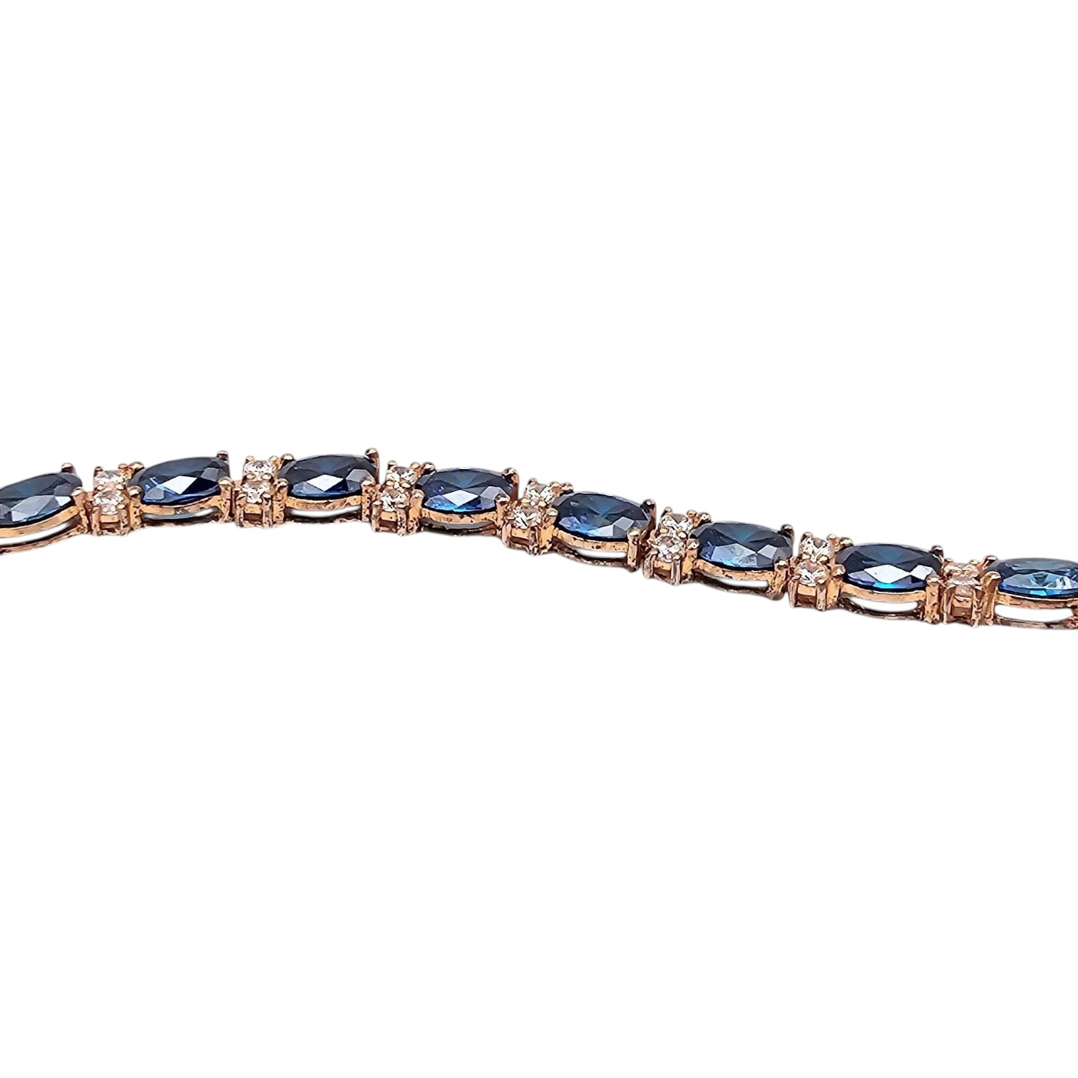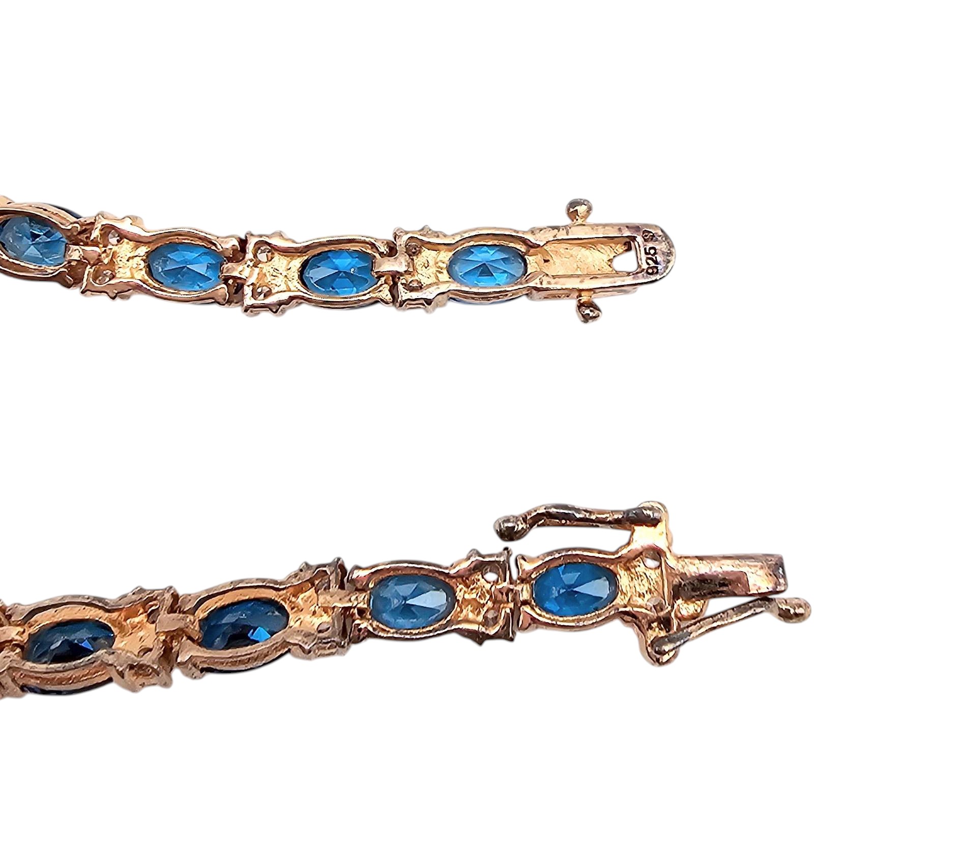 Rhinestone tennis bracelet featuring gold over sterling silver. The bracelet showcases blue and clear rhinestones arranged alternately in an elegant design. It weighs 11.4 grams and measures approximately 7 inches in length. Includes a secure locking clasp for stability during wear.