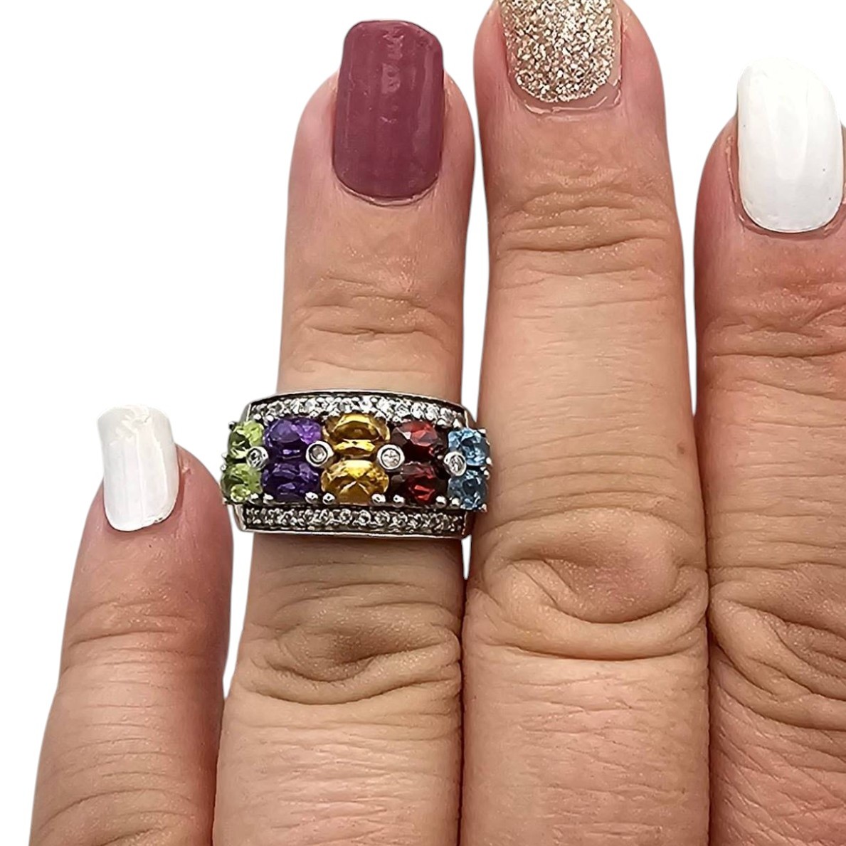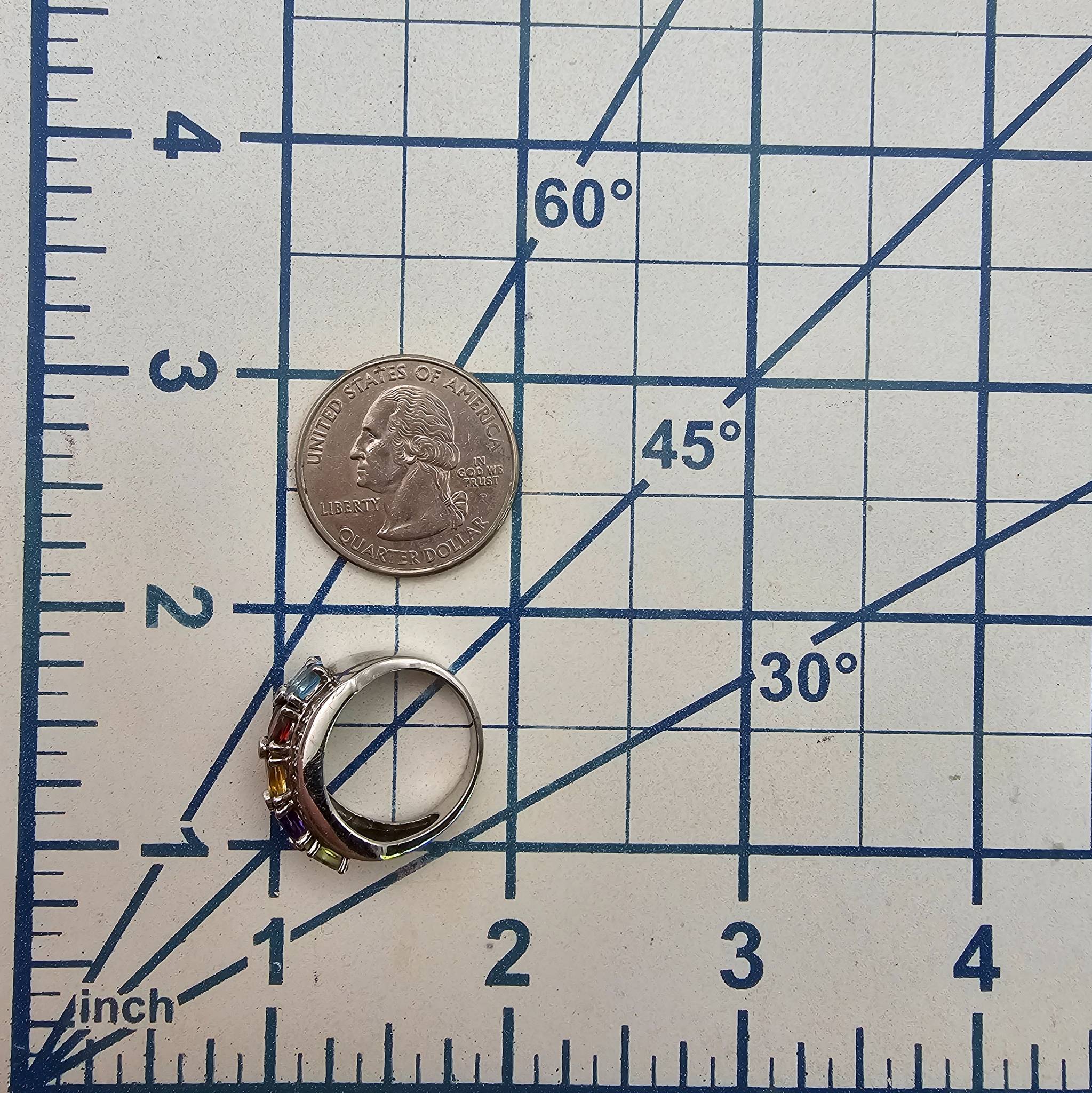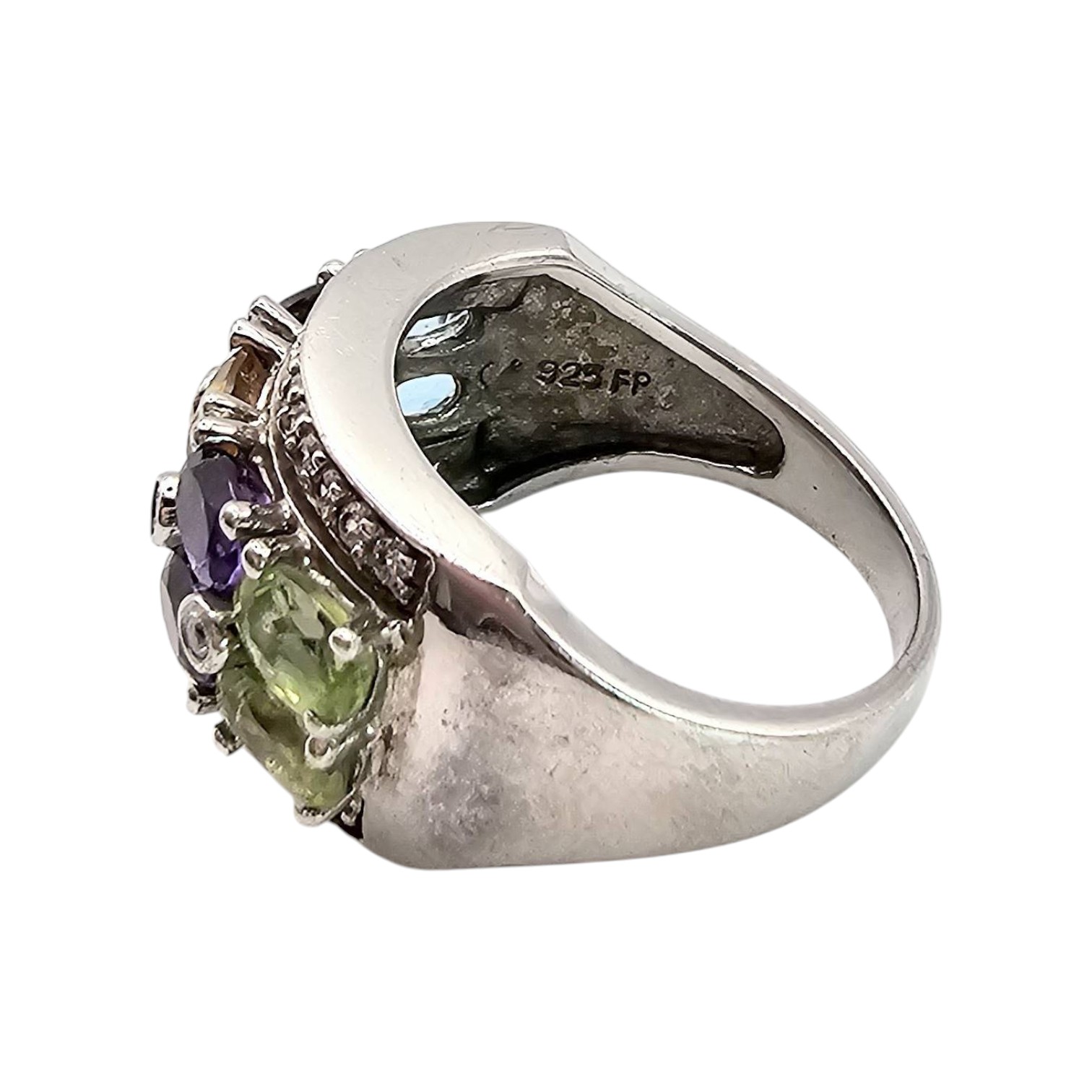 Sterling silver ring marked FP featuring a multi-gemstone design with vibrant stones including peridot, amethyst, citrine, garnet, and blue topaz. The band is accented with cubic zirconia details, adding sparkle to the design. The total weight of the ring is 4.9 grams, and it is a size 5.75.