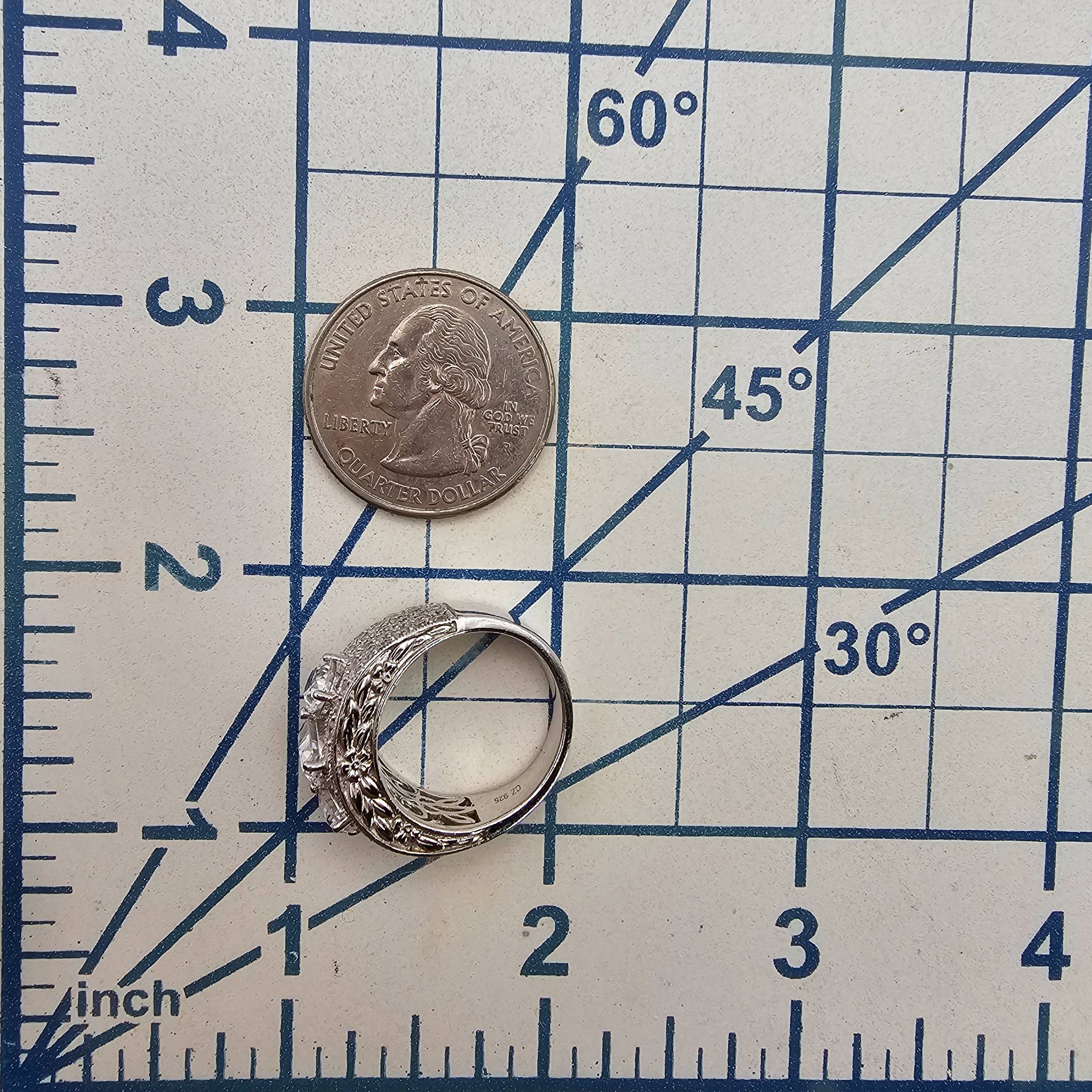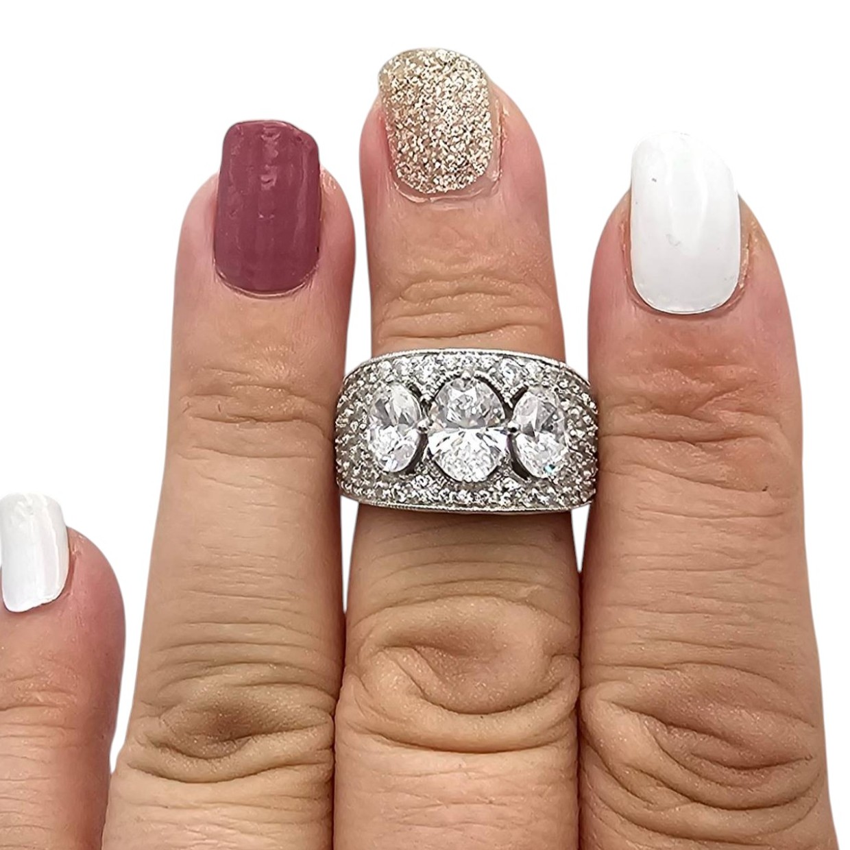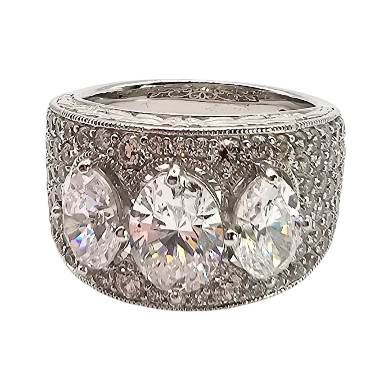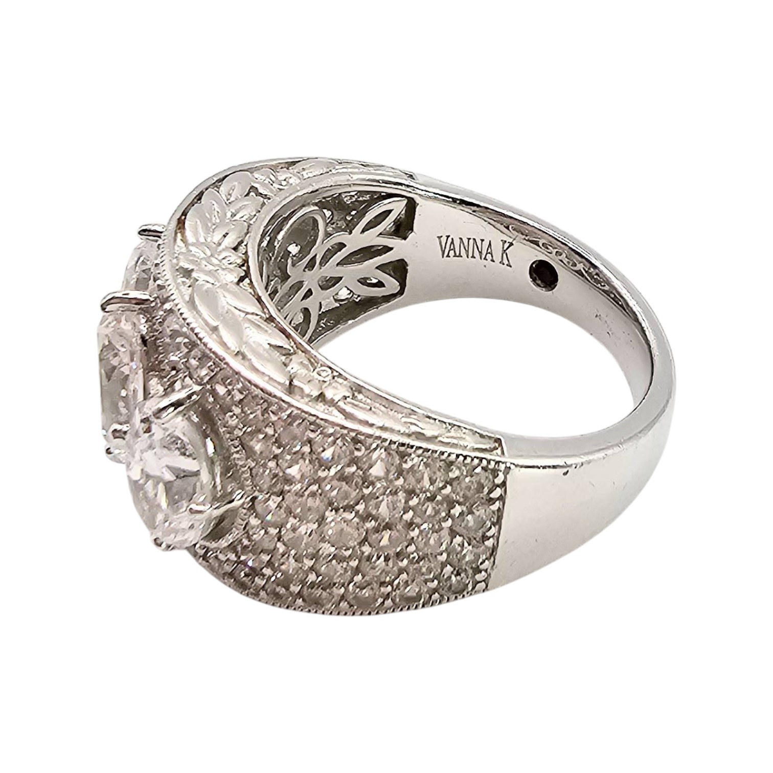 A sterling silver ring by Vanna K featuring cubic zirconia stones in a bold design. The ring is detailed with intricate patterns and set with three prominent Cubic Zirconia stones surrounded by pave accents. Size 6.5, weighing approximately 8.4 grams with ‘Vanna K’ marking inside the band.