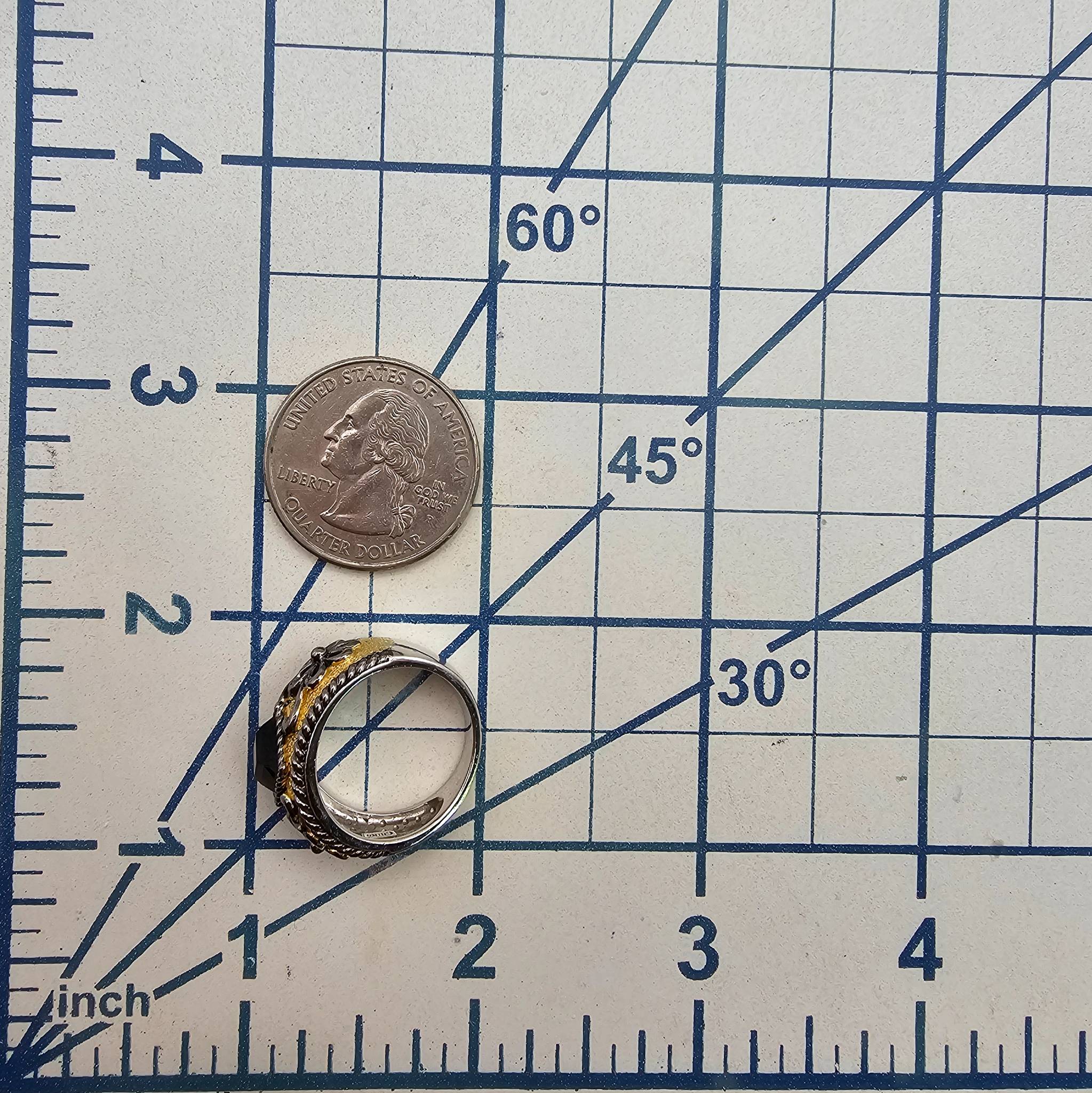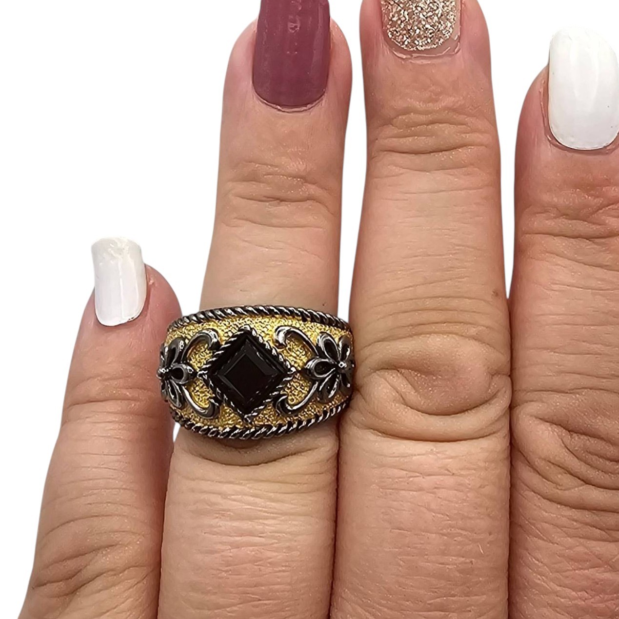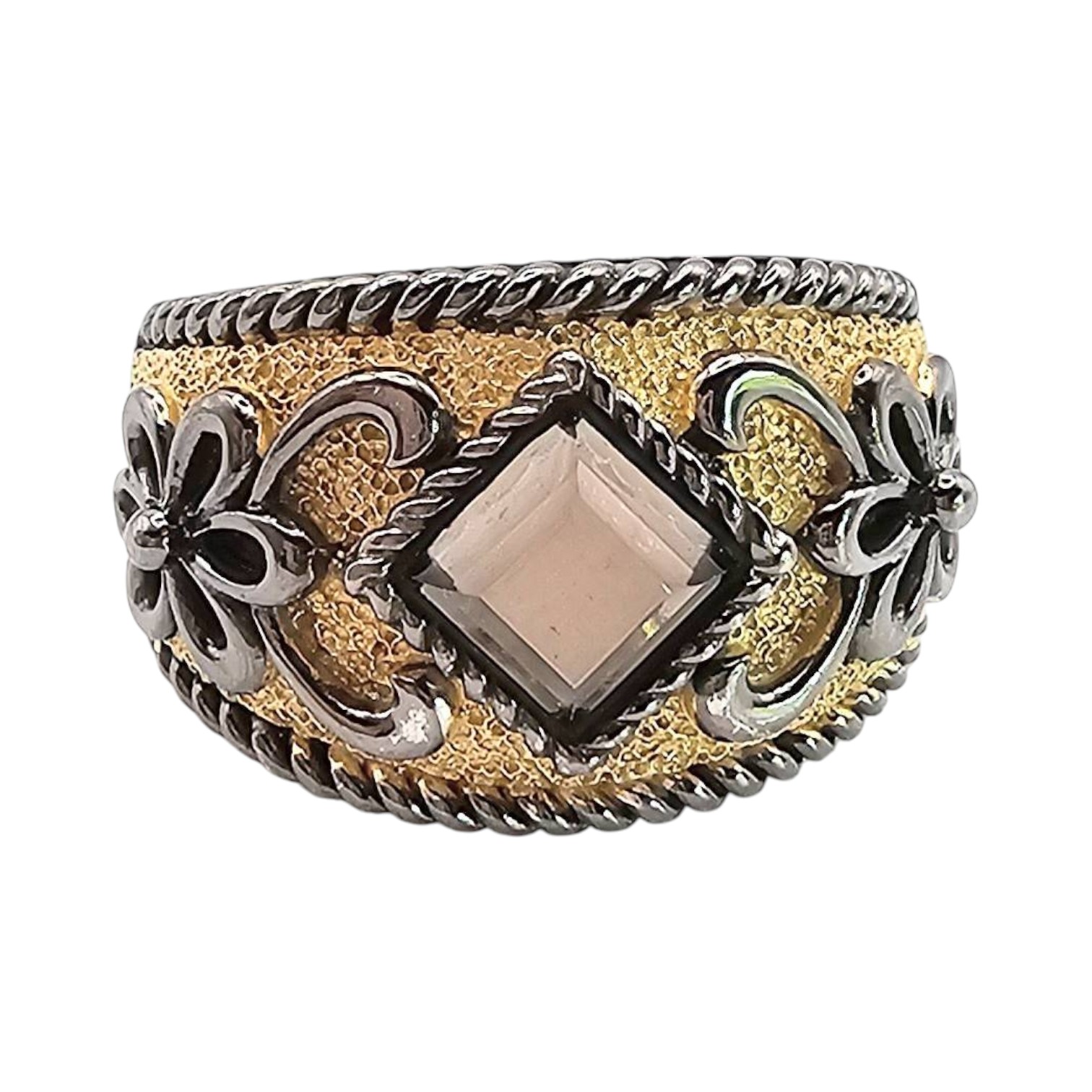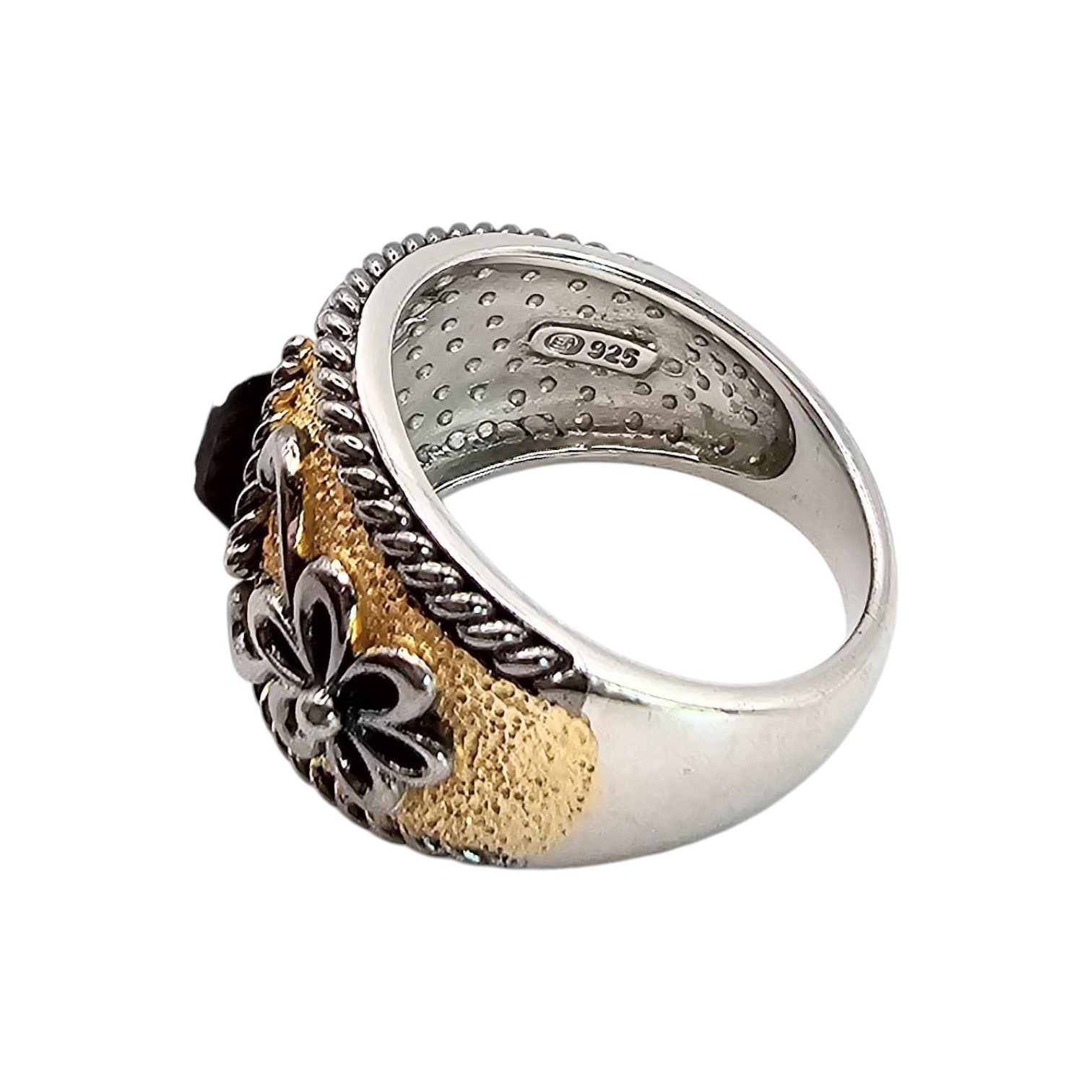 Sterling silver ring featuring a center smoky quartz gemstone in a square cut. The band showcases gold accents with floral and rope designs. Stamped ‘925’ for sterling silver. Ring size is 6.75, and the total weight is 6.6 grams.