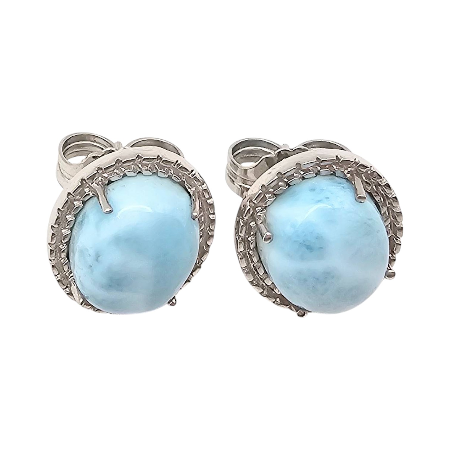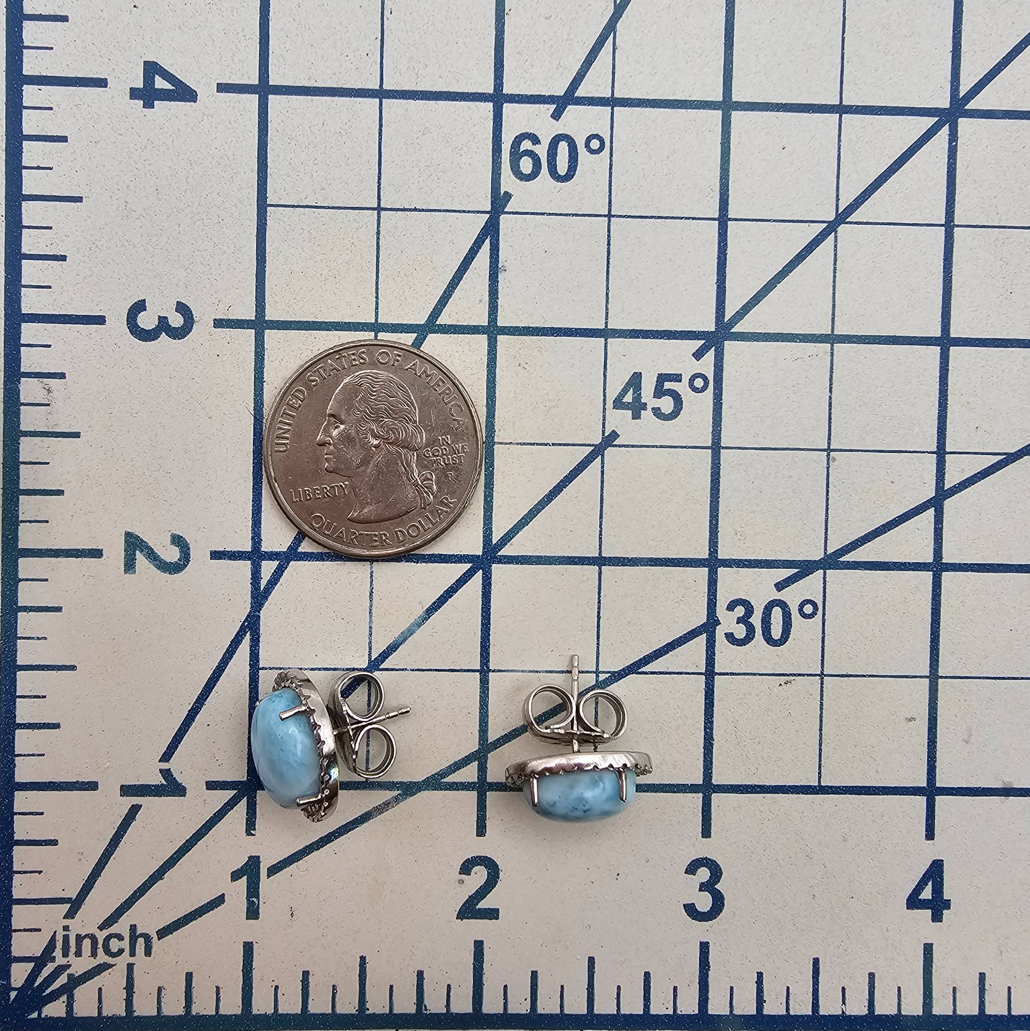 Oval-shaped earrings featuring larimar gemstones surrounded by a band of diamonds. Marked ‘IP21 UTC India’ on the backside, these earrings weigh 6.8 grams. They include clip-style fastenings for secure wear. The dimensions and scale are shown with a ruler and quarter for size reference.