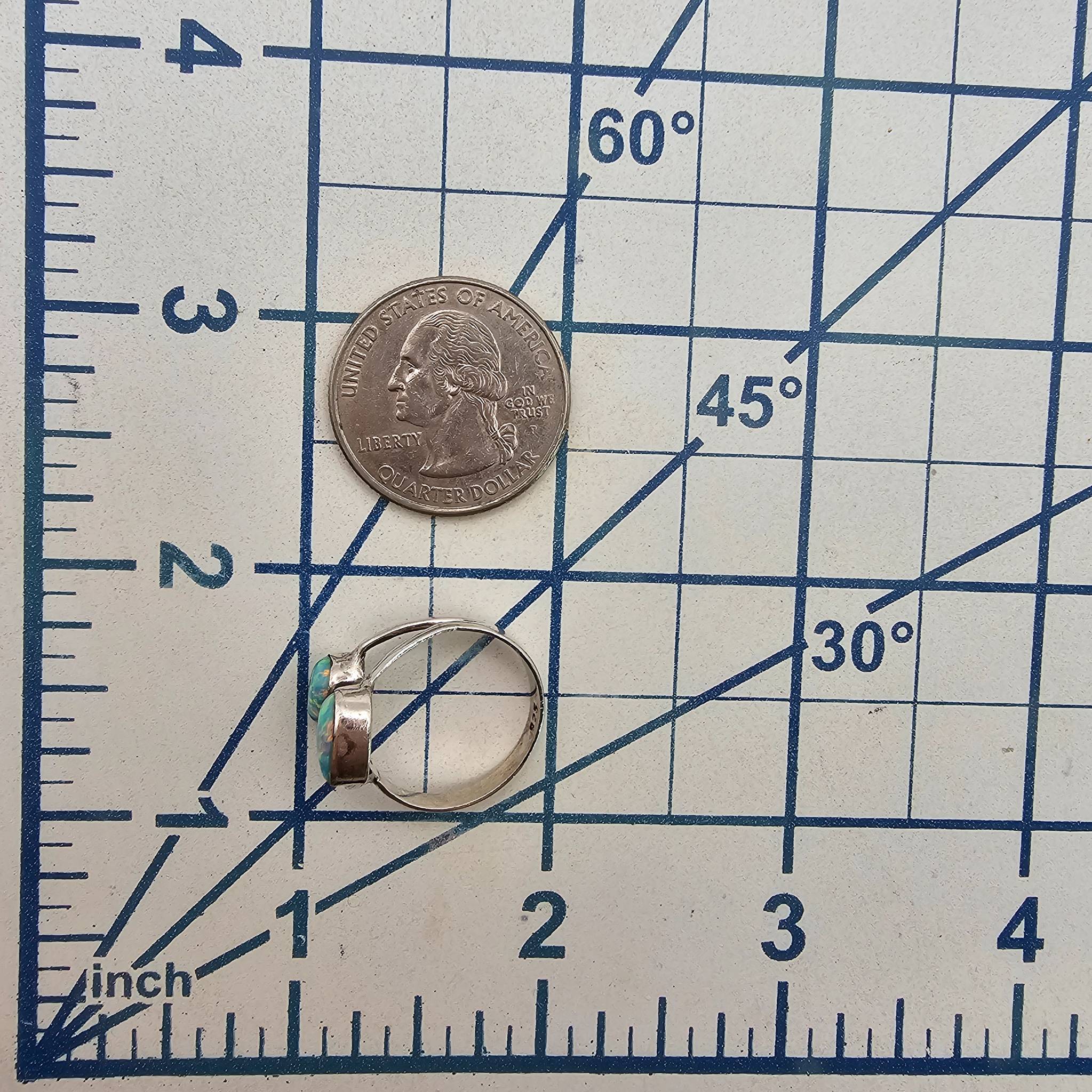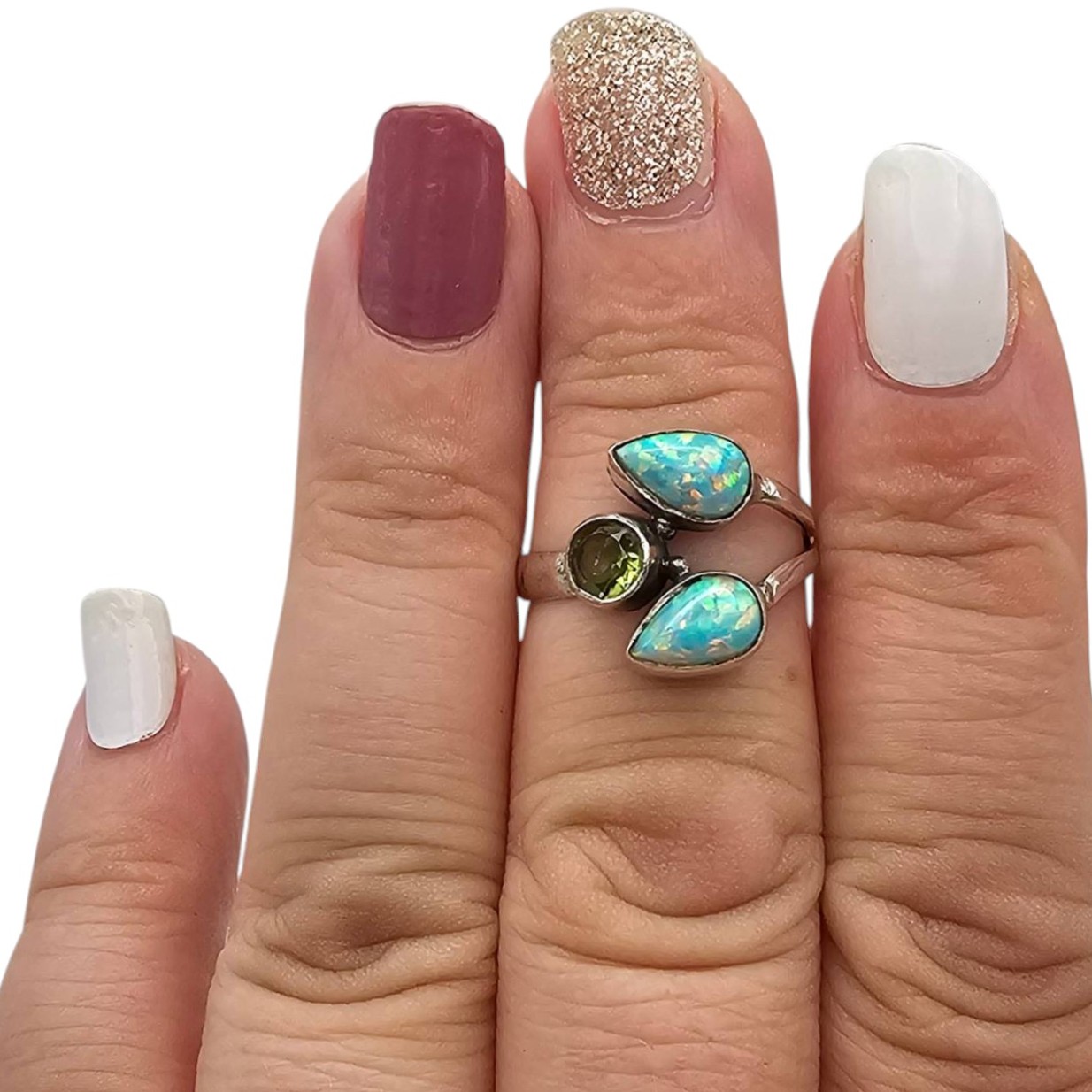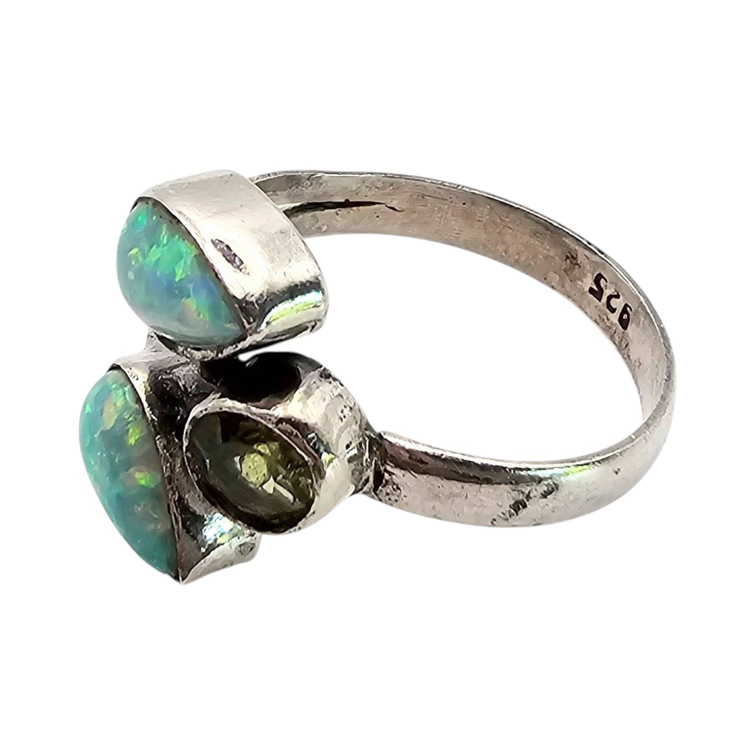 Sterling silver ring featuring two pear-shaped opal gemstones and one round-cut peridot gemstone. Marked 925 for sterling silver composition. The ring is size 7 and weighs 2.2 grams. Includes vibrant opals with iridescent colors and a green peridot stone for a striking design.