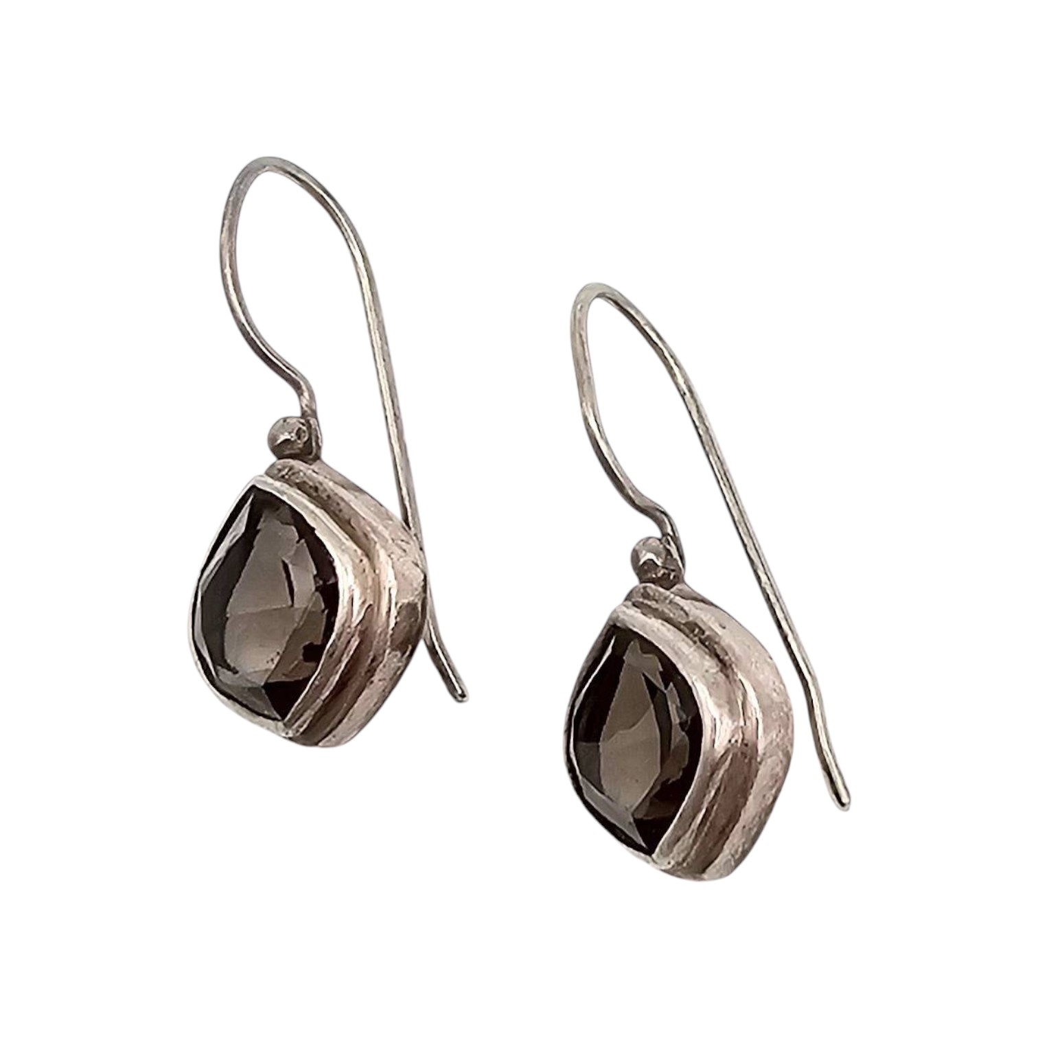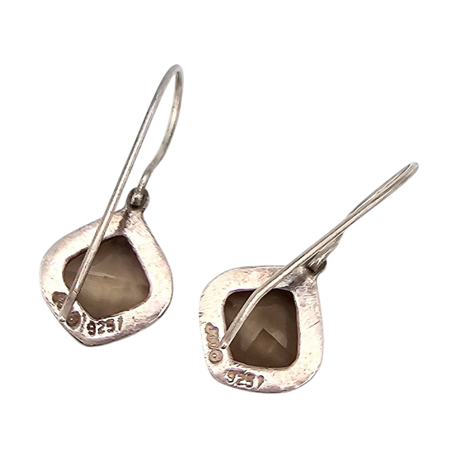 Signed sterling silver earrings featuring smoky quartz stones. Each earring has a bezel-set faceted smoky quartz gem in a modern design. Both earrings have a hook fastening and are stamped 925 on the back. Total weight is 4.5g.