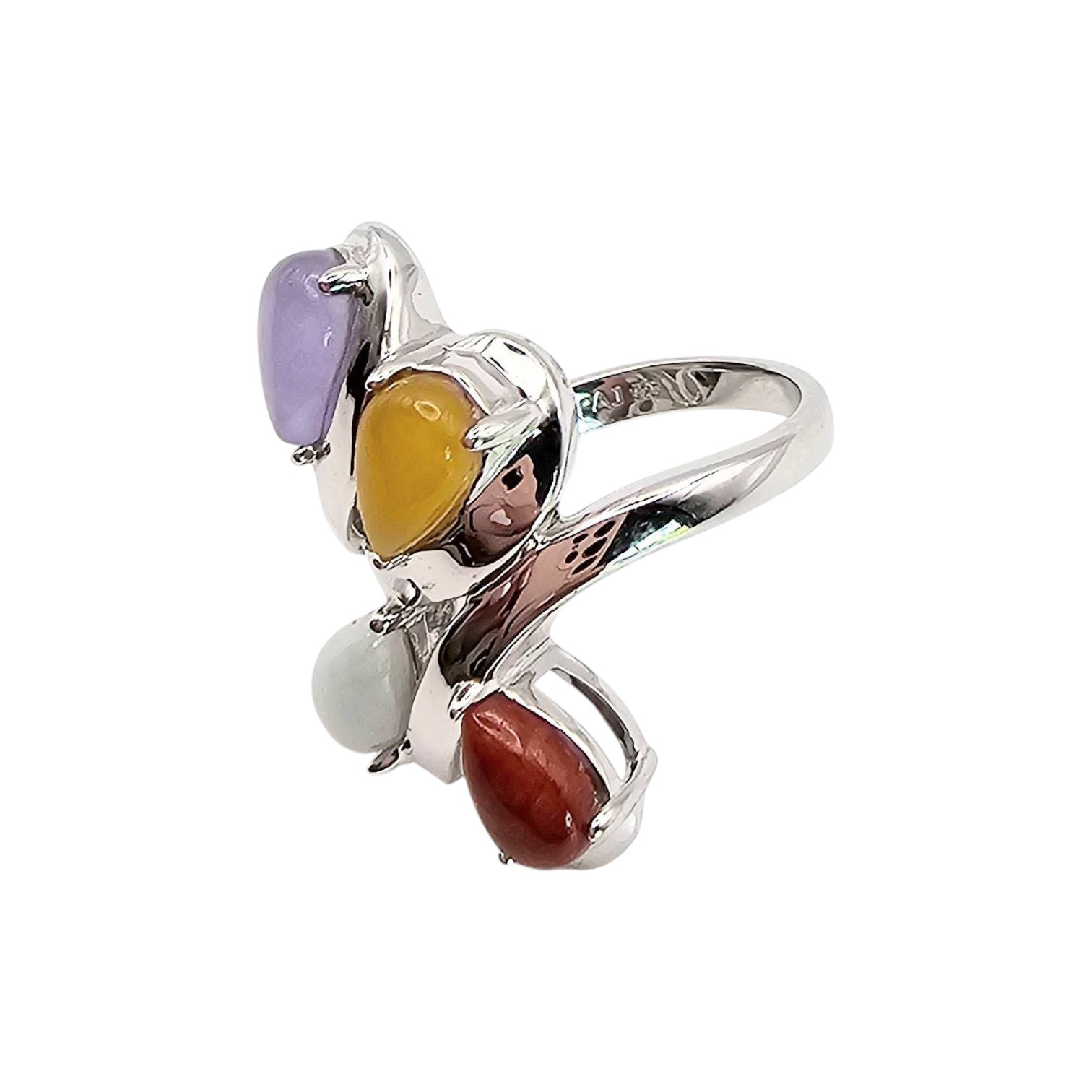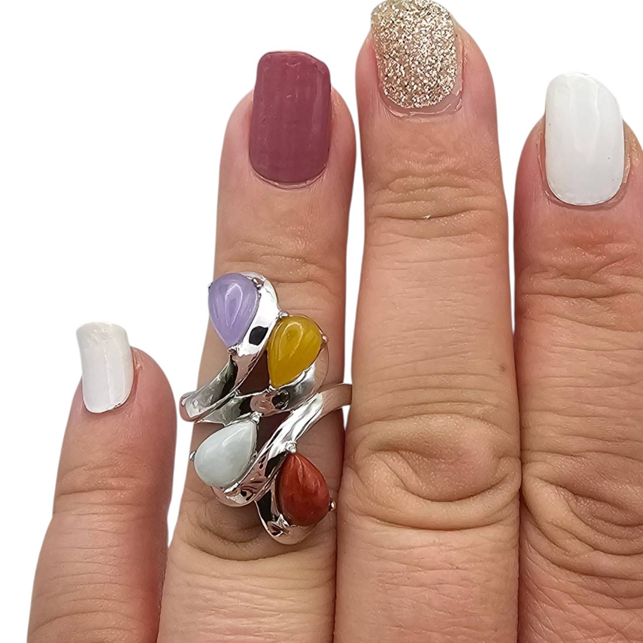 Sterling silver ring by PAJ Joy featuring four pear-shaped multicolored jade stones in hues of purple, yellow, green, and red. The ring is stamped ‘925’ and has a polished finish, weighing 6.4 grams. Designed to fit size 7.5. Elegant and colorful design suitable for various occasions.