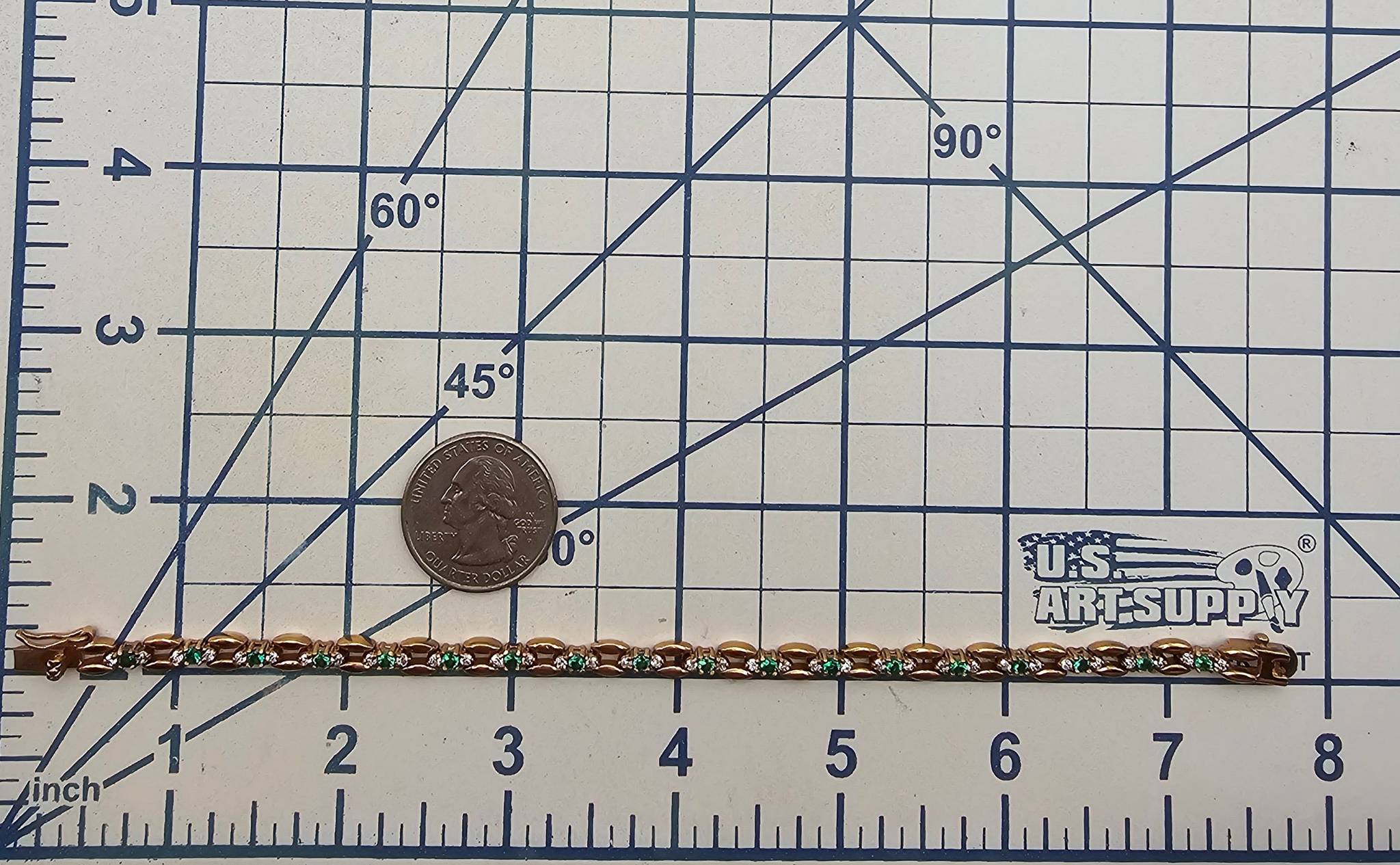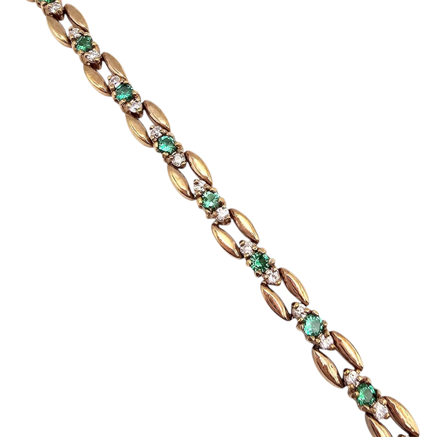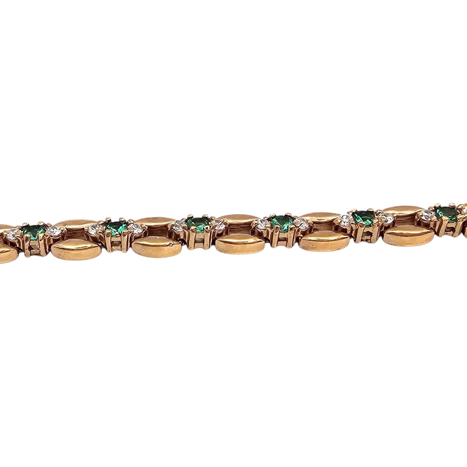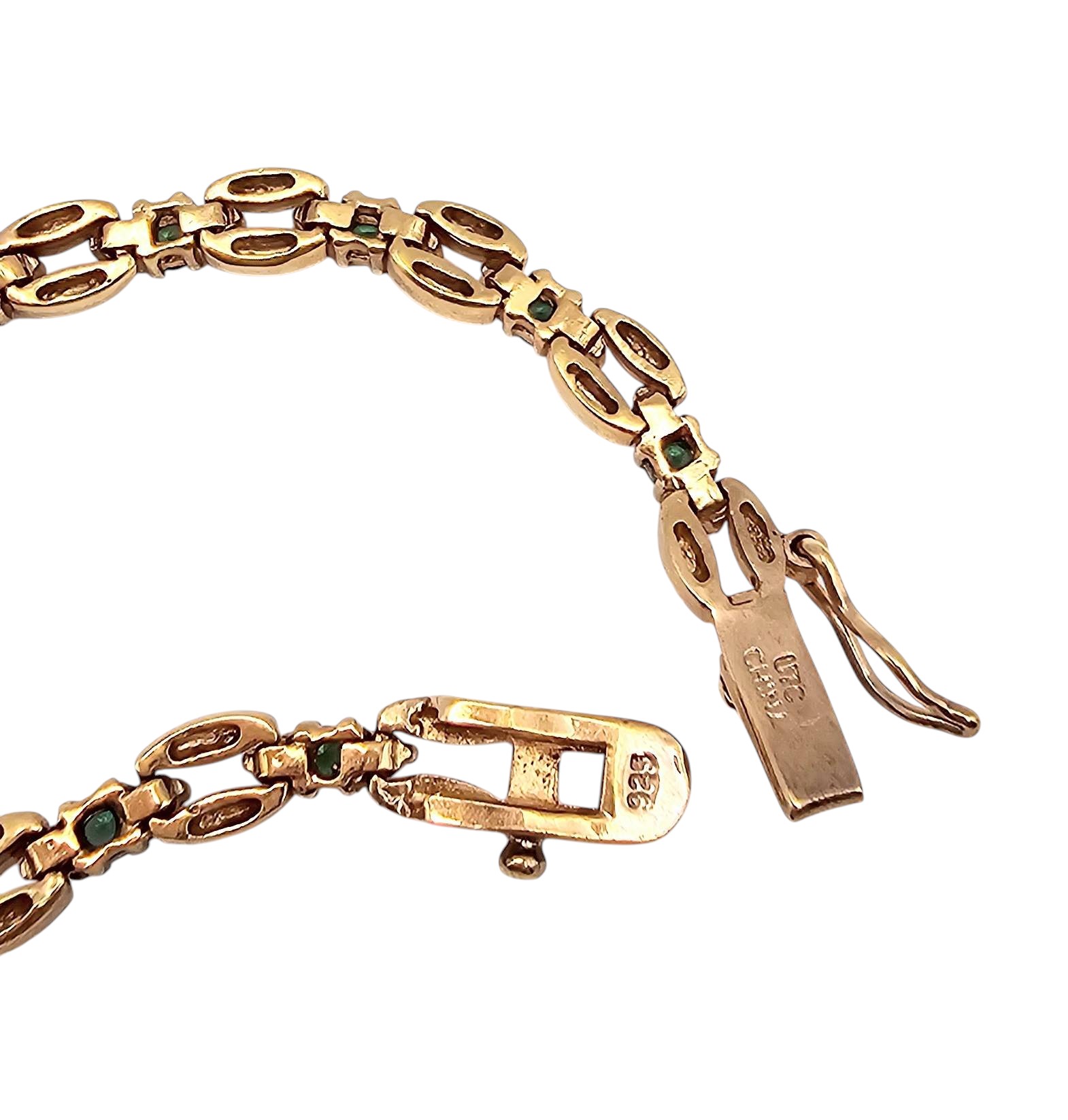 UTC tennis bracelet crafted in sterling silver with a gold overlay. The bracelet is adorned with green chrysoprase stones and features an elegant link design. Weighing approximately 12.4 grams, it is secured with a clasp marked ‘925’.