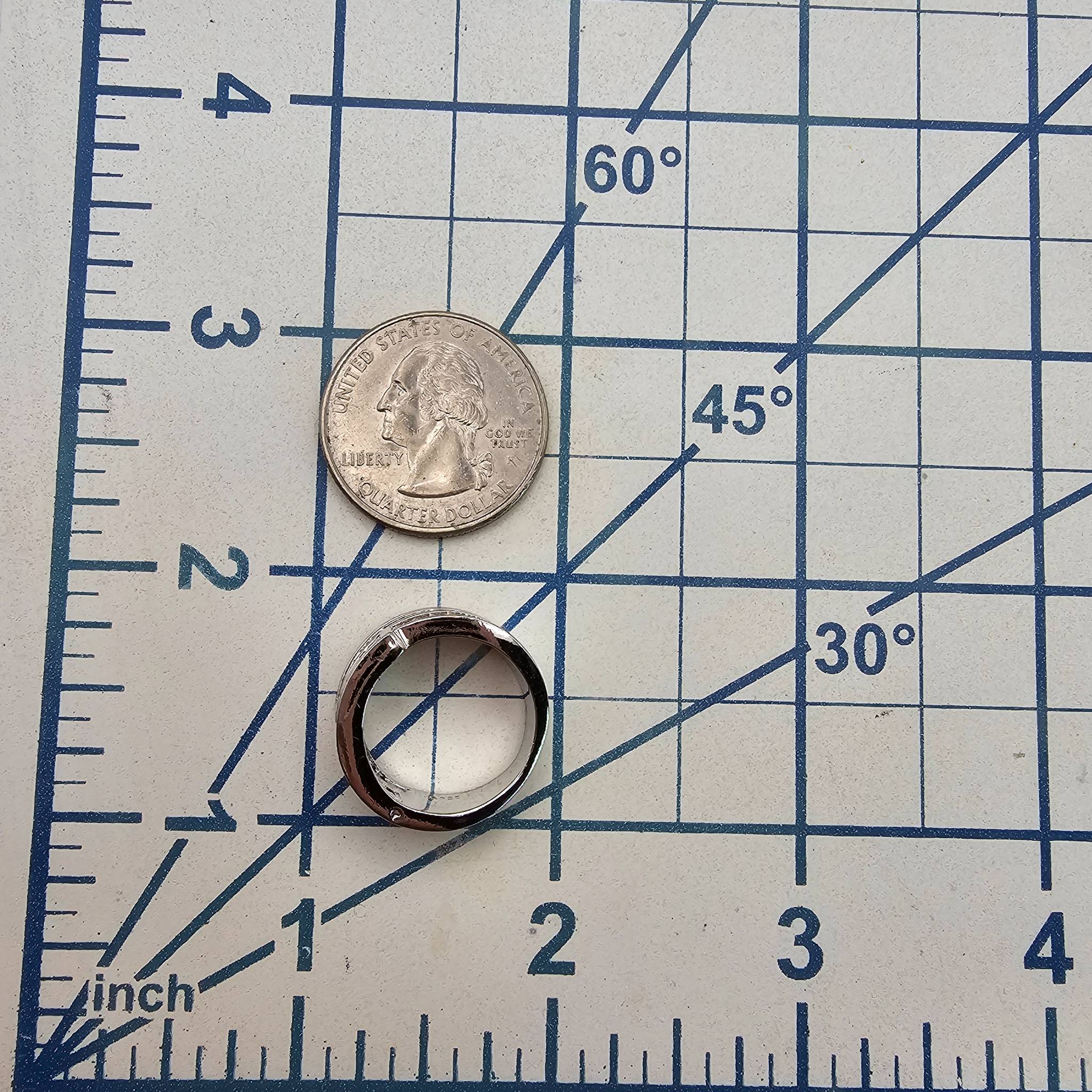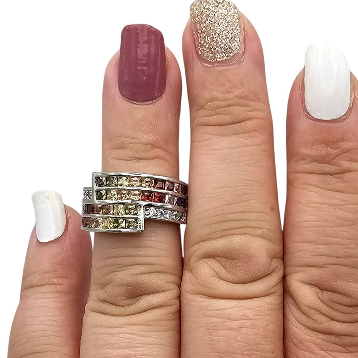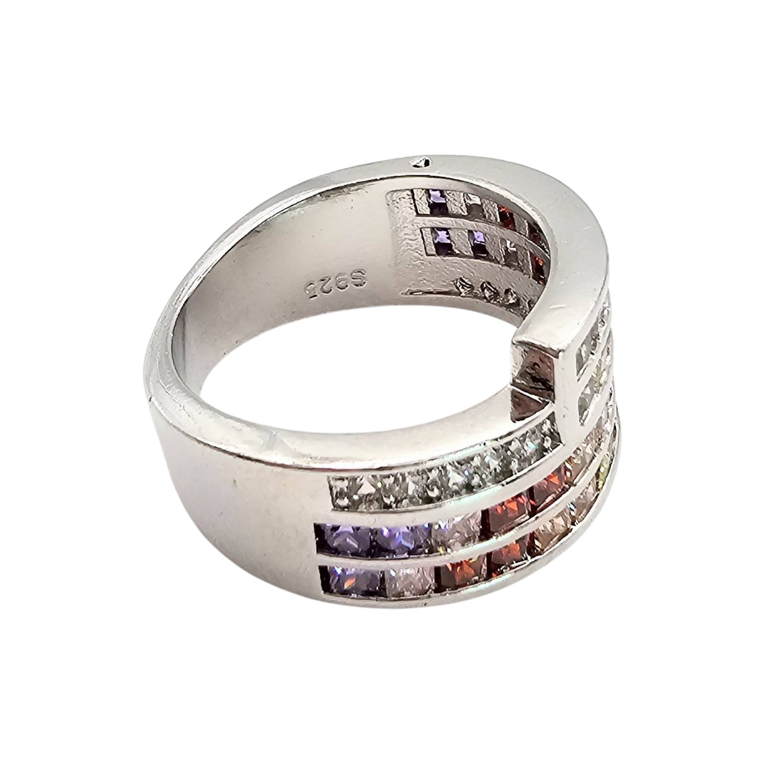 Sterling silver ring featuring a design with multi-color rhinestones. The ring is a size 5.5 and weighs 6 grams. Its band showcases a layered geometric pattern and colorful rhinestones arranged in segments, ensuring vibrant visual appeal.