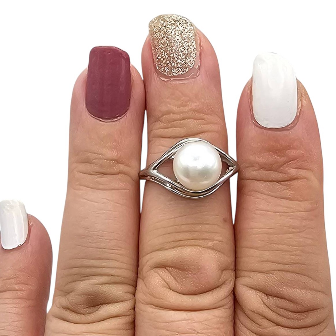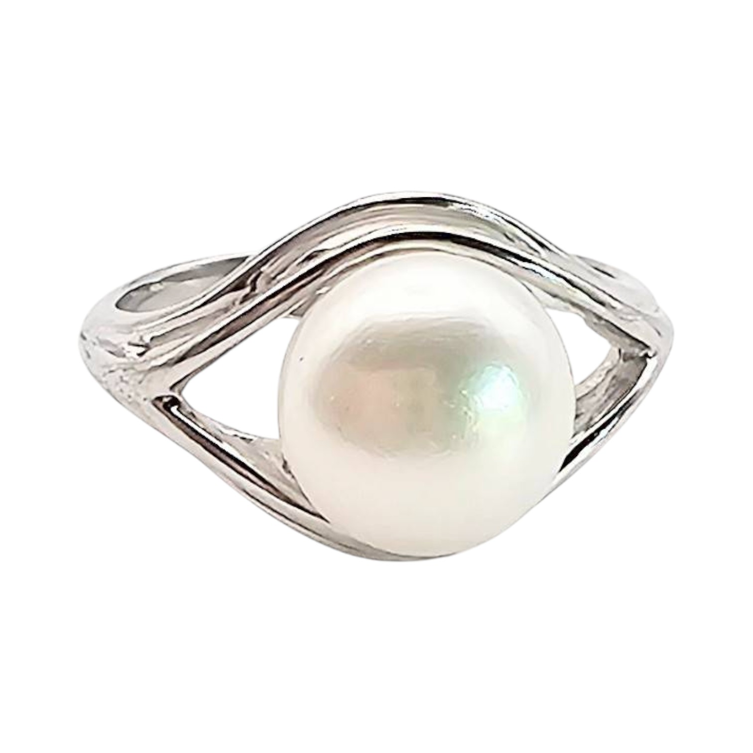 Sterling silver ring marked ‘IPE 925,’ featuring a luminous white pearl in a unique open band design. The ring is sized at 6.5 and weighs approximately 3.2 grams. A classic and elegant piece of jewelry suitable for various occasions.