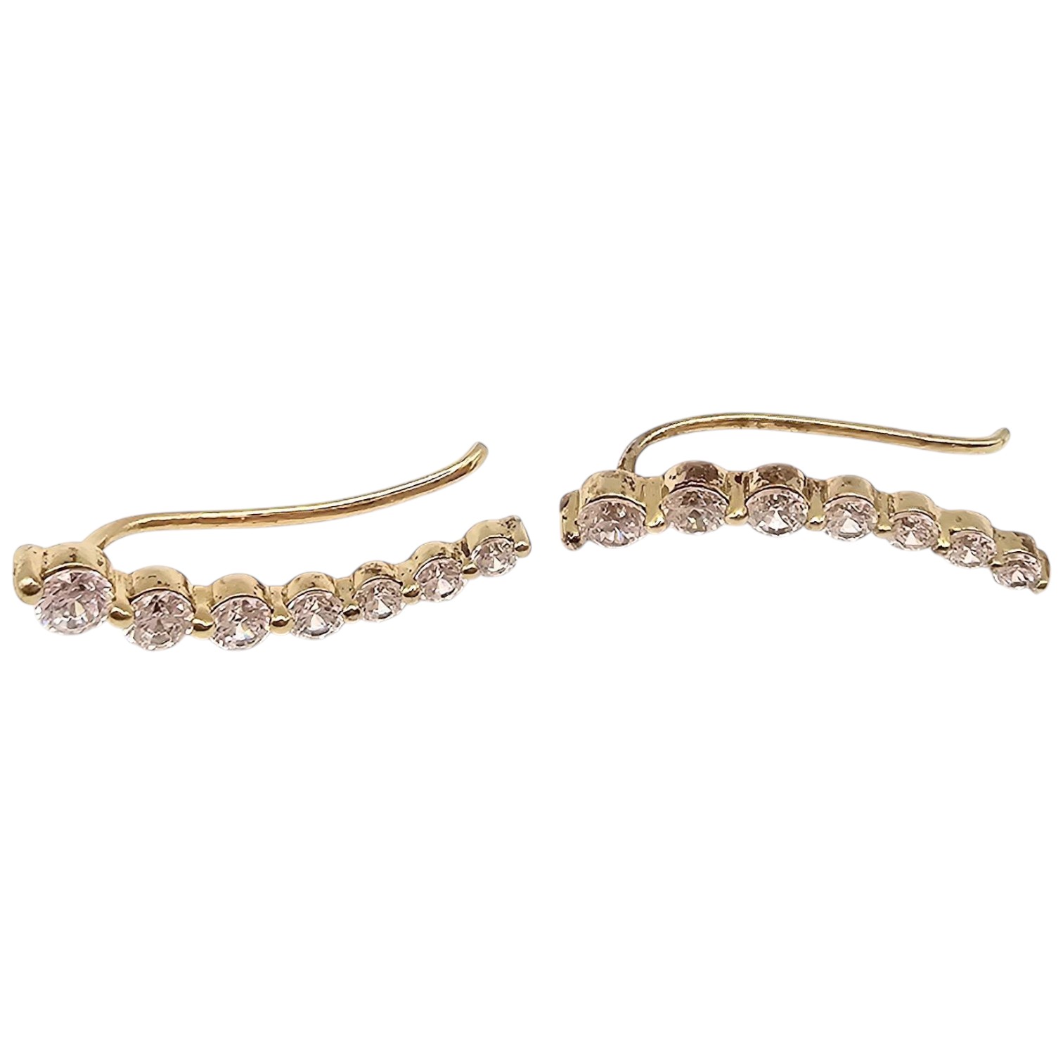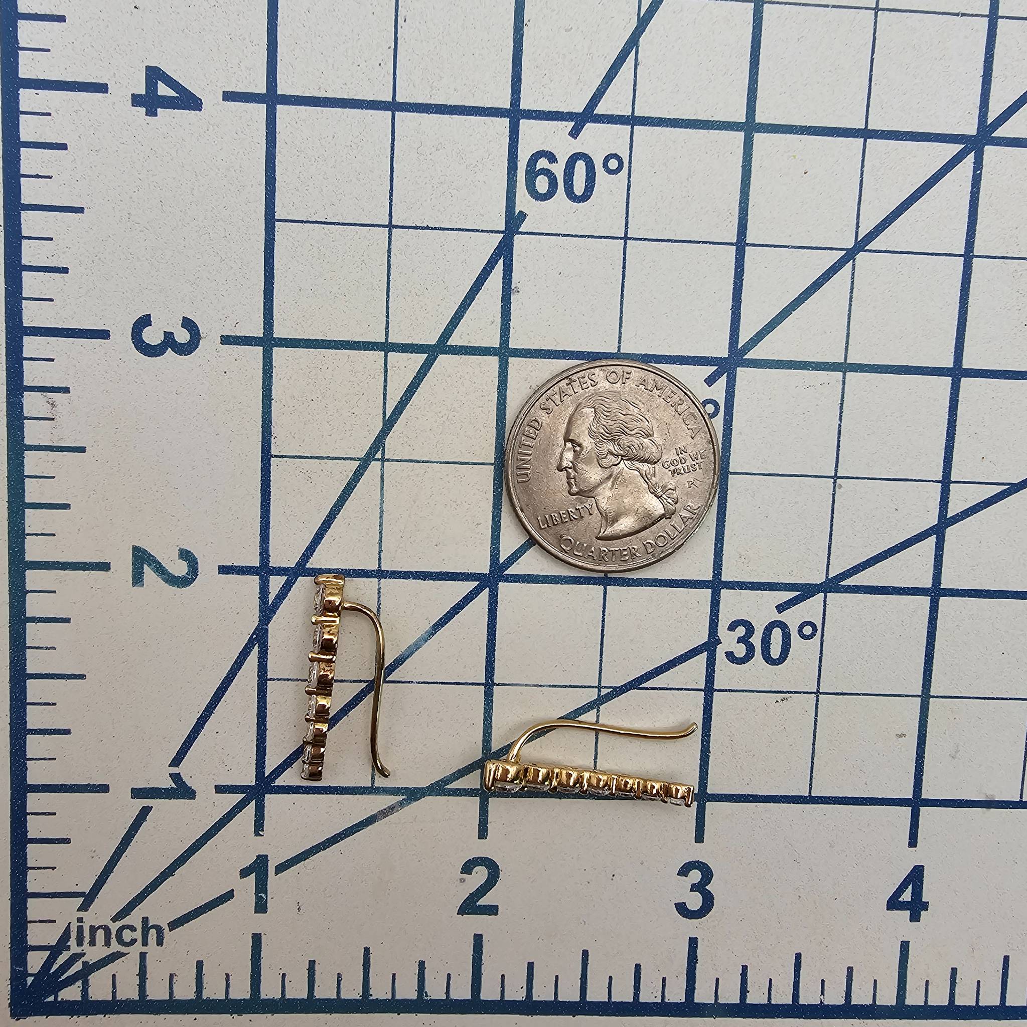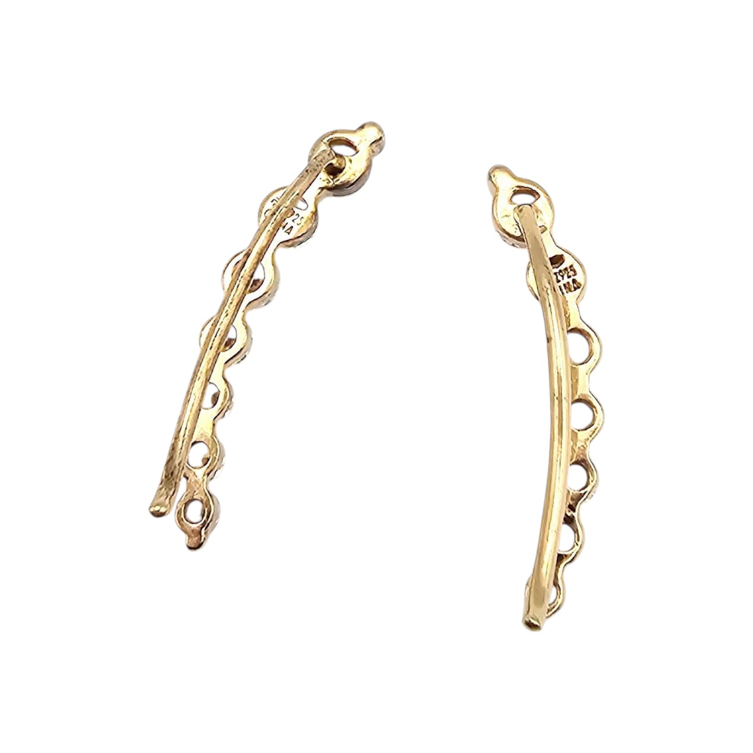 Gold-over sterling silver earrings by FE, adorned with cubic zirconia stones. Each earring weighs approximately 2.3 grams, showcasing a curved design and secure closure. Stamped ‘925’ for sterling silver authenticity. Perfect for adding elegance to various occasions.