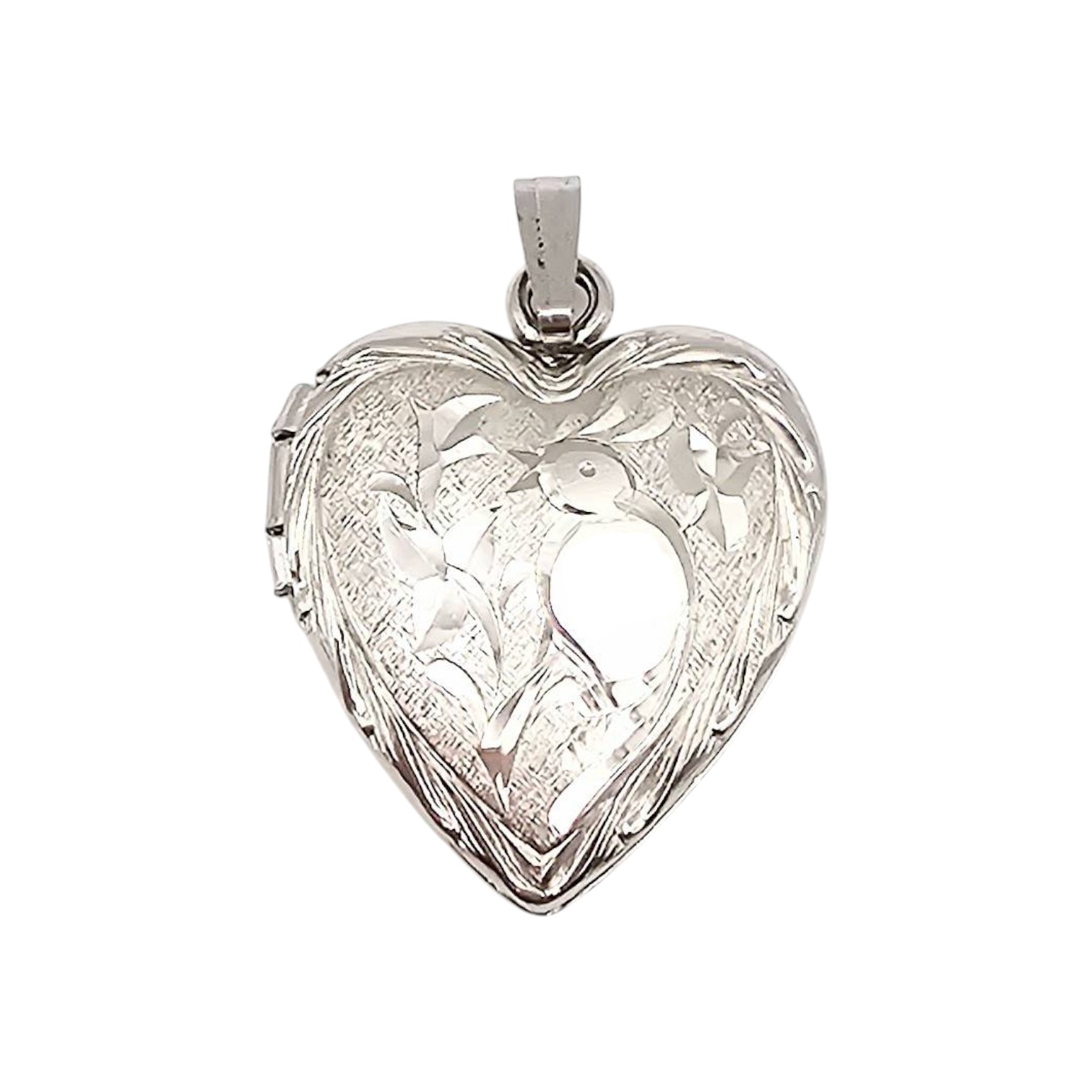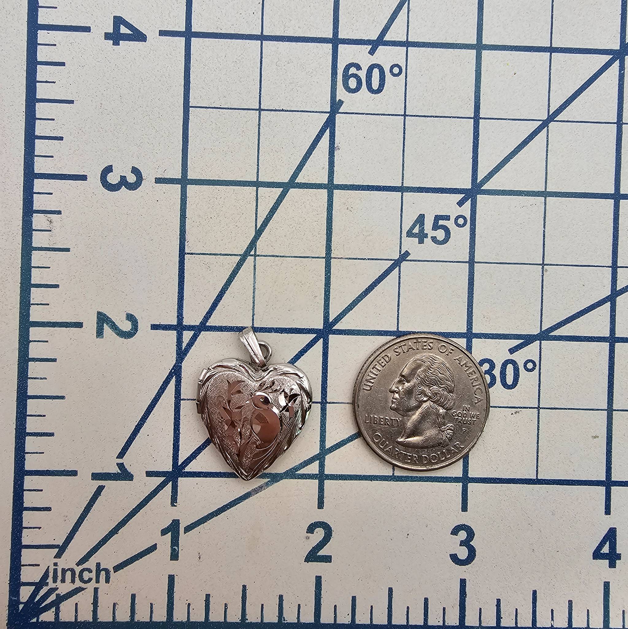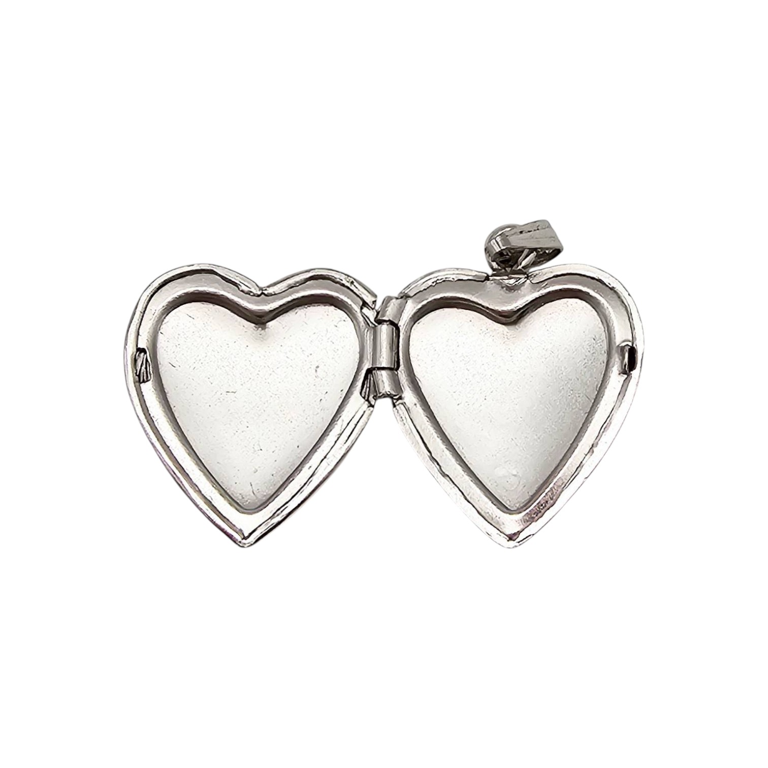 Sterling silver heart-shaped locket pendant, marked with 925 for sterling silver authenticity. Features an elegant engraved motif on the exterior. Fully functional hinge and clasp allow it to open and reveal two interior photo slots. Weighs approximately 3.5 grams. The locket measures approximately 1 inch in height. Signed for authenticity.