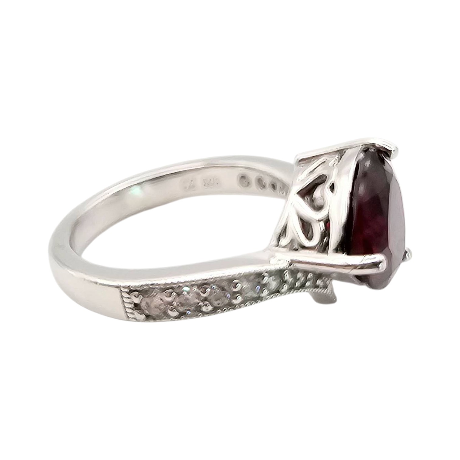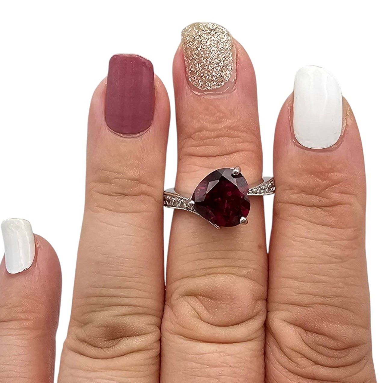 Vanna K ring crafted from sterling silver with a cubic zirconia centerpiece in a deep red hue. The band features intricate detailing along its shoulders, adding texture and elegance to the design. This ring is size 6 and weighs 5.2 grams. Stamped with ‘CZ’ and ‘925’ to indicate authenticity.