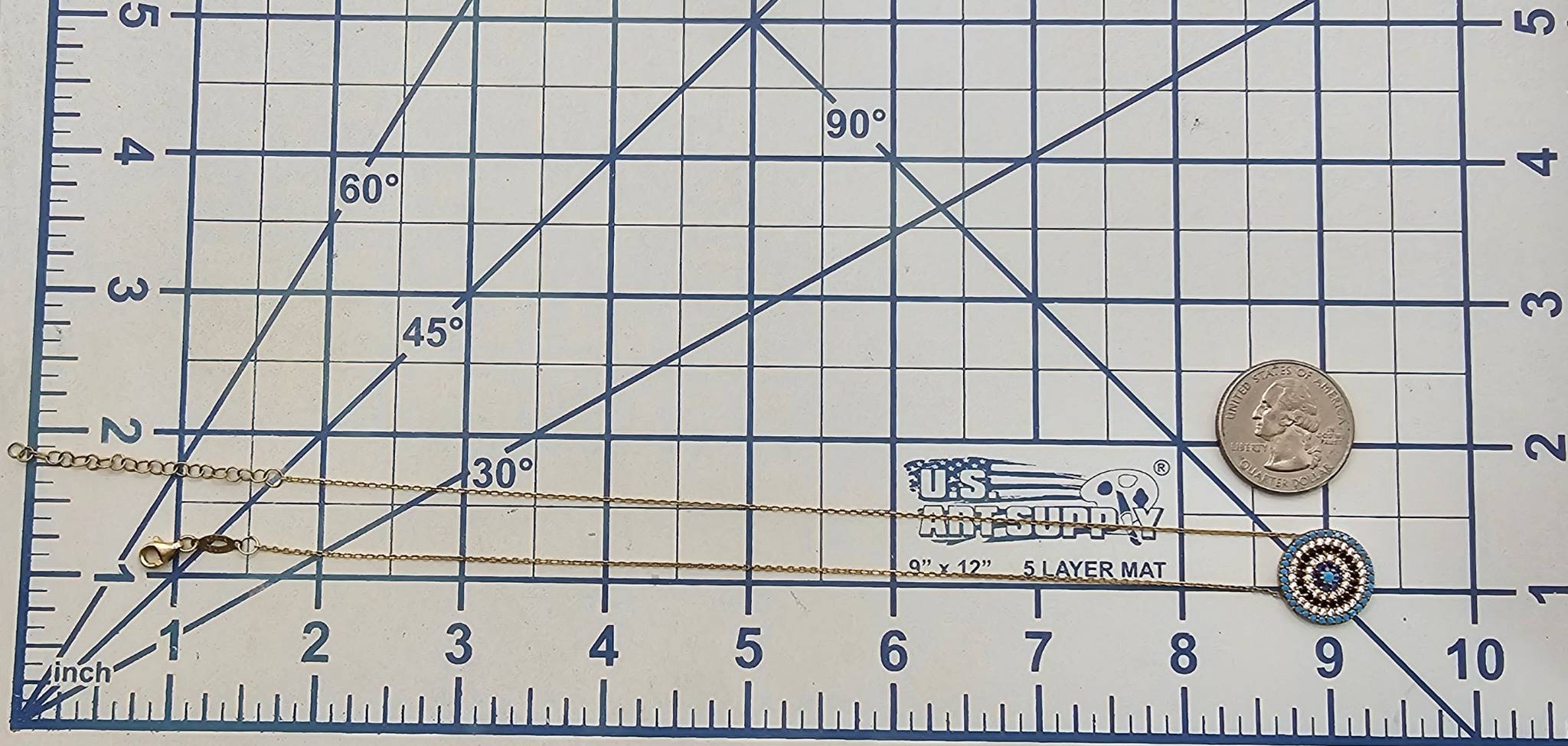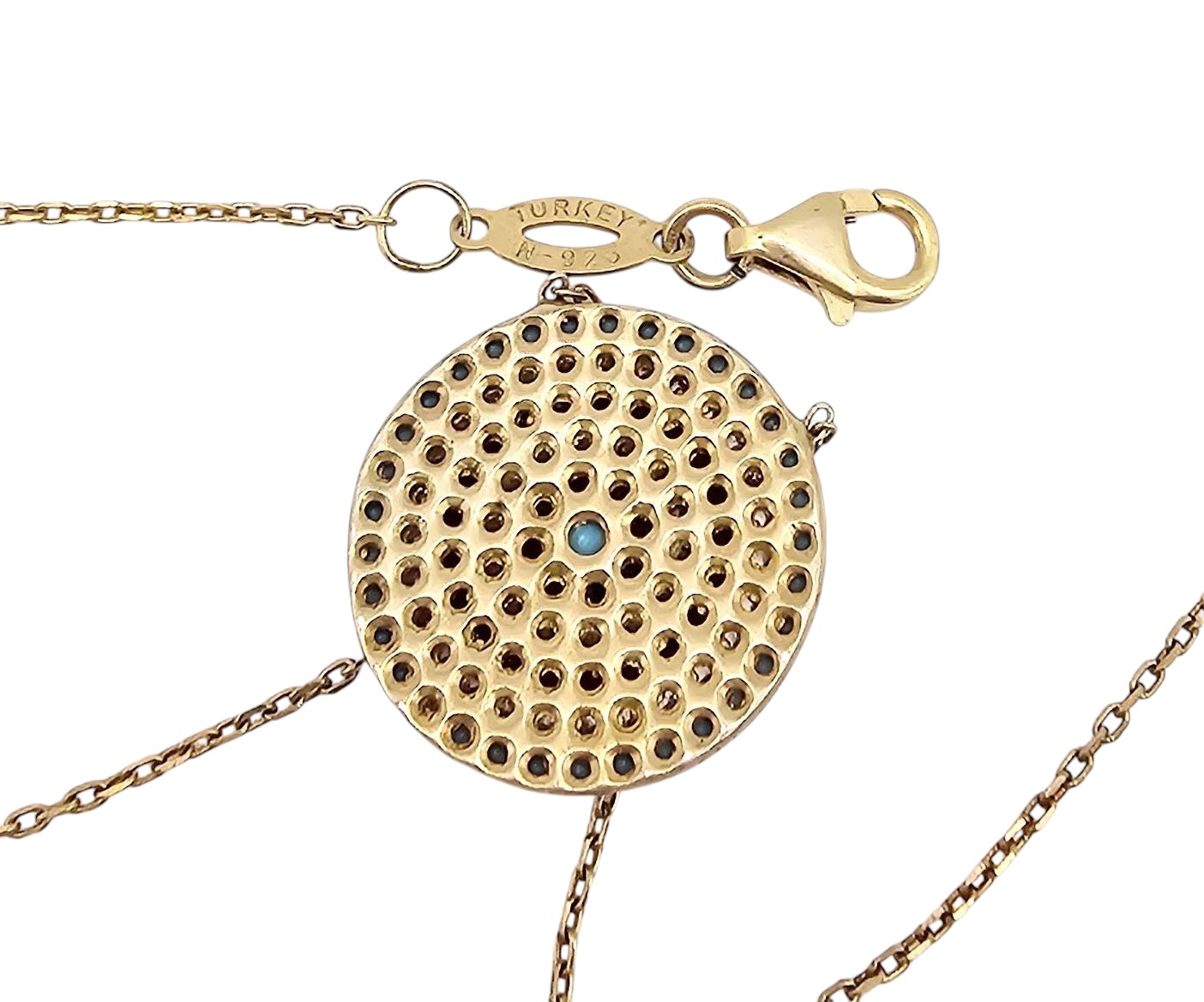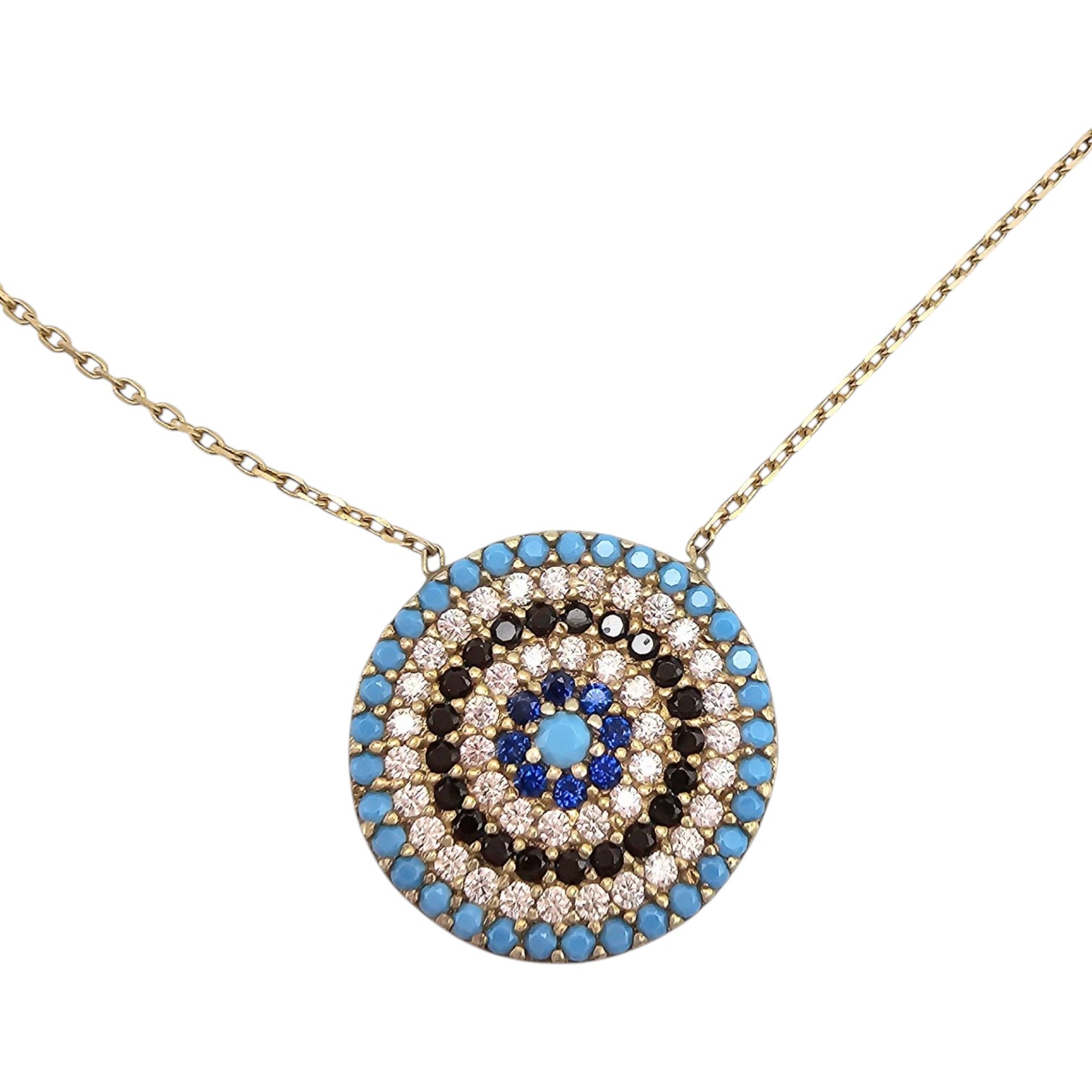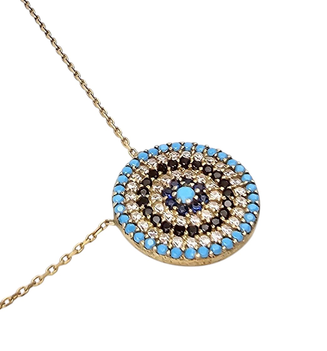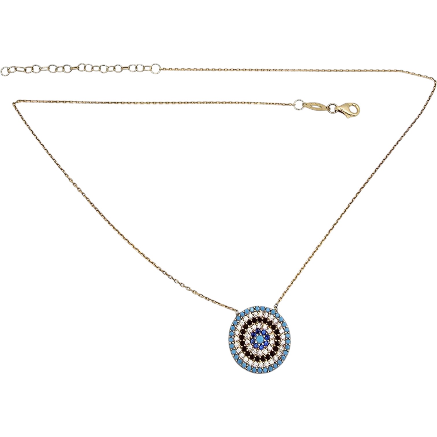 Gold over sterling silver necklace featuring a circular blue eye pendant, adorned with blue, black, and clear stones in a concentric design. Marked ‘Turkey’ and ‘925’ on the clasp, indicating its silver purity. Total weight is 3.8 grams. Measures approximately 16-18 inches, with a small extender for adjustable fit. Fine craftsmanship with intricate detailing on the pendant’s reverse side.