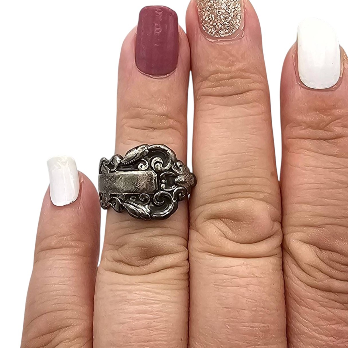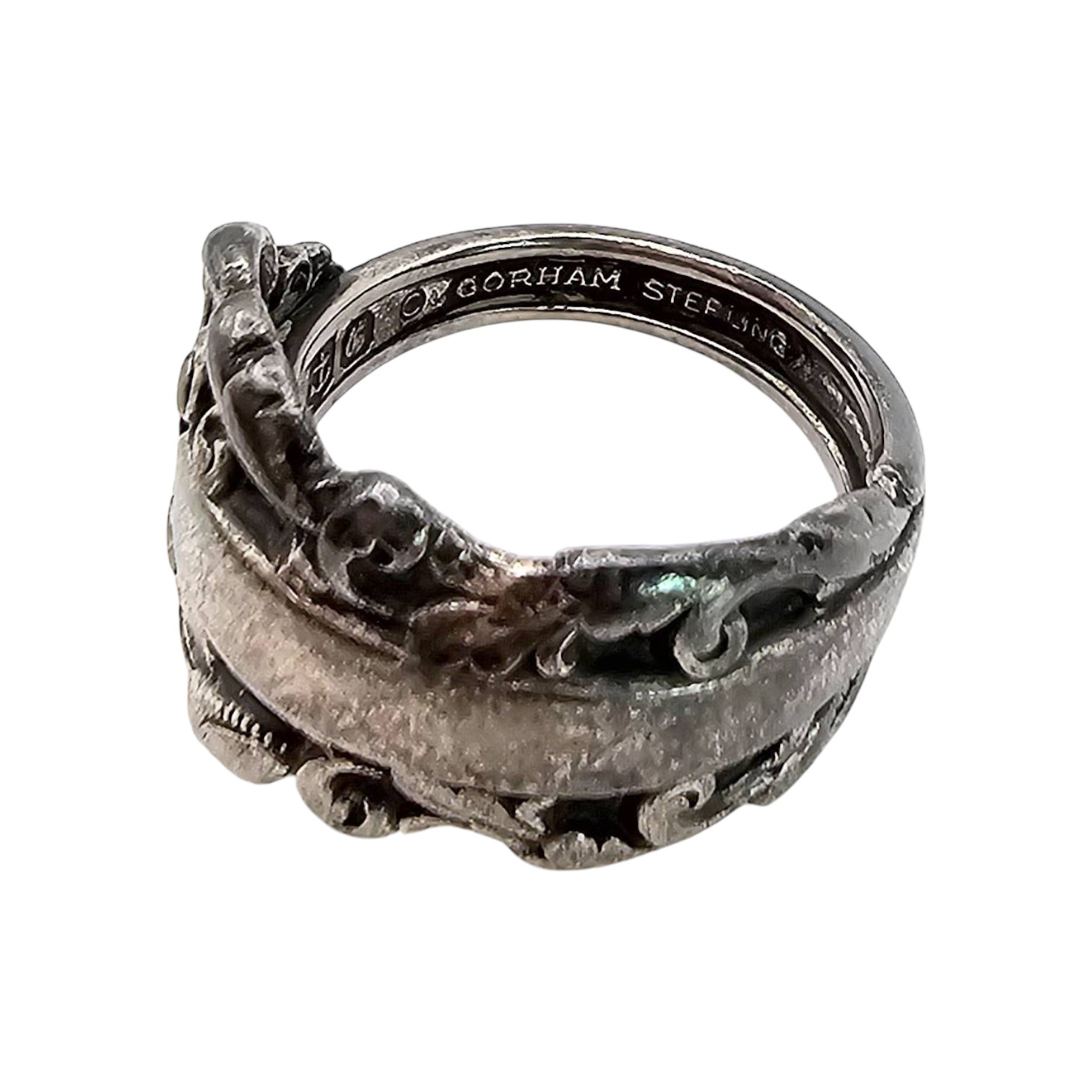 Sterling silver spoon ring crafted by Gorham, featuring an ornate design with embossed details. Markings inside the band include ‘GORHAM STERLING.’ Ring size is 5.25, and it weighs 7.2 grams. Well-preserved, showcasing the craftsmanship typical of Gorham silverware adaptations.