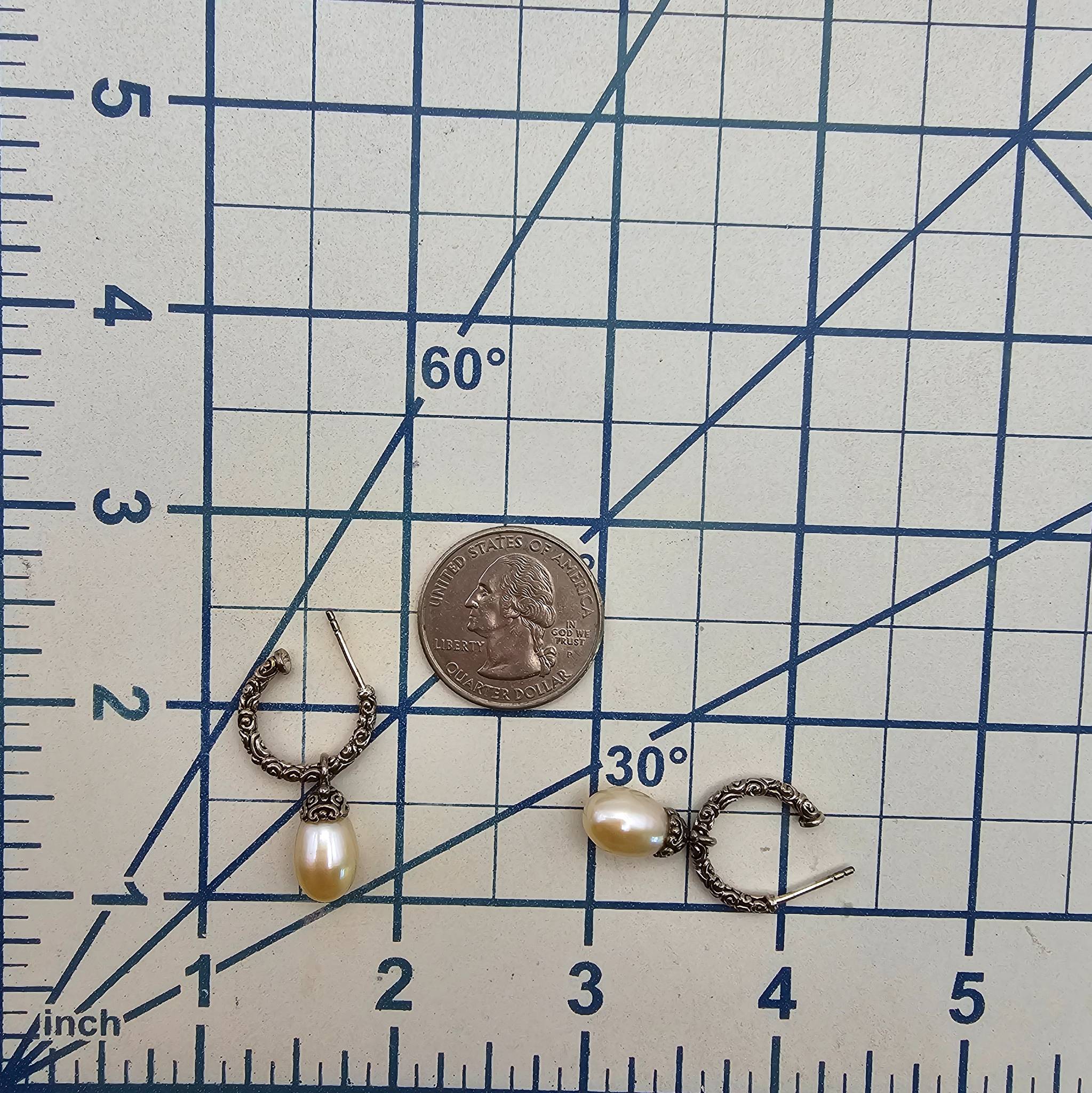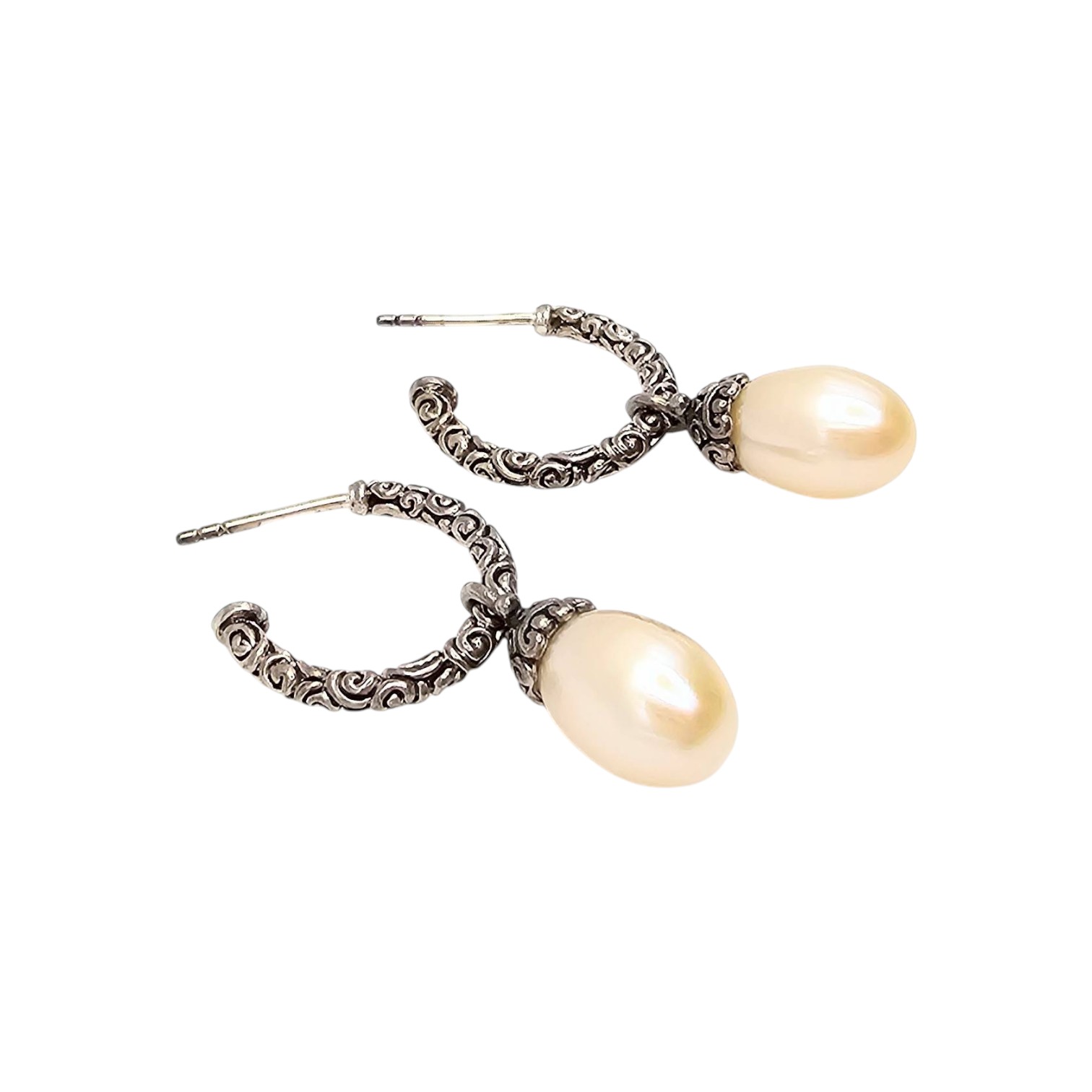 Sterling silver hoop earrings featuring ornate detailing and hanging freshwater pearls. Combined weight is 6.4g. Earrings are approximately 1 inch long, as shown with a coin for scale. The design combines classic elements with intricate detailing.