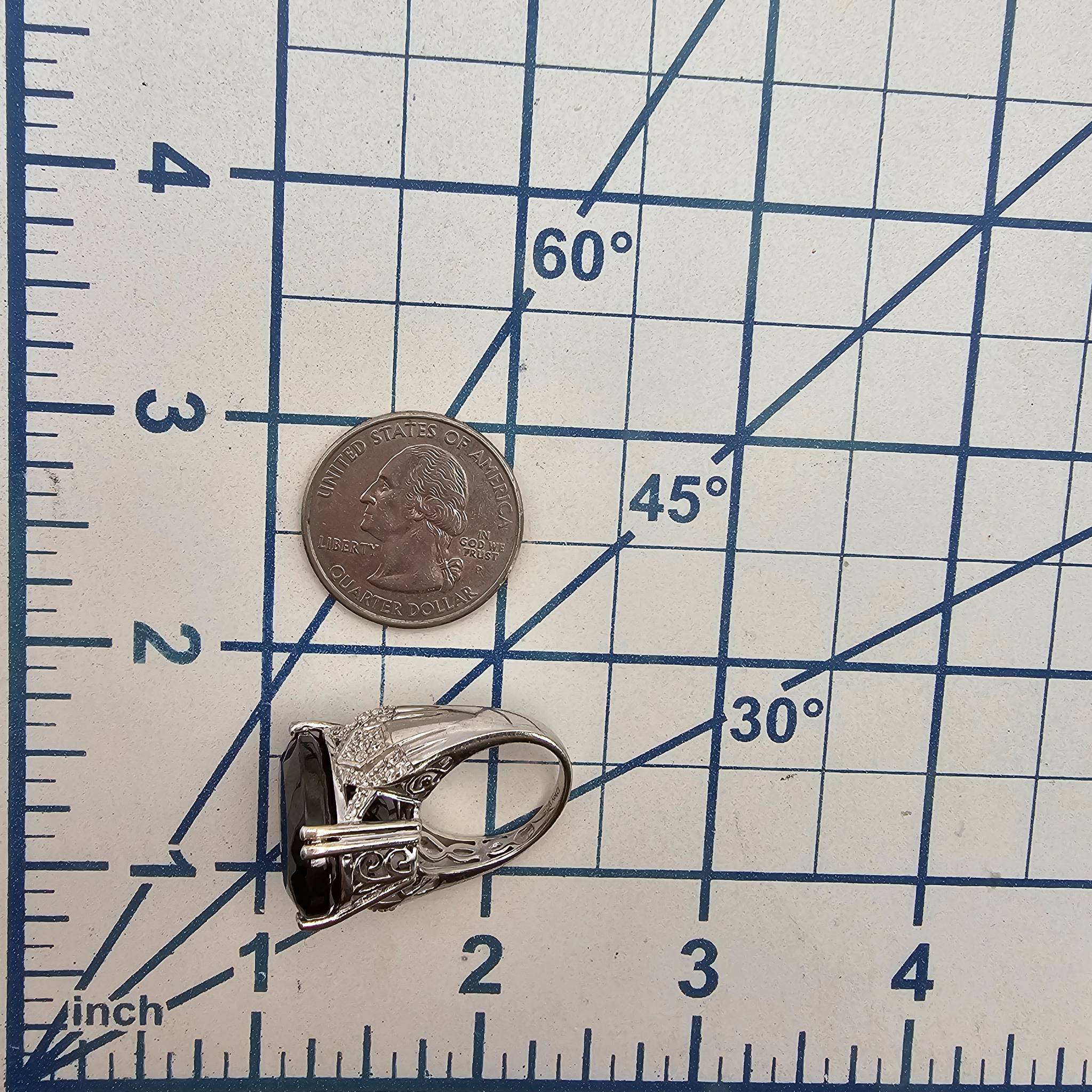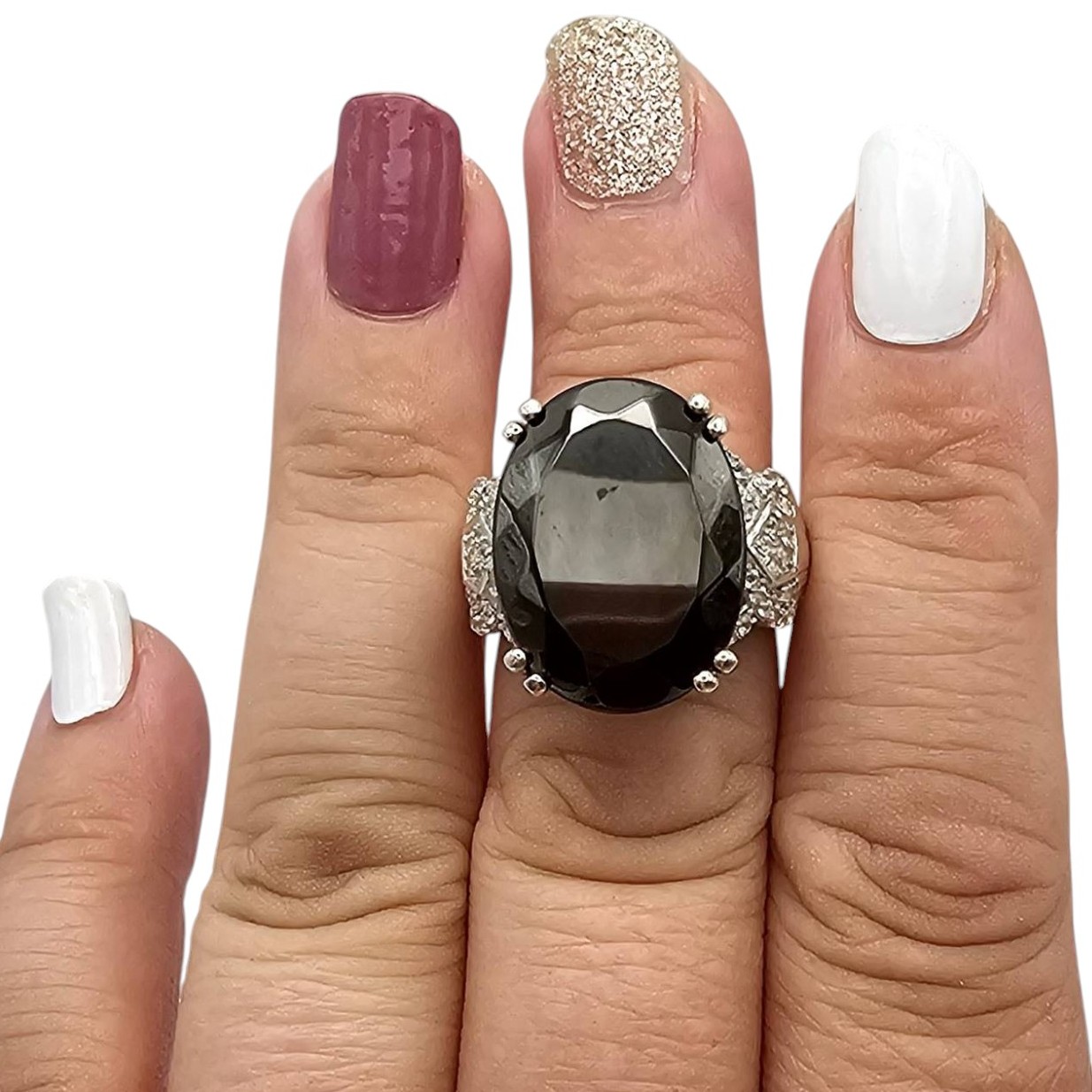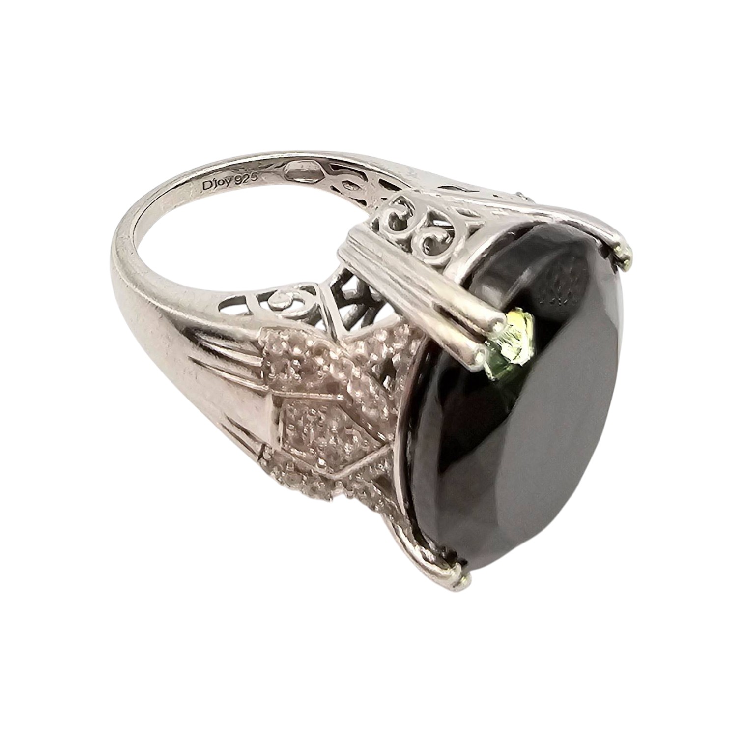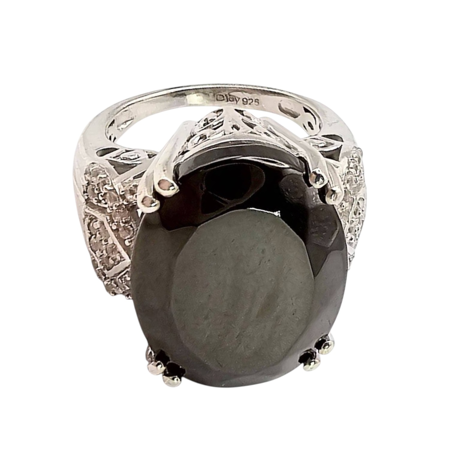D’Joy metallic stone sterling silver ring, featuring a large faceted black stone as the centerpiece. The ring is intricately designed with detailed patterns on the band. It weighs 10 grams and comes in a size 6.5. The ring is stamped “925,” indicating sterling silver. Refer to the images for size comparison and detailed views.