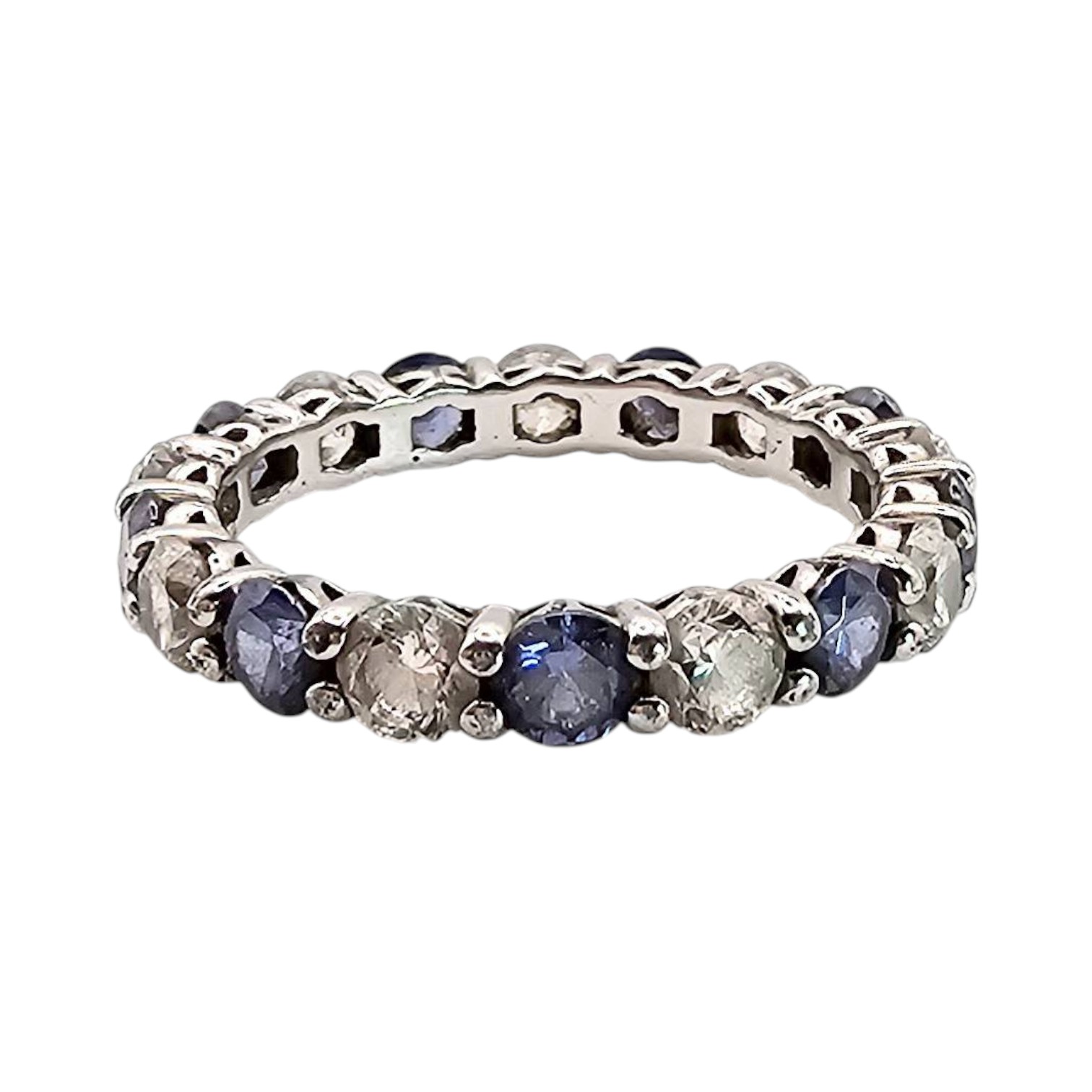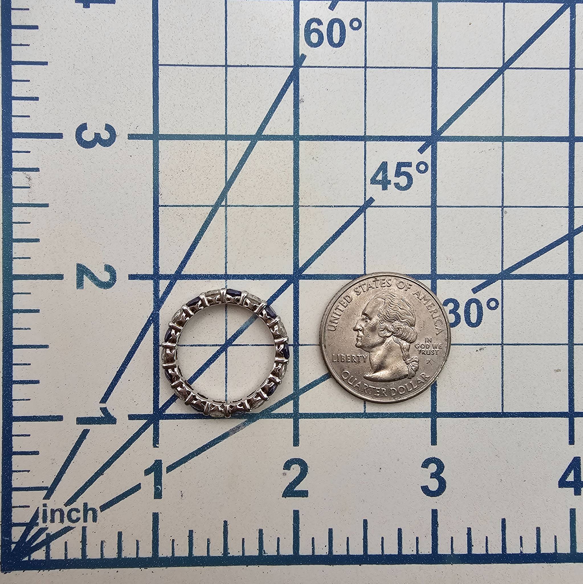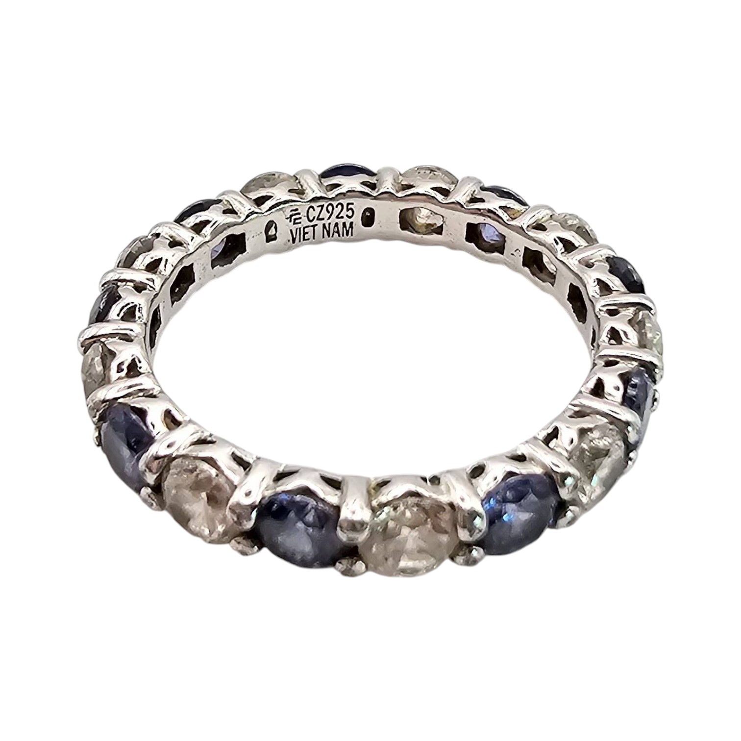 Sterling silver eternity band featuring alternating blue and clear cubic zirconia stones in a delicate setting. Marked ‘925’ and produced in Vietnam. The ring weighs 2.8 grams and has a size of approximately 7, as indicated. Elegant craftsmanship with a full-circle stone design.
