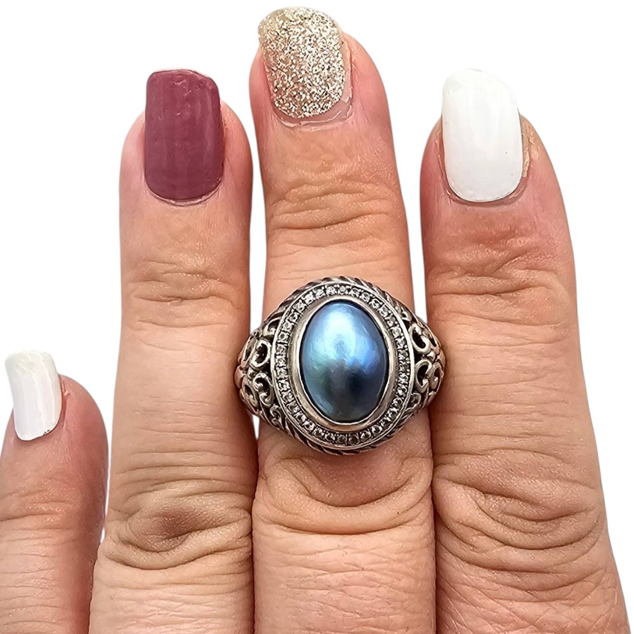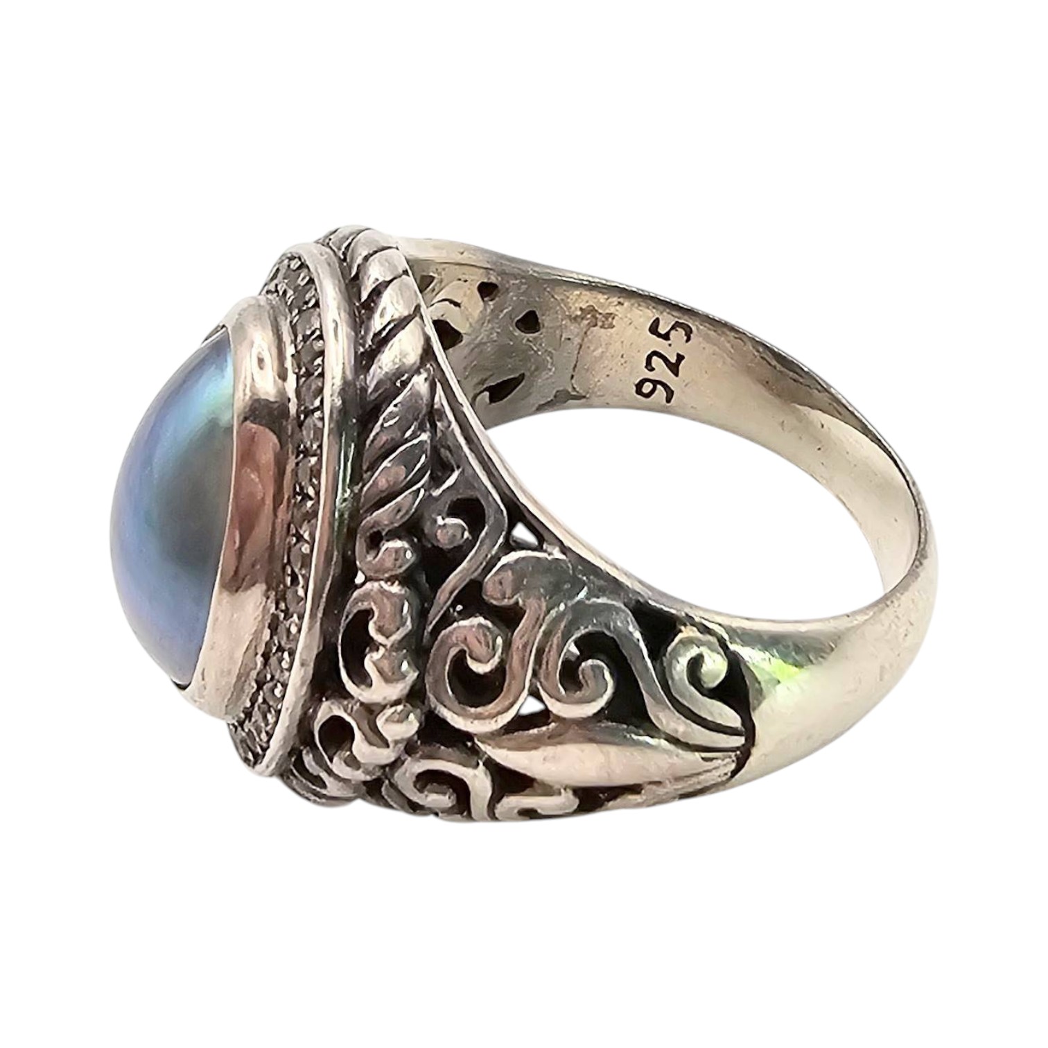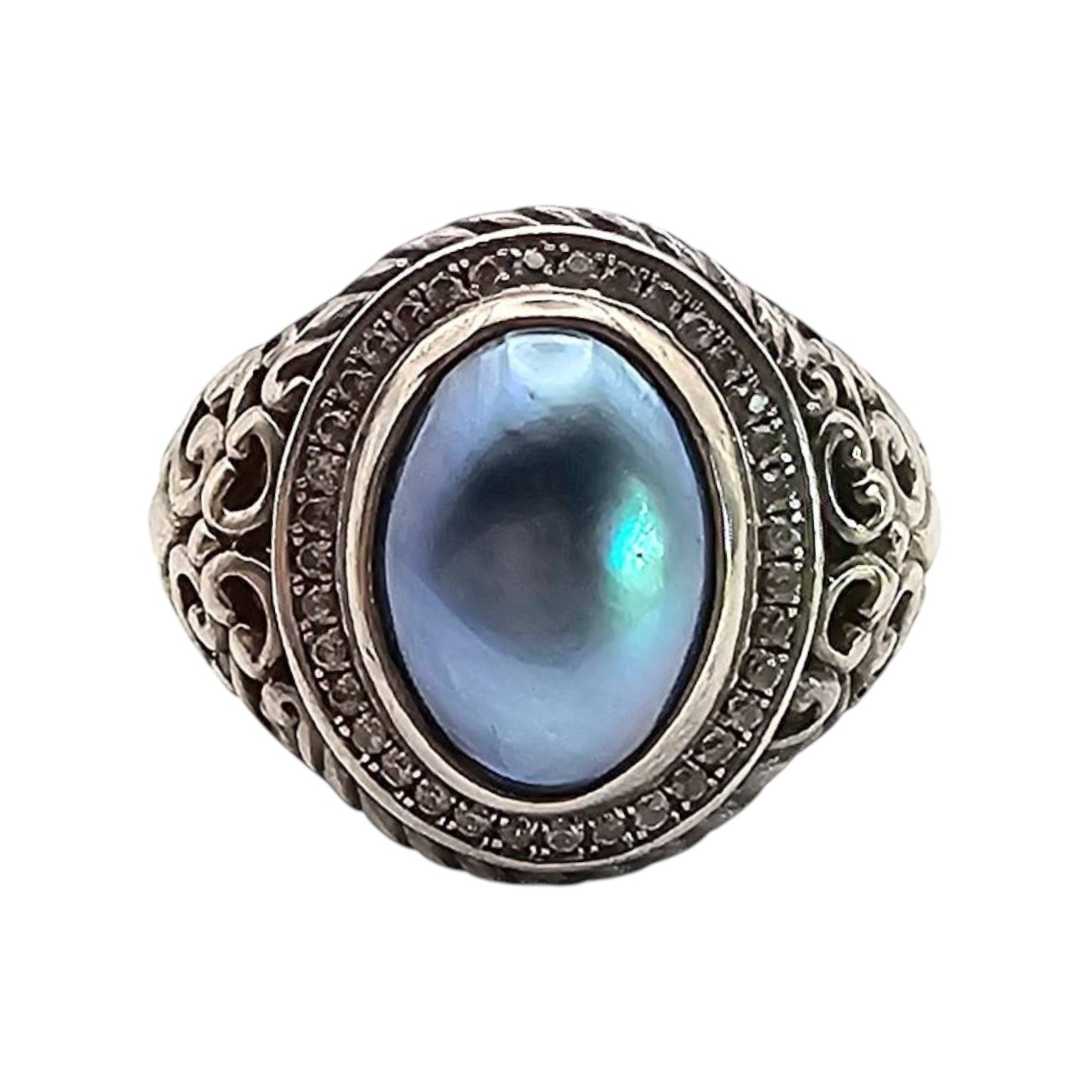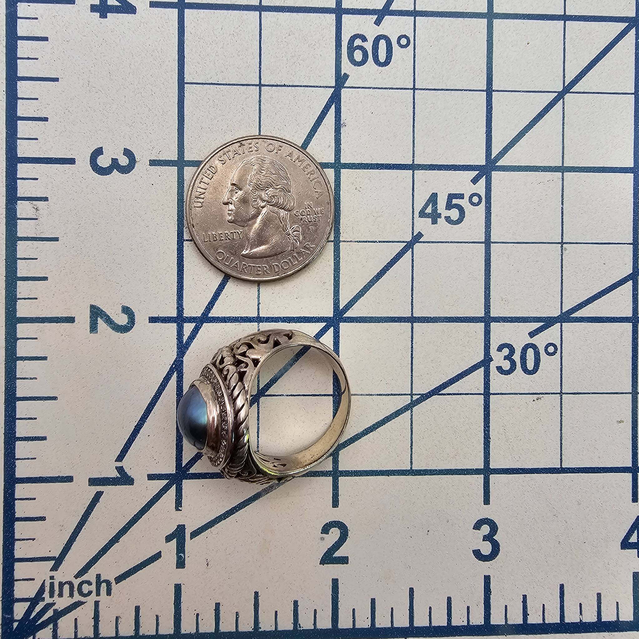 This ring is crafted from sterling silver and features an oval-shaped pearl centerpiece, set within an ornate filigree design. The ring is a size 7.5 and displays intricate detailing on the band, emphasizing its craftsmanship. The pearl exhibits a lustrous blue hue, enhancing its visual appeal.