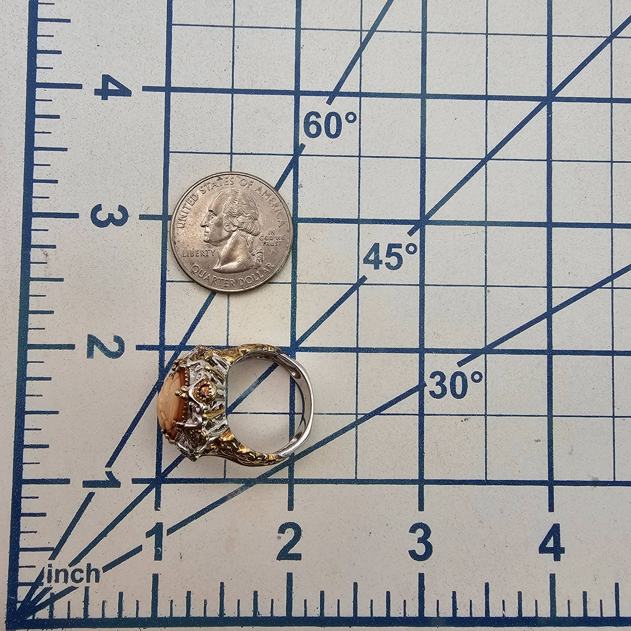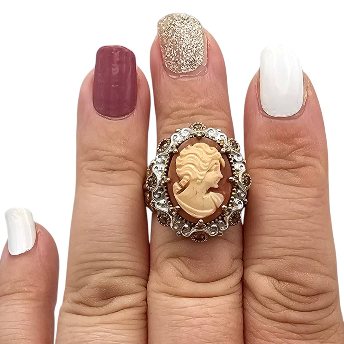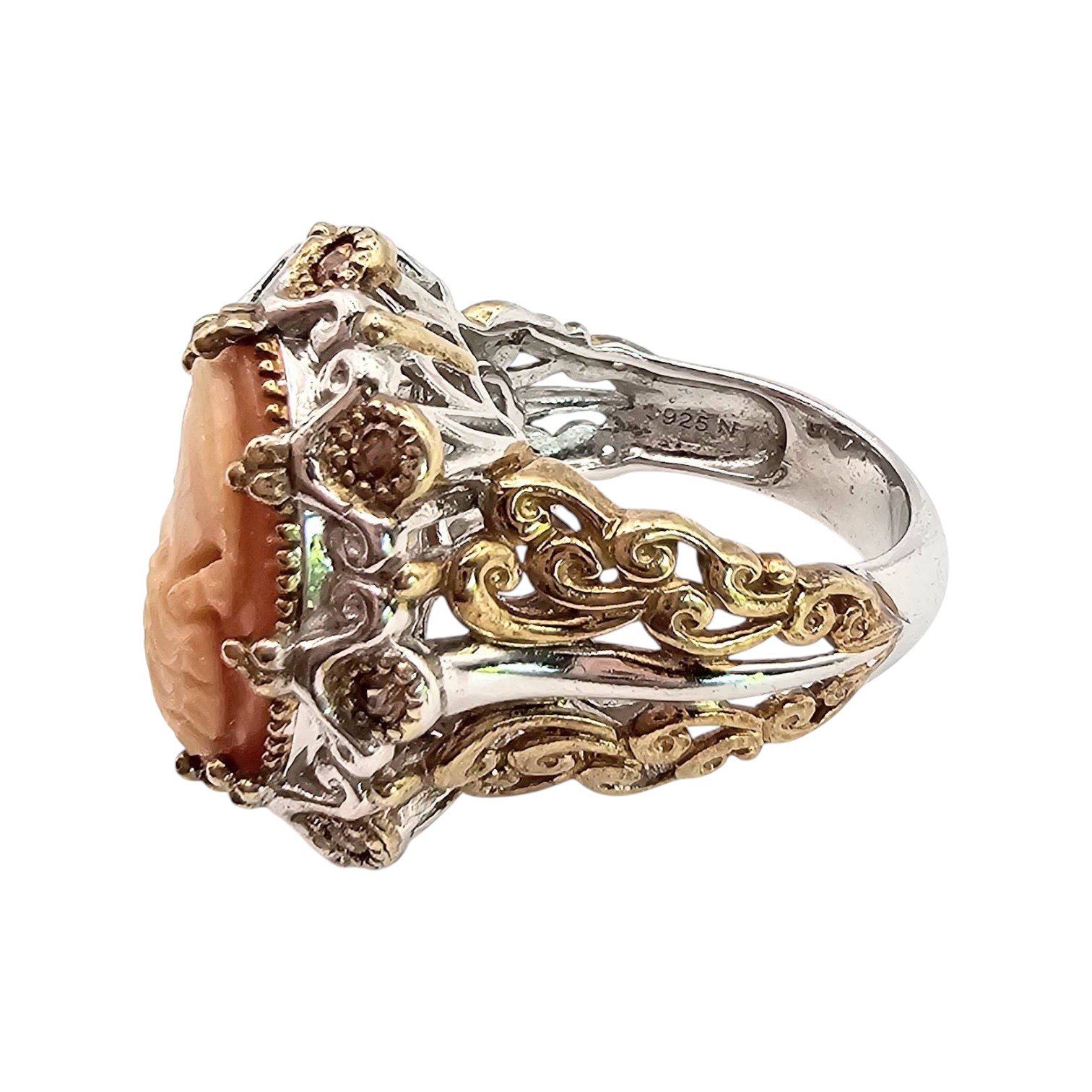 Sterling silver carved cameo ring stamped ‘NH 925’ featuring a central oval cameo design. The ring is accented with intricate gold over detailing and decorative embellishments around the band. Weighs 8.8 grams and marked as a size 7. Excellent craftsmanship with a blend of silver and gold-tone elements.