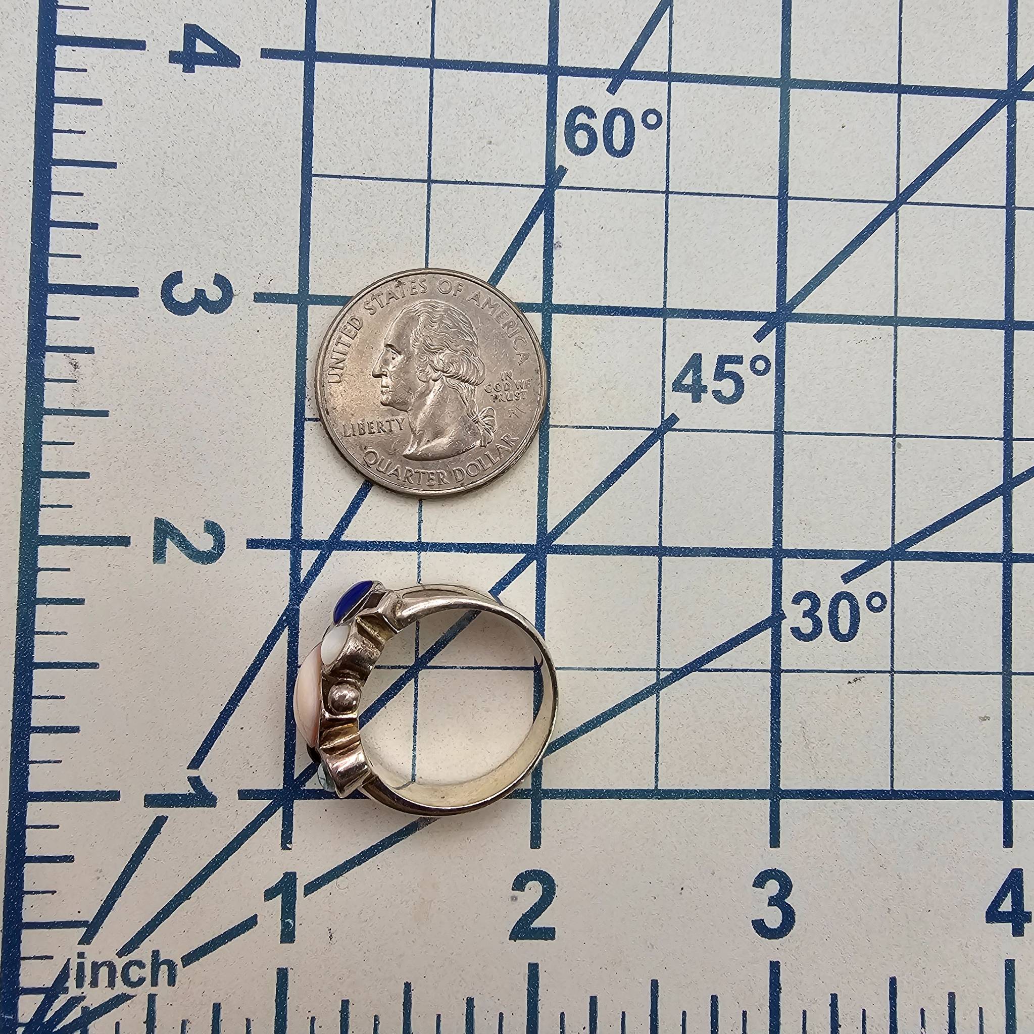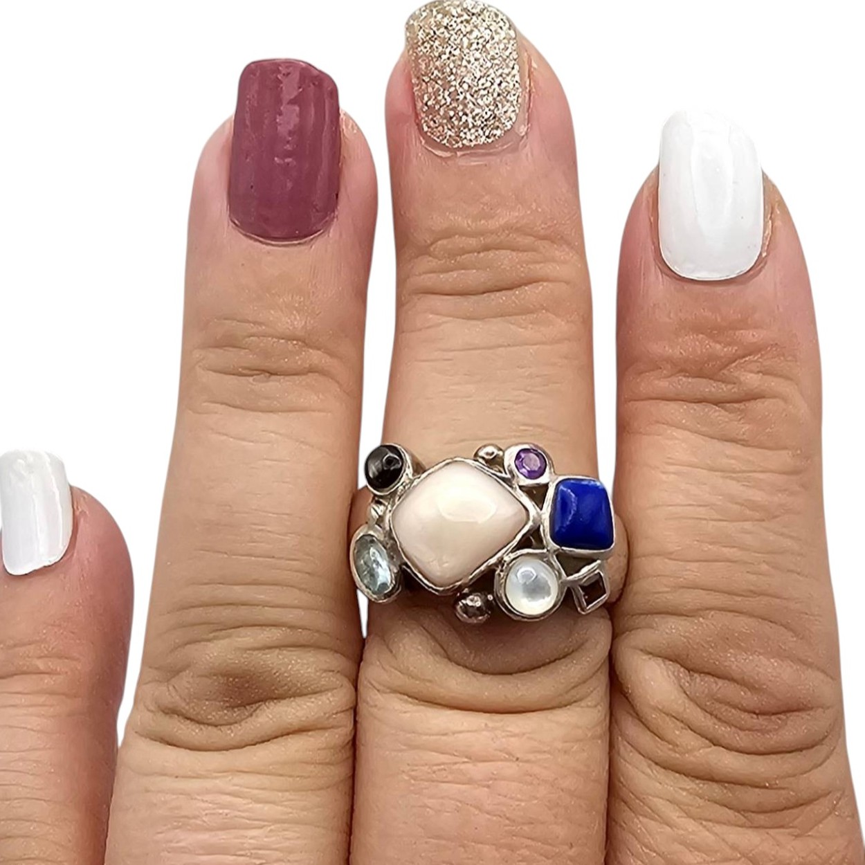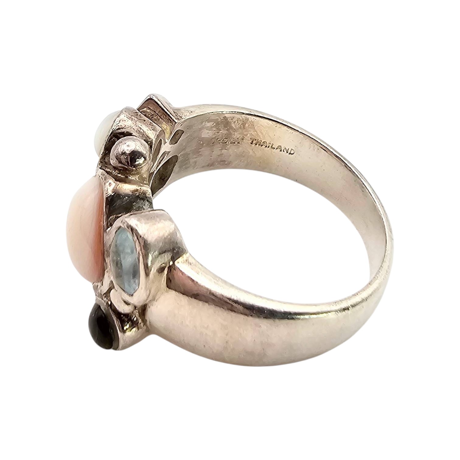 Sterling silver ring featuring a multi-stone design with various gemstones, including a central pink cabochon and surrounding stones of different colors and shapes. The ring size is 8.5, and it weighs 9.1g. The band is smoothly polished with visible maker’s mark inside.
