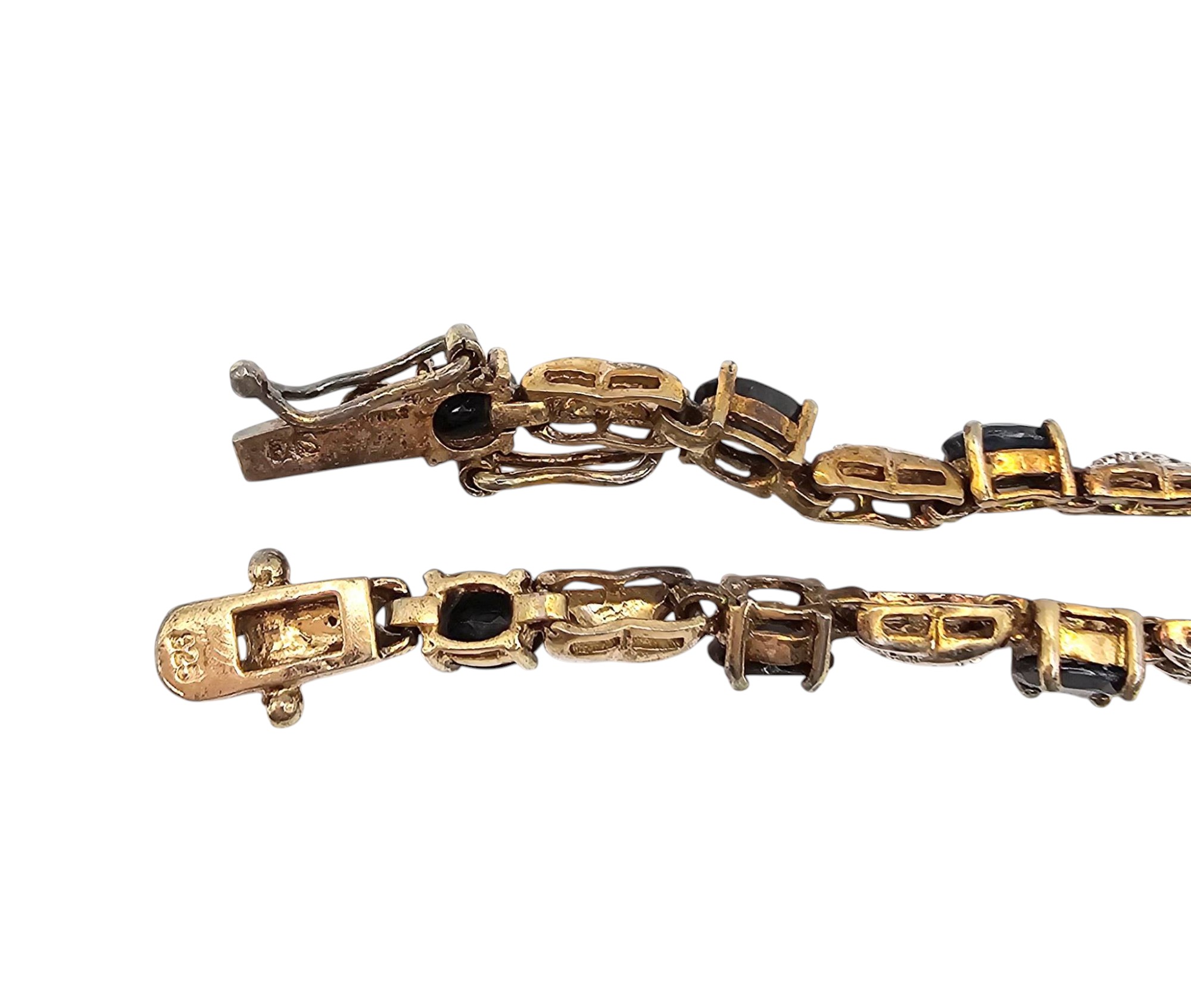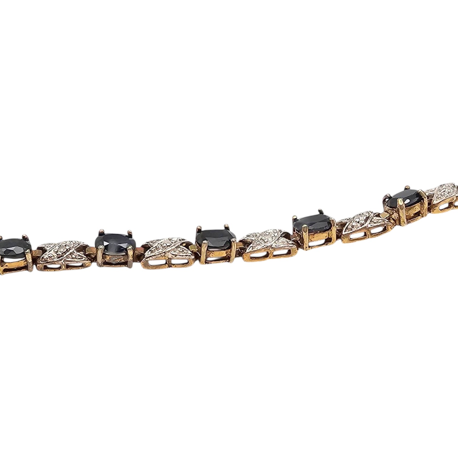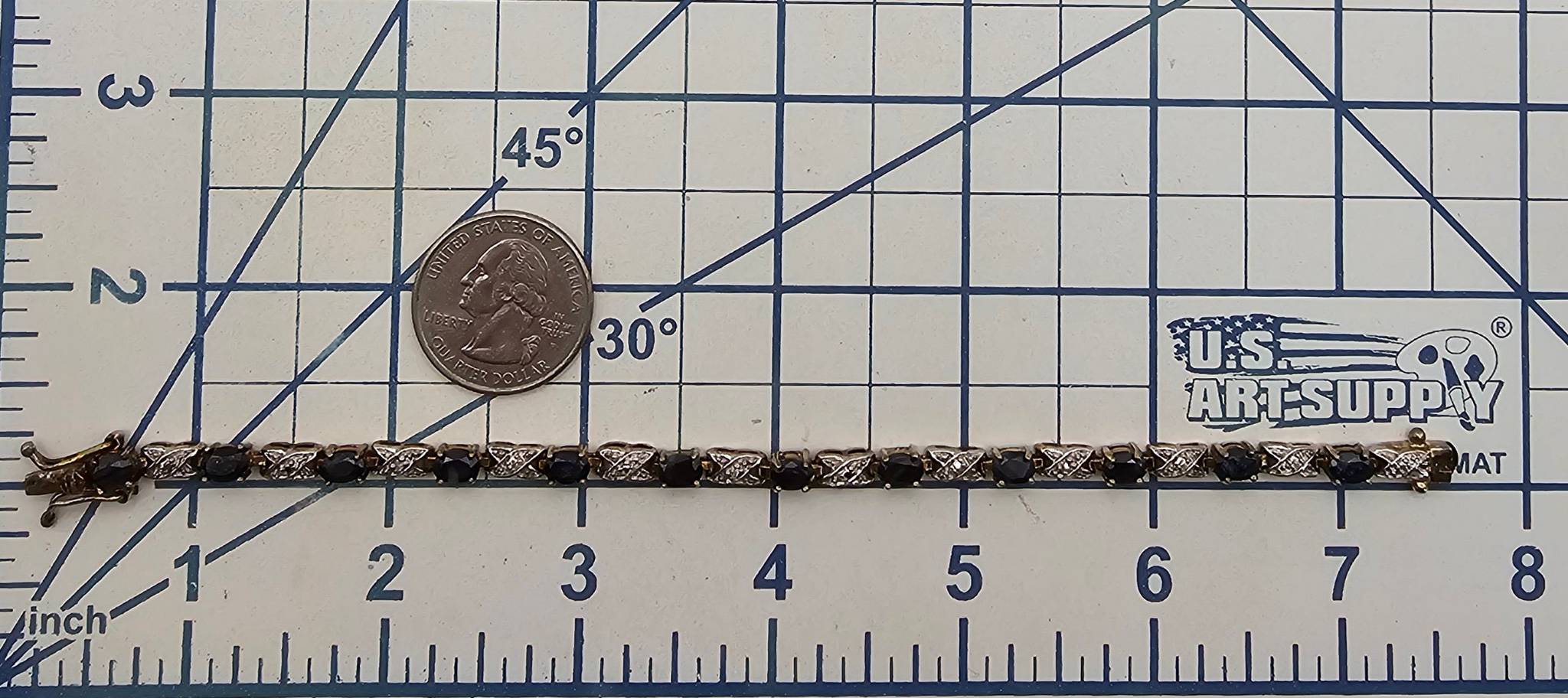 FAS sterling silver tennis bracelet featuring a gold overlay, adorned with alternating blue topaz and diamond accents. Weighs 11.7 grams. The clasp is secure and well-made. Approximately 7 inches in length, suitable for a standard wrist size. Stamped 925 and FAS on the clasp for identification.