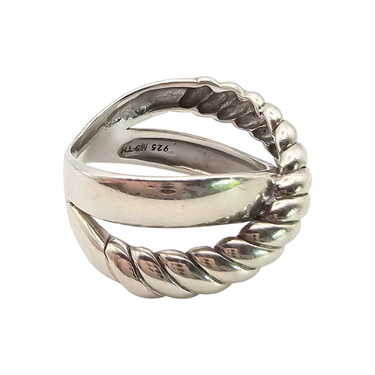 Sterling silver ring featuring a crossover design with twisted and smooth band detailing. Hallmarked ‘925’ for sterling silver. Ring size is 6.5 with a weight of 4.5 grams. Visible in good condition, showing minimal wear.