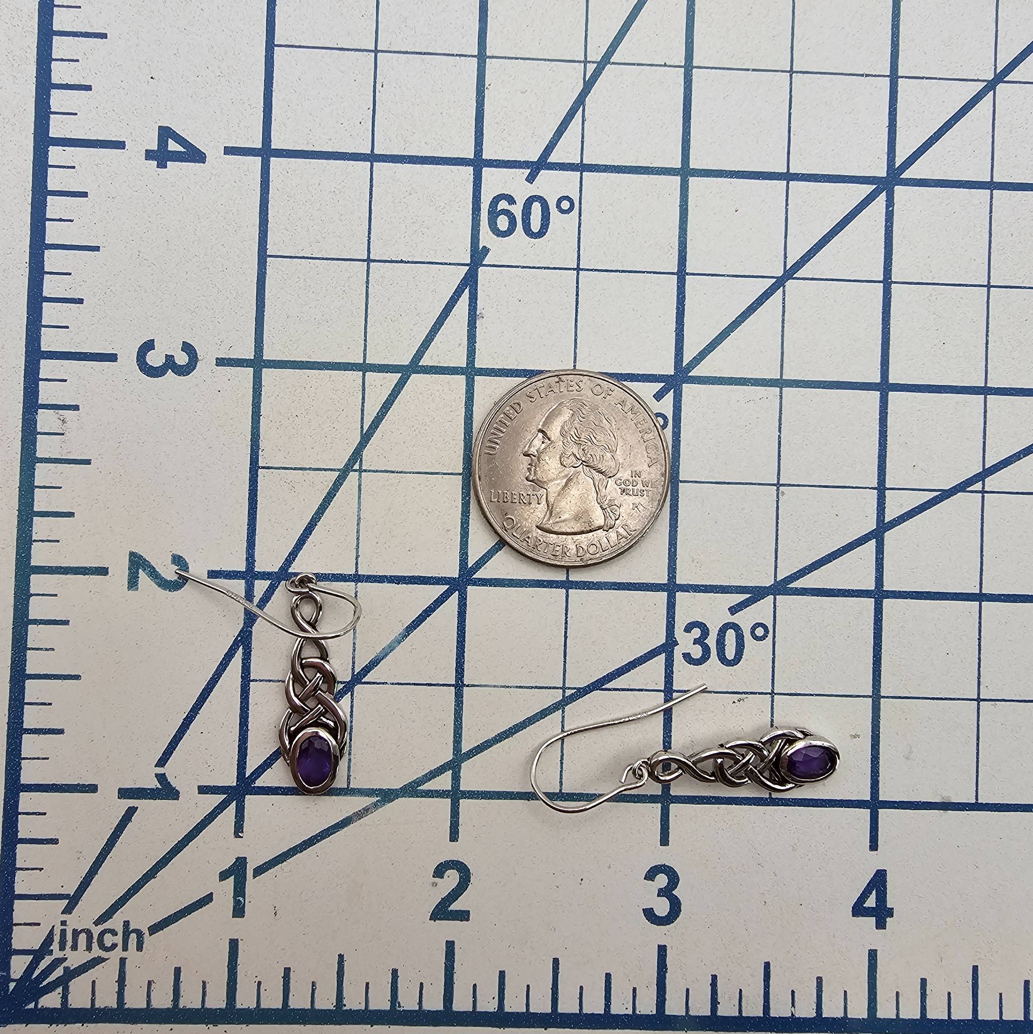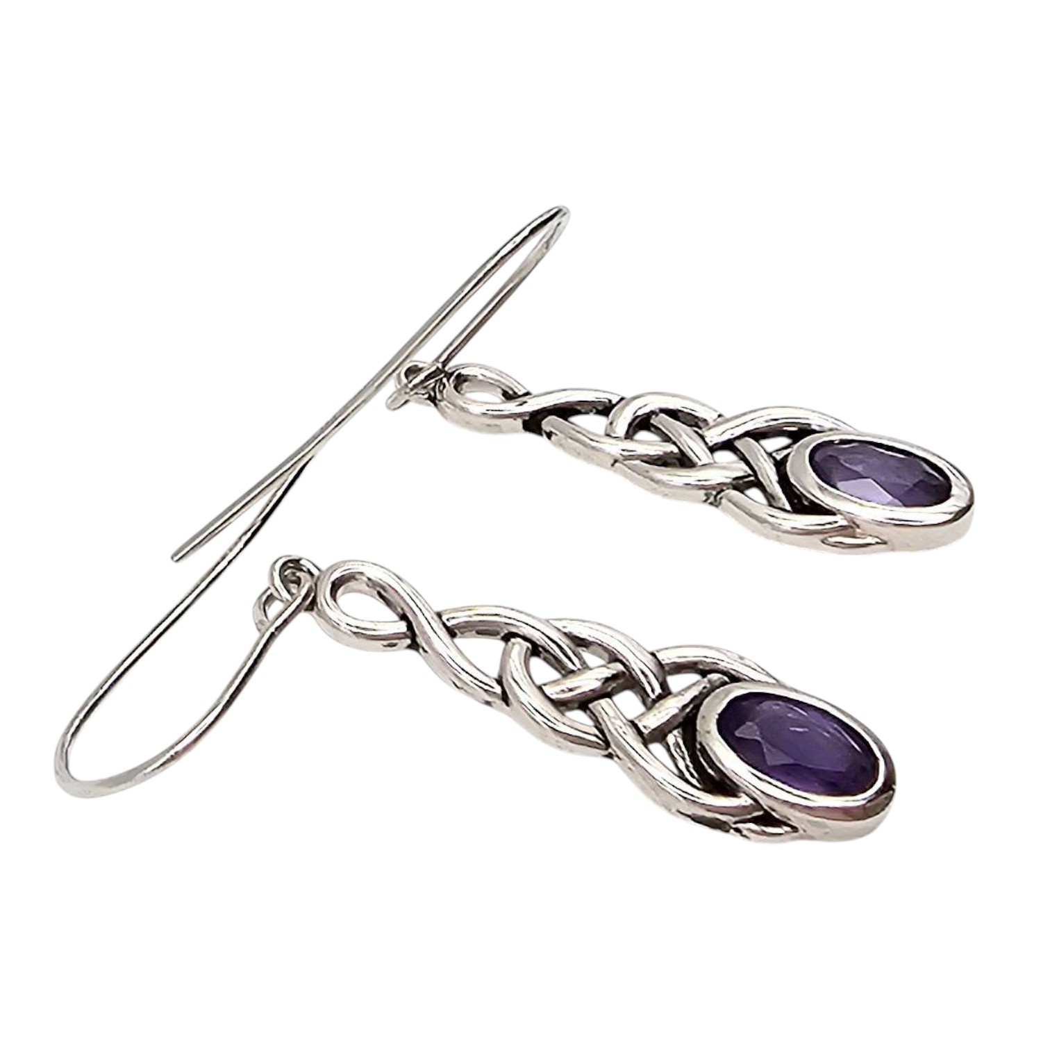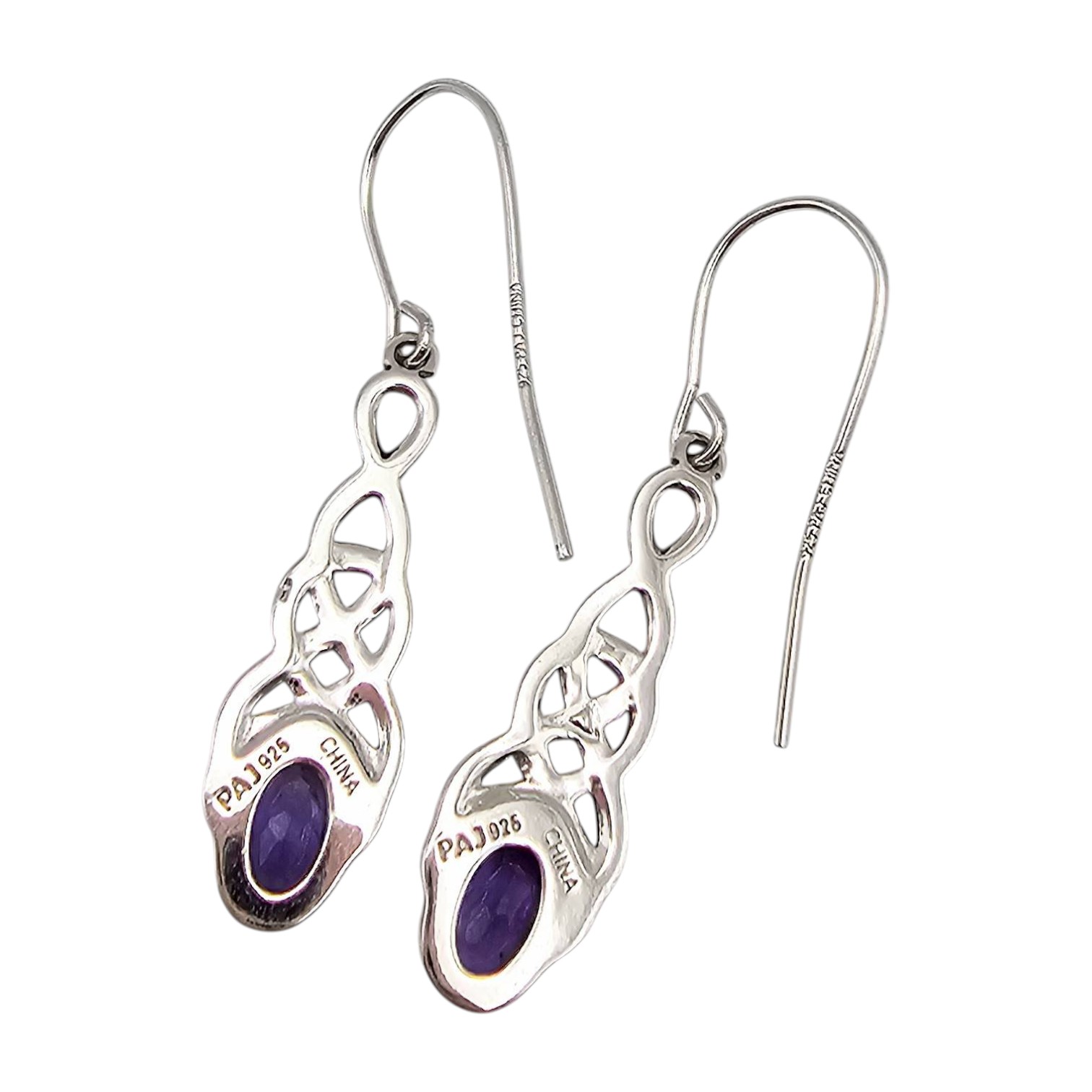 PAJ Amethyst drop earrings crafted from sterling silver. Features intricately braided silver designs culminating in bezel-set oval amethyst stones. Marked with ‘PAJ 925’ on the back. Total weight approximately 3.1 grams. Earrings include hook-style findings and measure approximately 1.5 inches long.