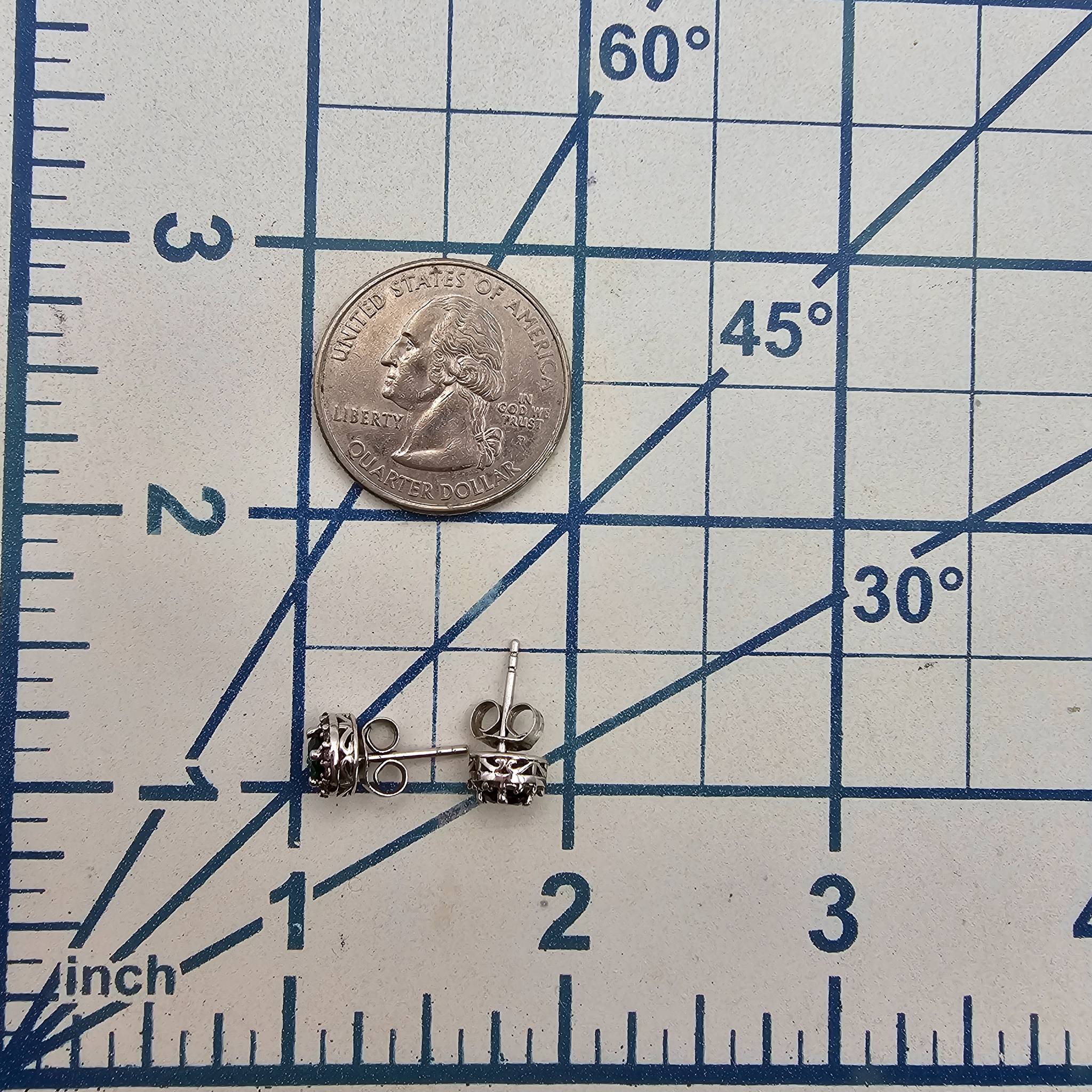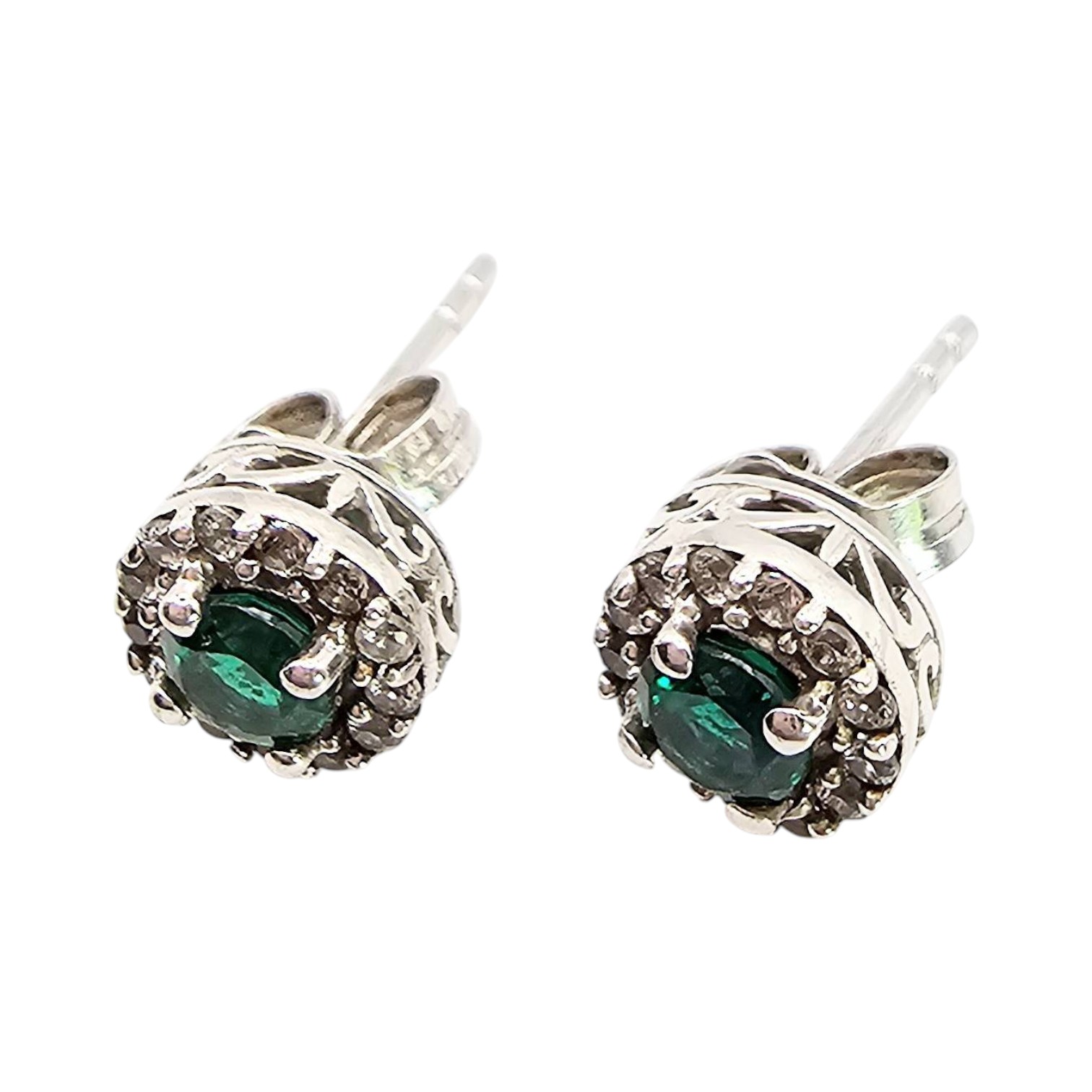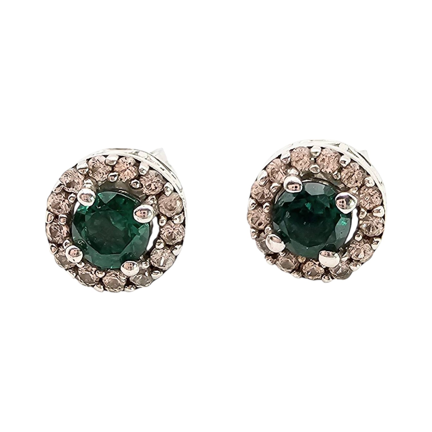 FAS brand earrings crafted from sterling silver. These round stud earrings feature a central green rhinestone surrounded by a halo of clear rhinestones. The earrings weigh approximately 1.5 grams and include standard post backs. Includes markings indicating 925 purity. Compact size, as illustrated next to a quarter for scale.