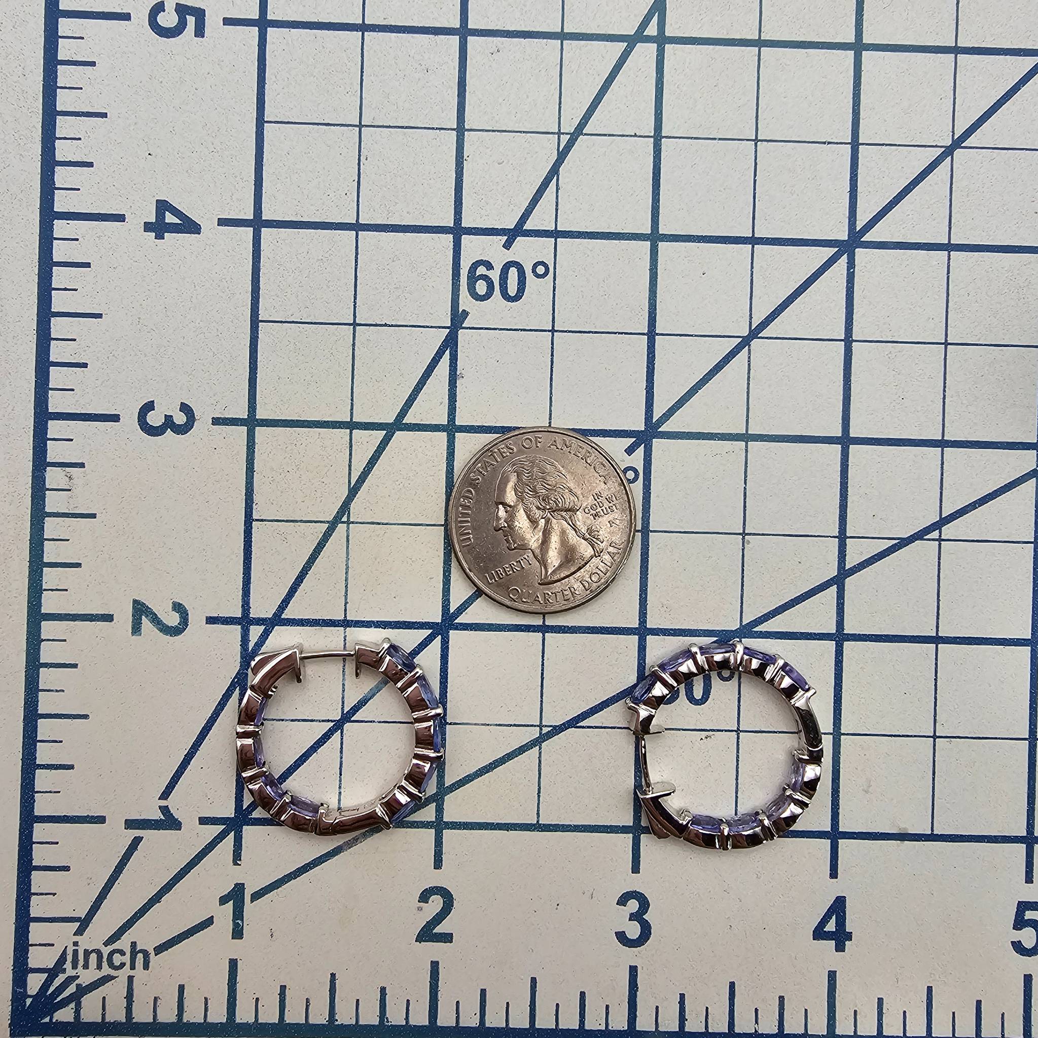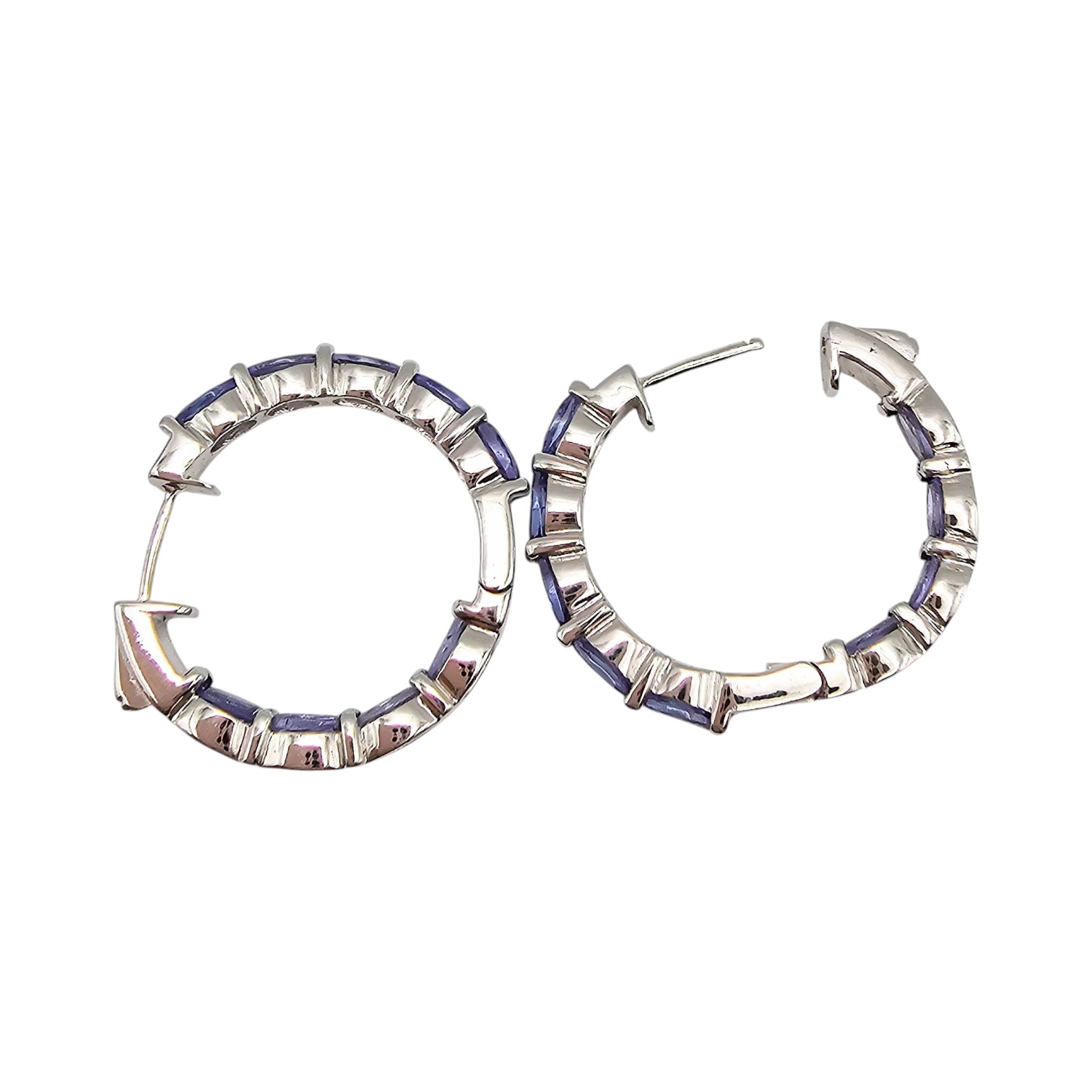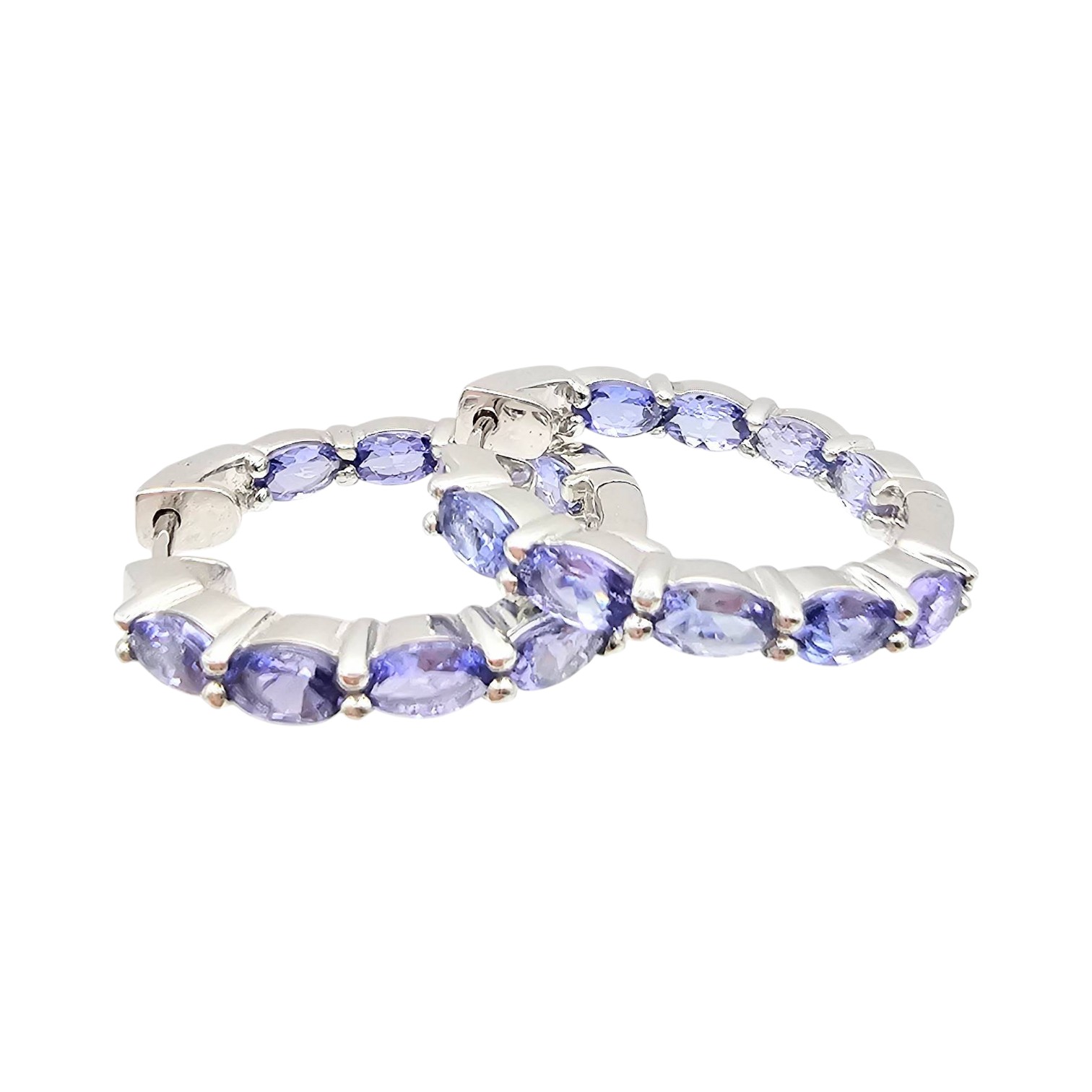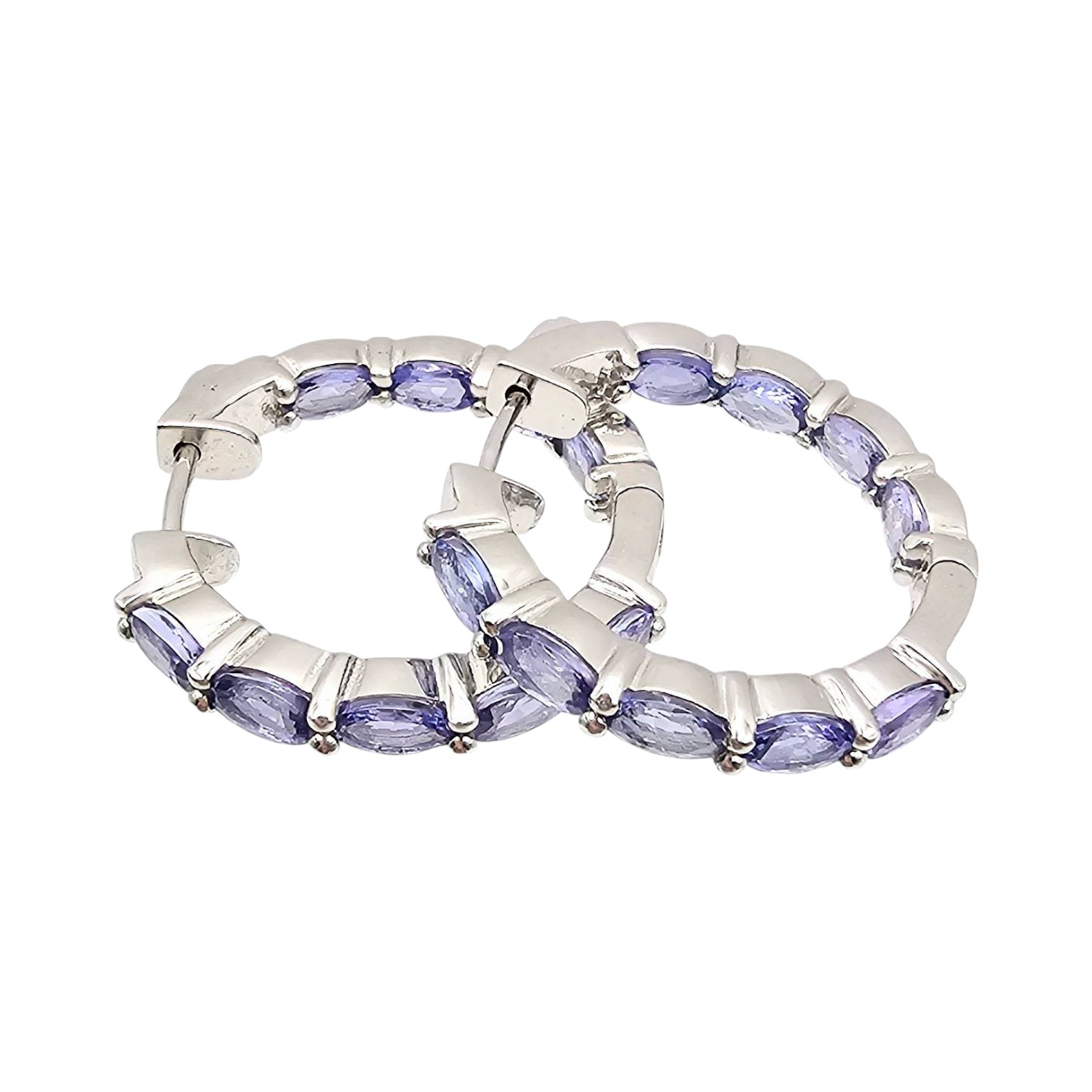 Sterling silver hoop earrings set with tanzanite stones. The earrings are signed, weigh 7.5 grams, and feature a secure hinged closure. The stones are faceted and set in a uniform design, enhancing the overall elegance of the piece. Suitable for both casual and formal wear.