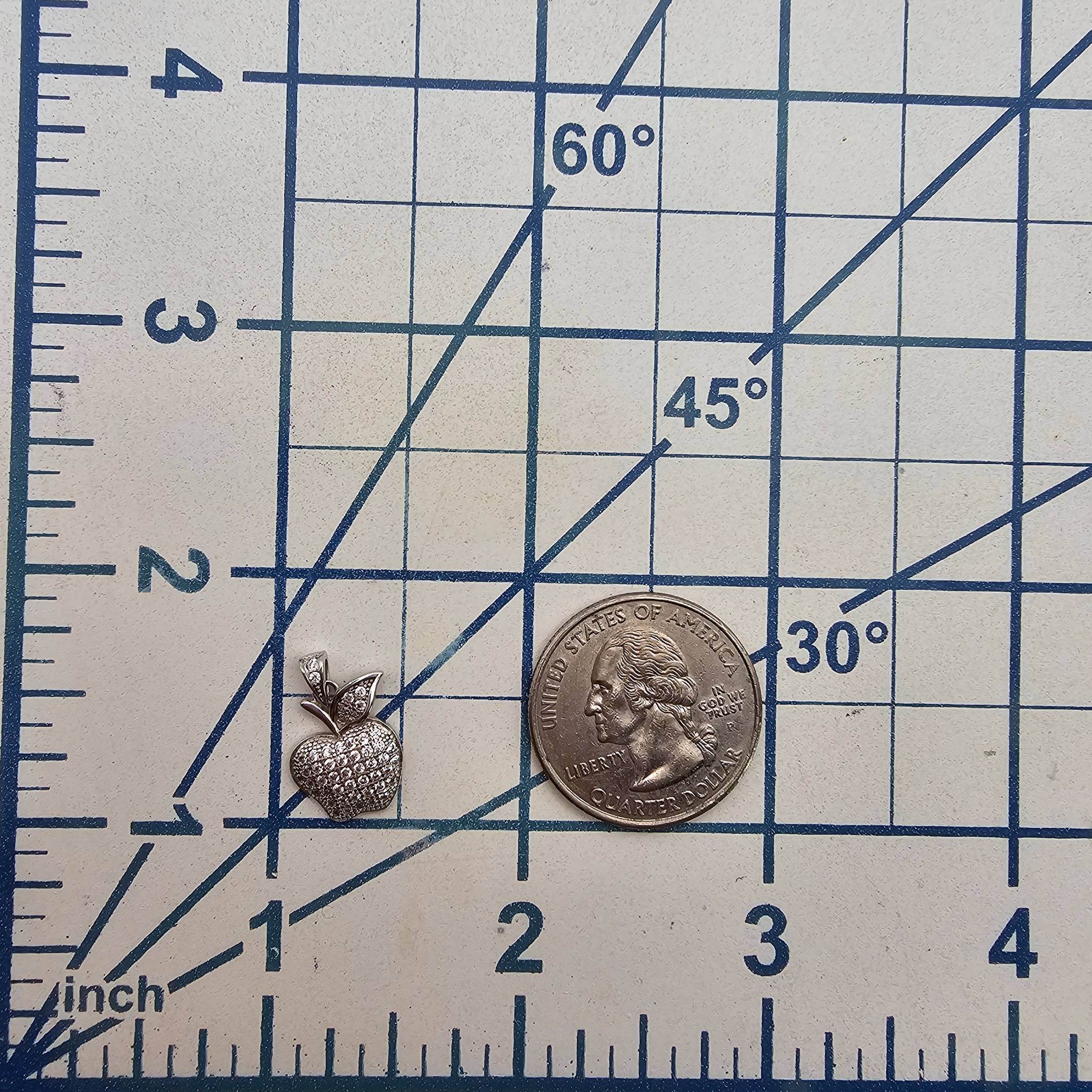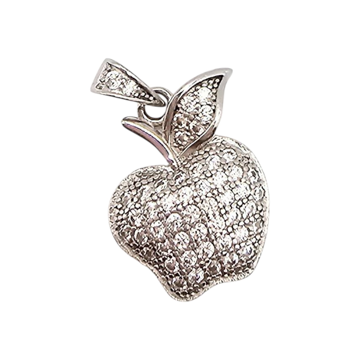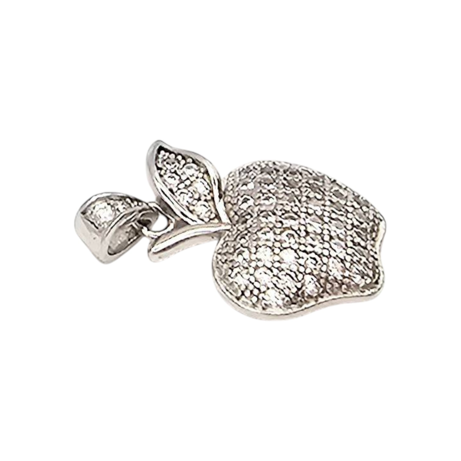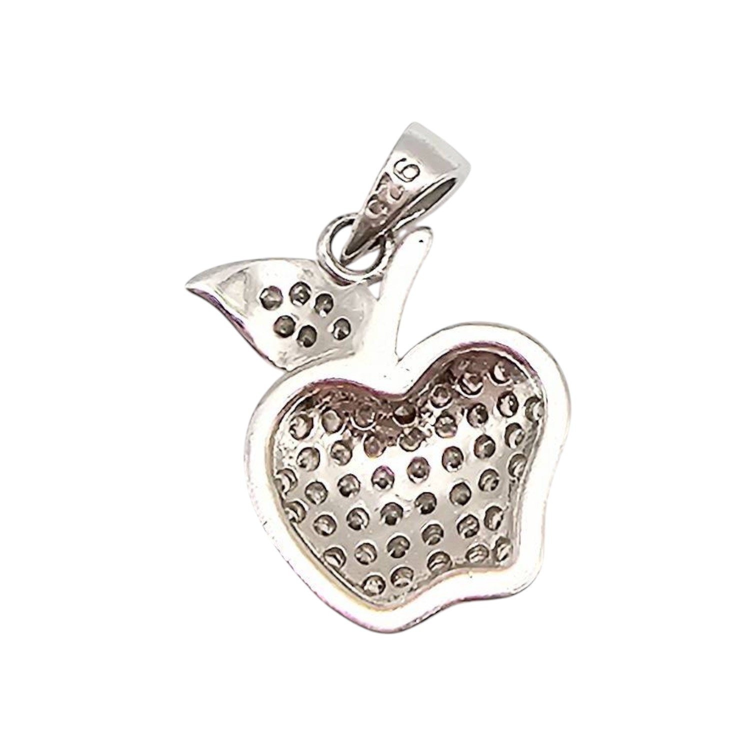 Sterling silver apple-shaped gemstone pendant featuring pave-style gemstone accents. Weighing 1.2g, this petite and elegant piece measures approximately 0.75 inches in height. Marked ‘925’ to signify sterling silver quality. Suitable as a charm or necklace pendant.