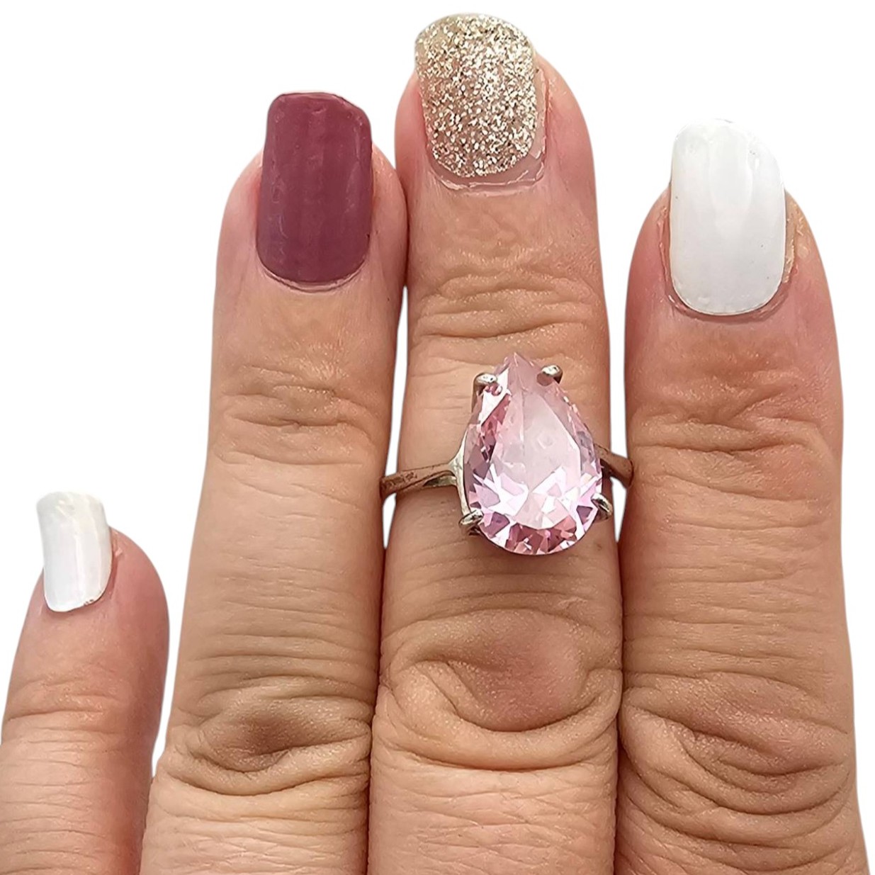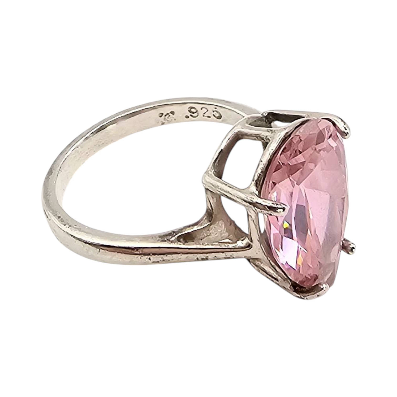 Sterling silver ring featuring a large pear-shaped pink rhinestone as the centerpiece. The ring is a size 6.75 and weighs 4.3 grams. The elegant rhinestone is securely set in a prong setting. The inside of the band is stamped ‘.925’, denoting sterling silver composition.