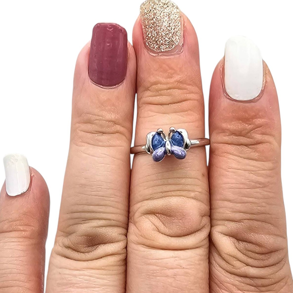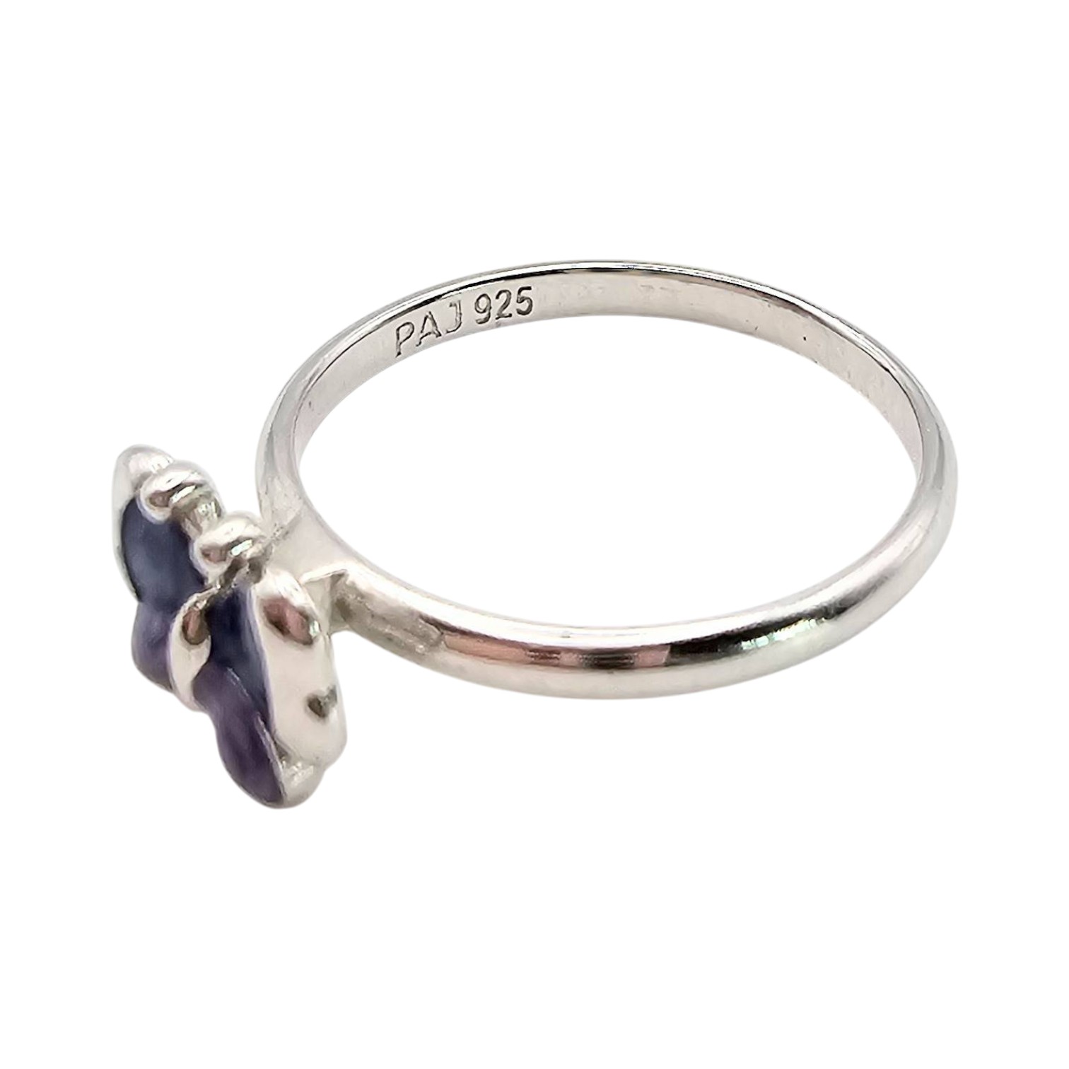 Sterling silver ring marked ‘PAJ 925’, featuring a butterfly design with purple enamel details. The ring is a size 6.25 and weighs approximately 1.8 grams. This delicate piece provides a charming design for everyday wear or as a gift.