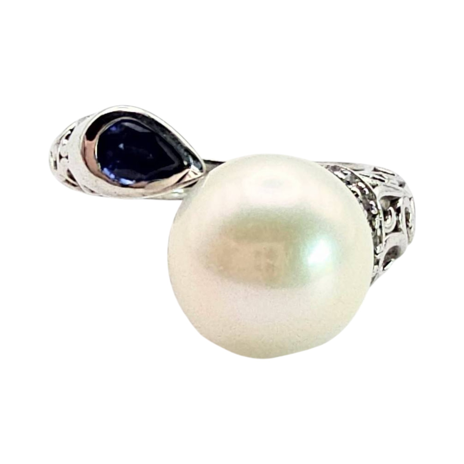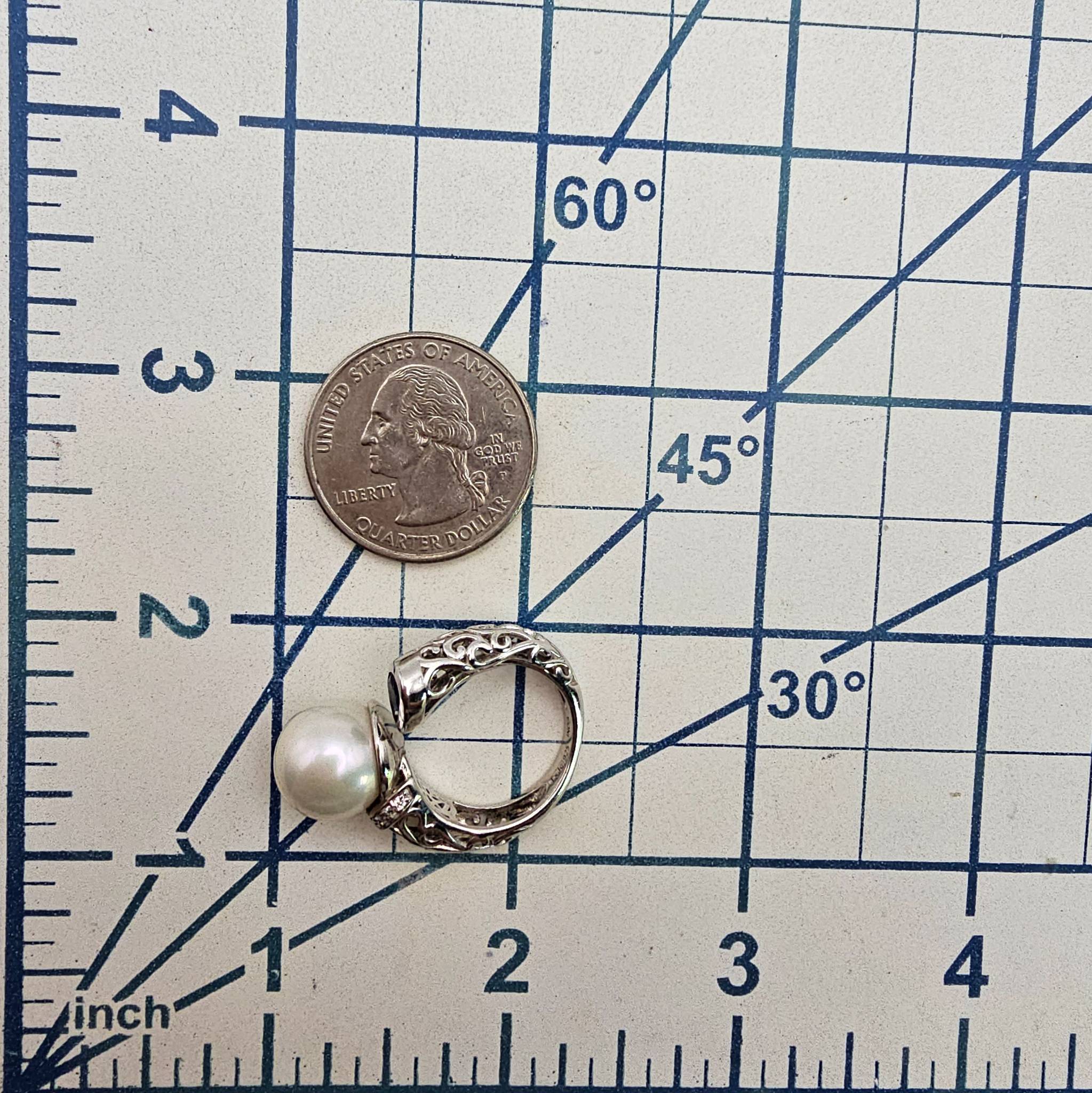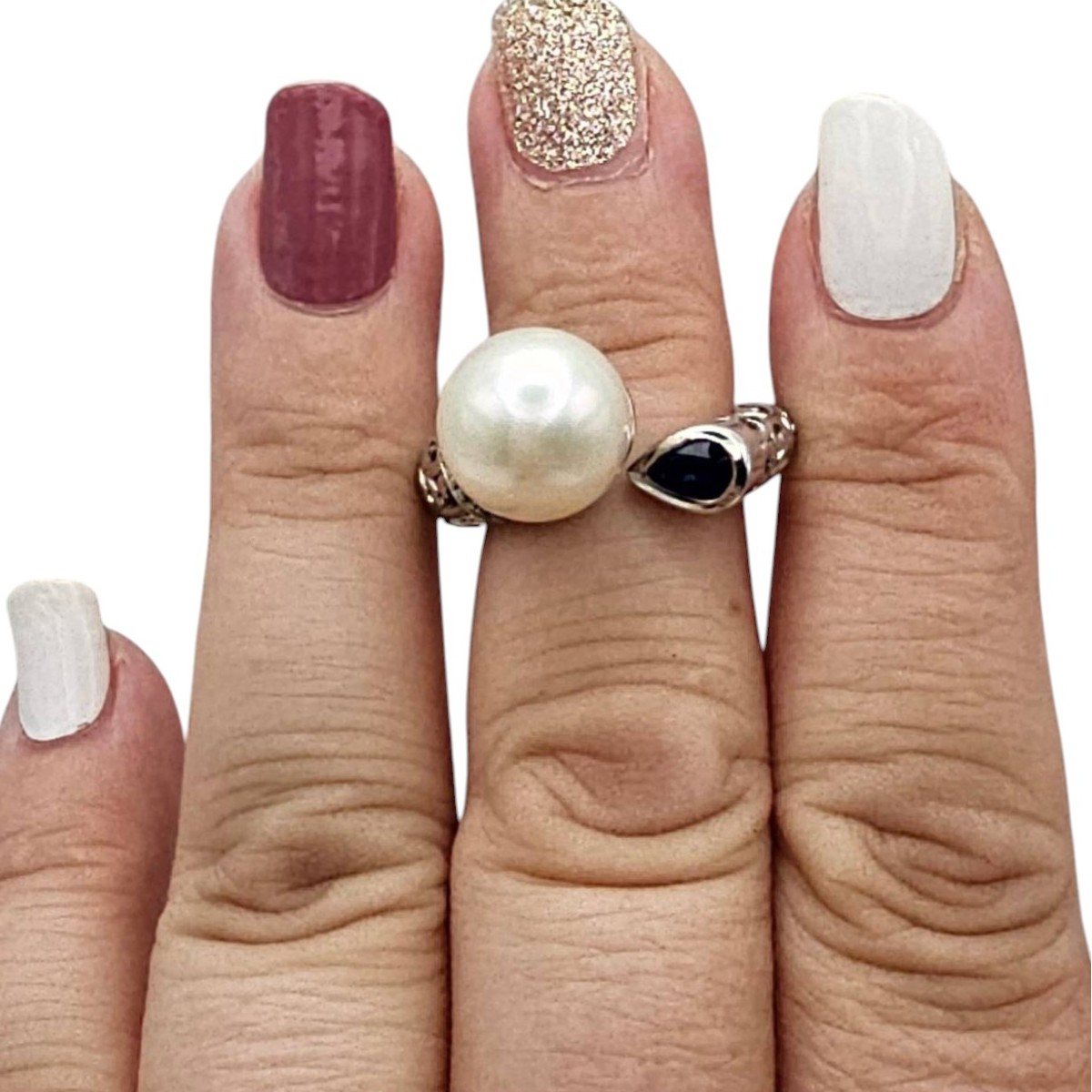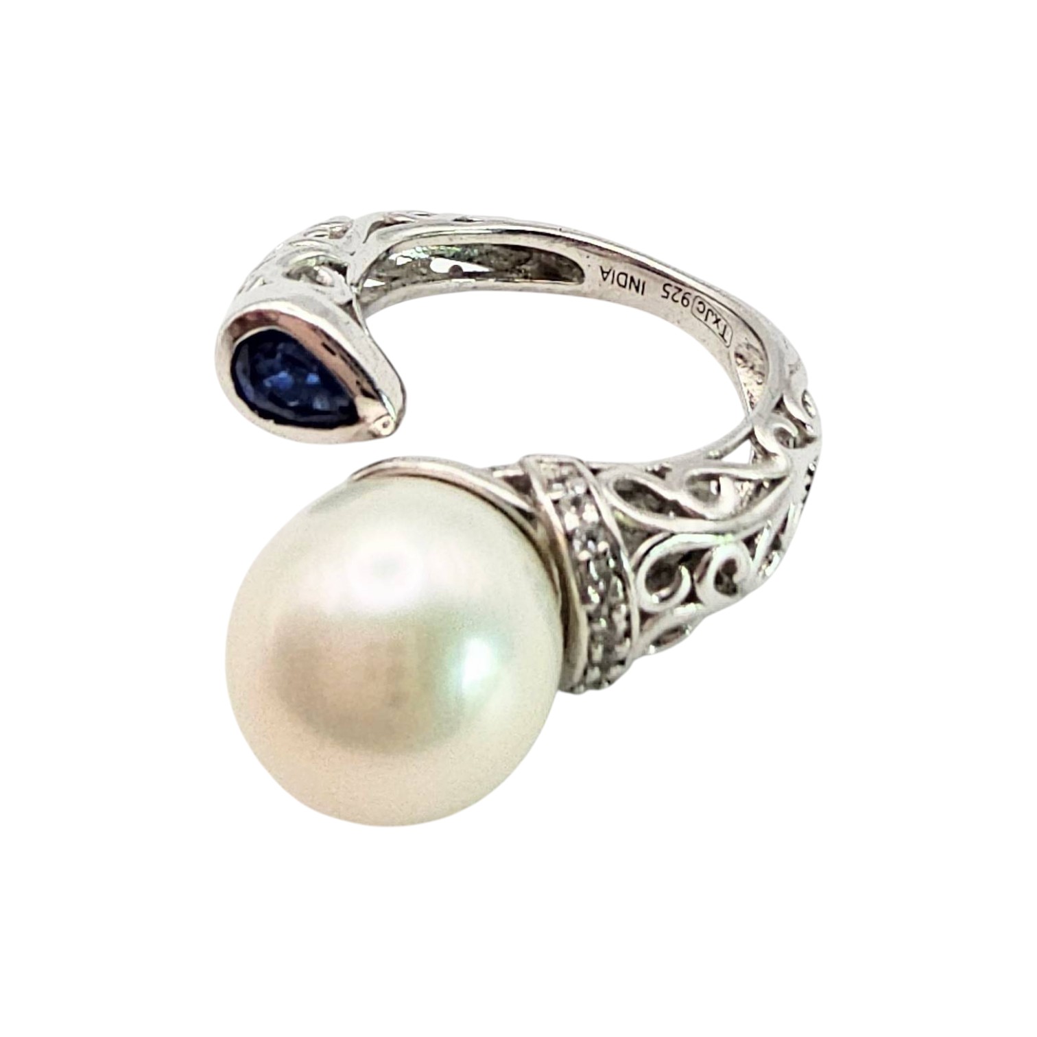 Sterling silver ring featuring a prominent round pearl and a pear-cut blue topaz accent. Intricate openwork and embellishments along the shank enhance its design. Marked with ‘925’, indicating sterling silver composition, and made in India. The ring has a weight of 6.9 grams and is a size 6.25.