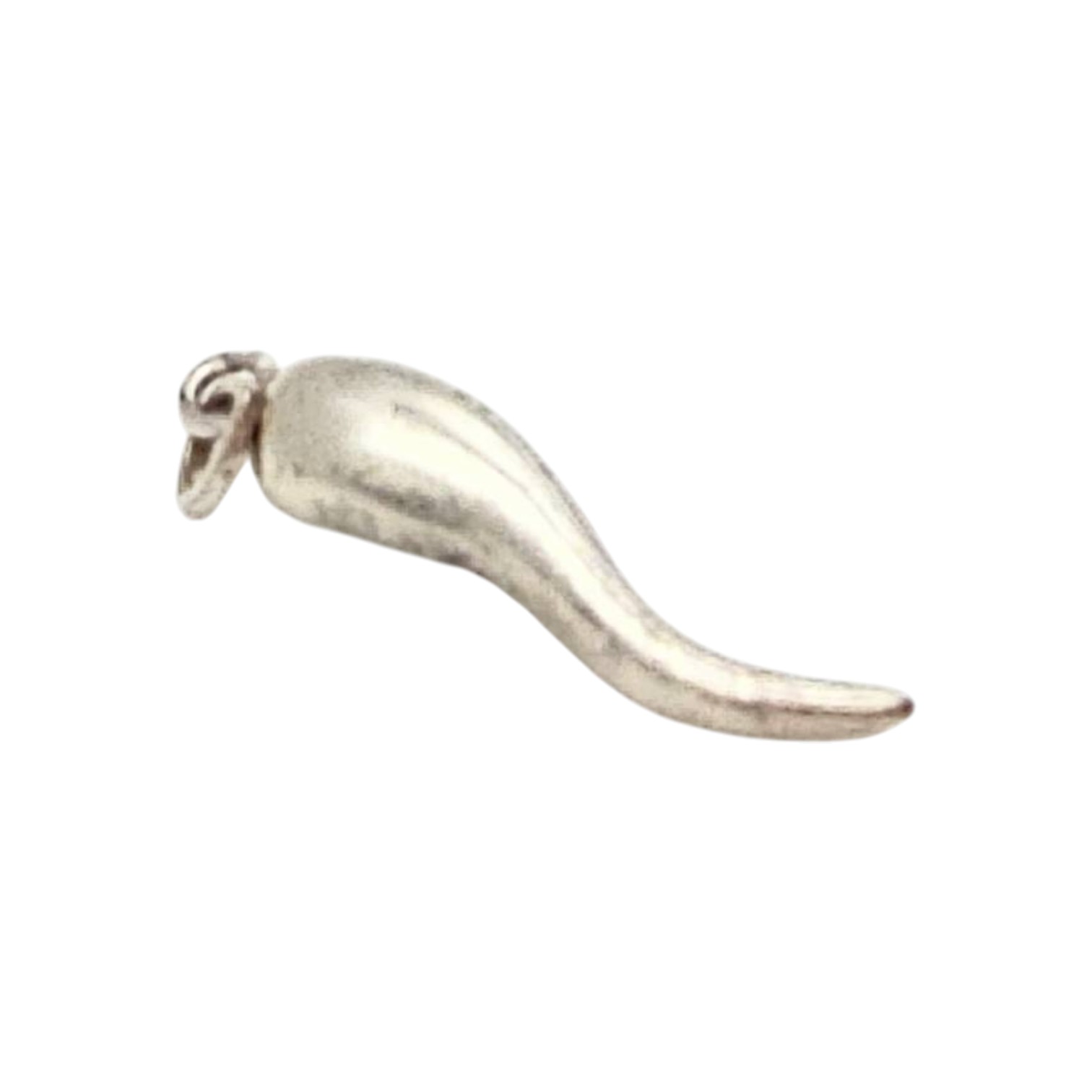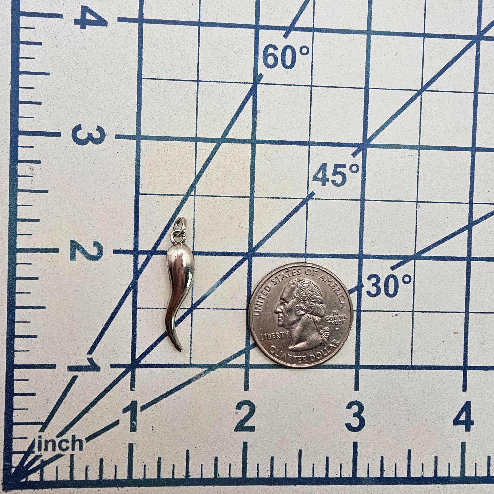 Sterling silver Italian horn pendant marked 925. Weighs approximately 1.9 grams. The pendant features a sleek, curved design. Commonly known as a cornicello, this charm is traditionally associated with Italian culture. Includes a small loop for attaching to a chain or bracelet.
