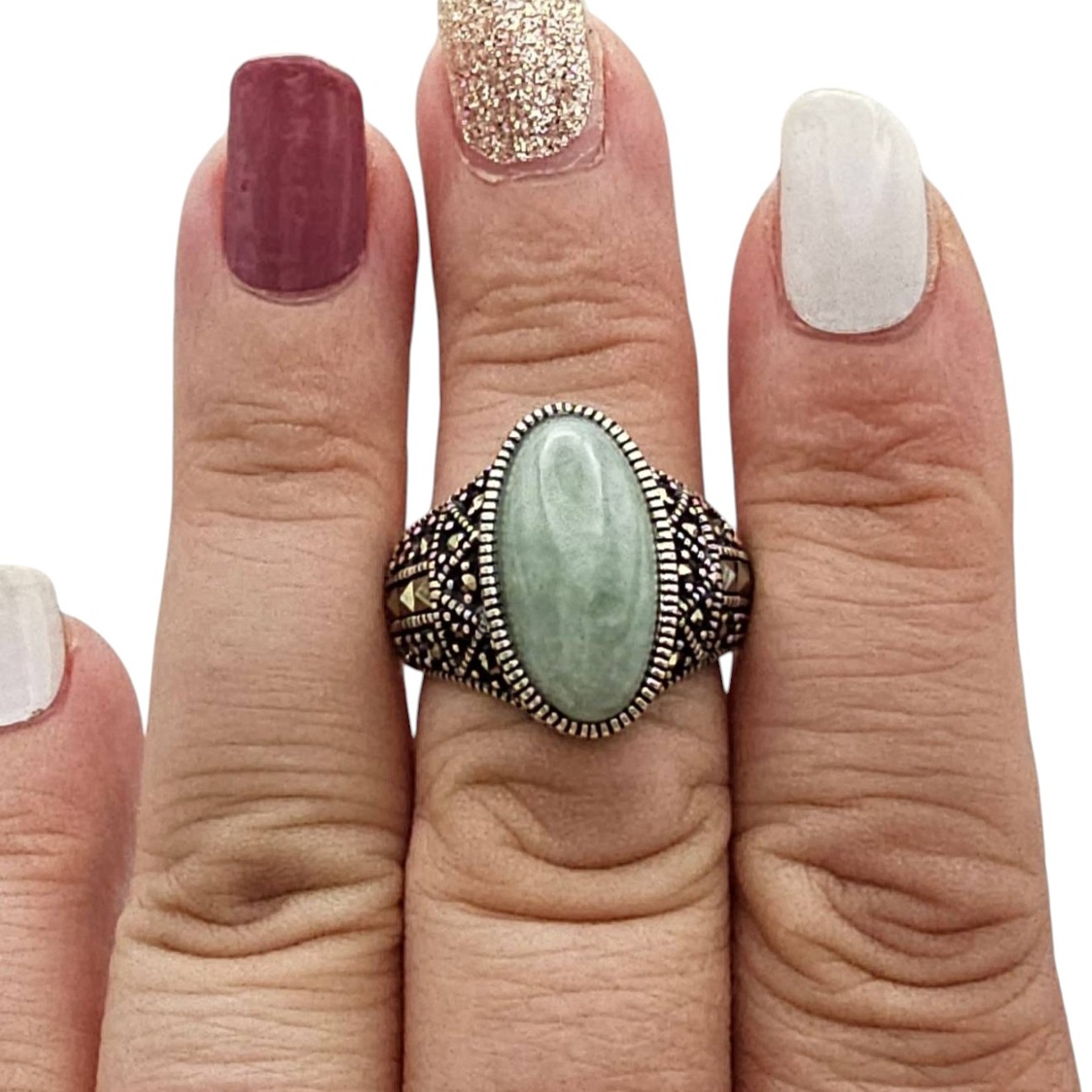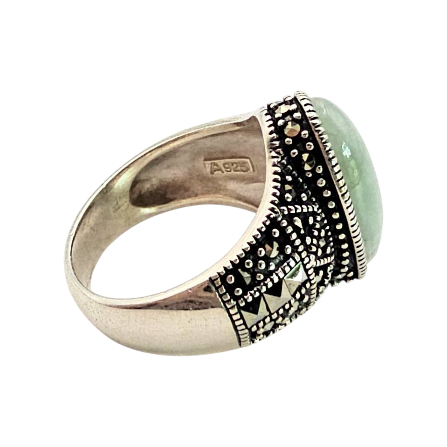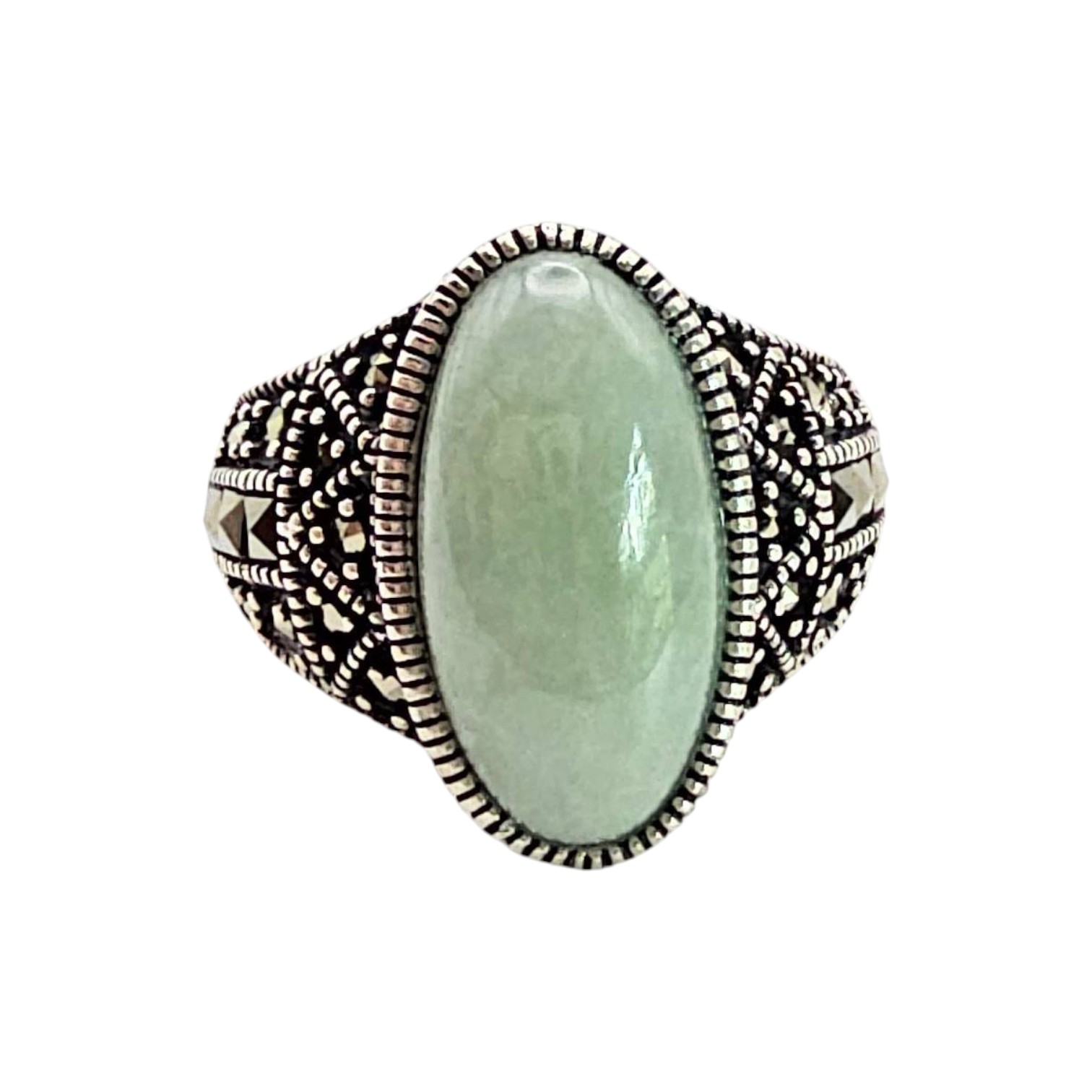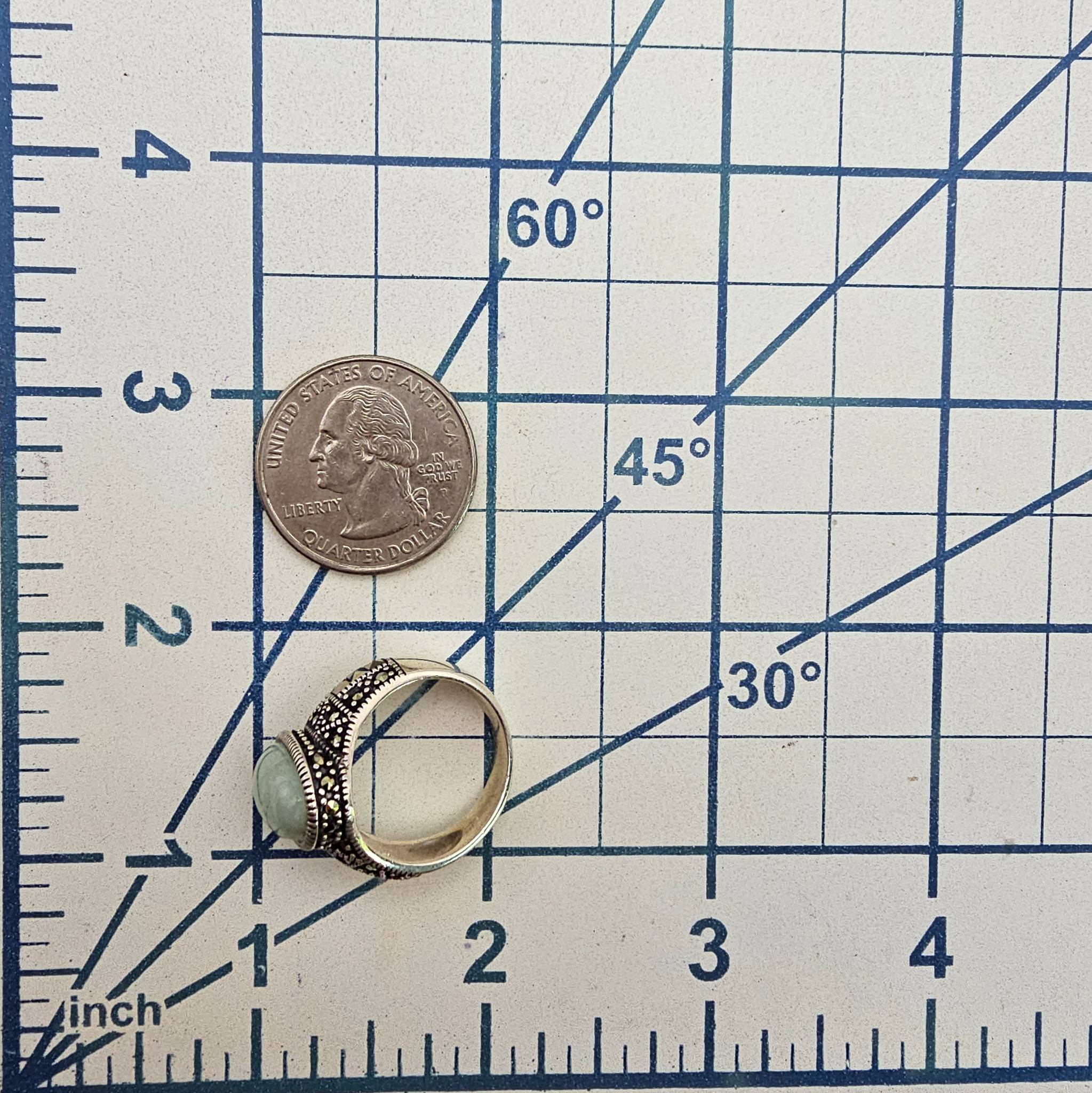 Sterling silver ring featuring an oval jade centerpiece surrounded by marcasite embellishments. The interior is stamped with “925,” indicating its sterling silver composition. The ring is size 7.25 and features intricate detailing on the band, giving it an elegant and timeless look. The approximate width and dimension can be gauged by its size and comparison with the coin shown in the image.