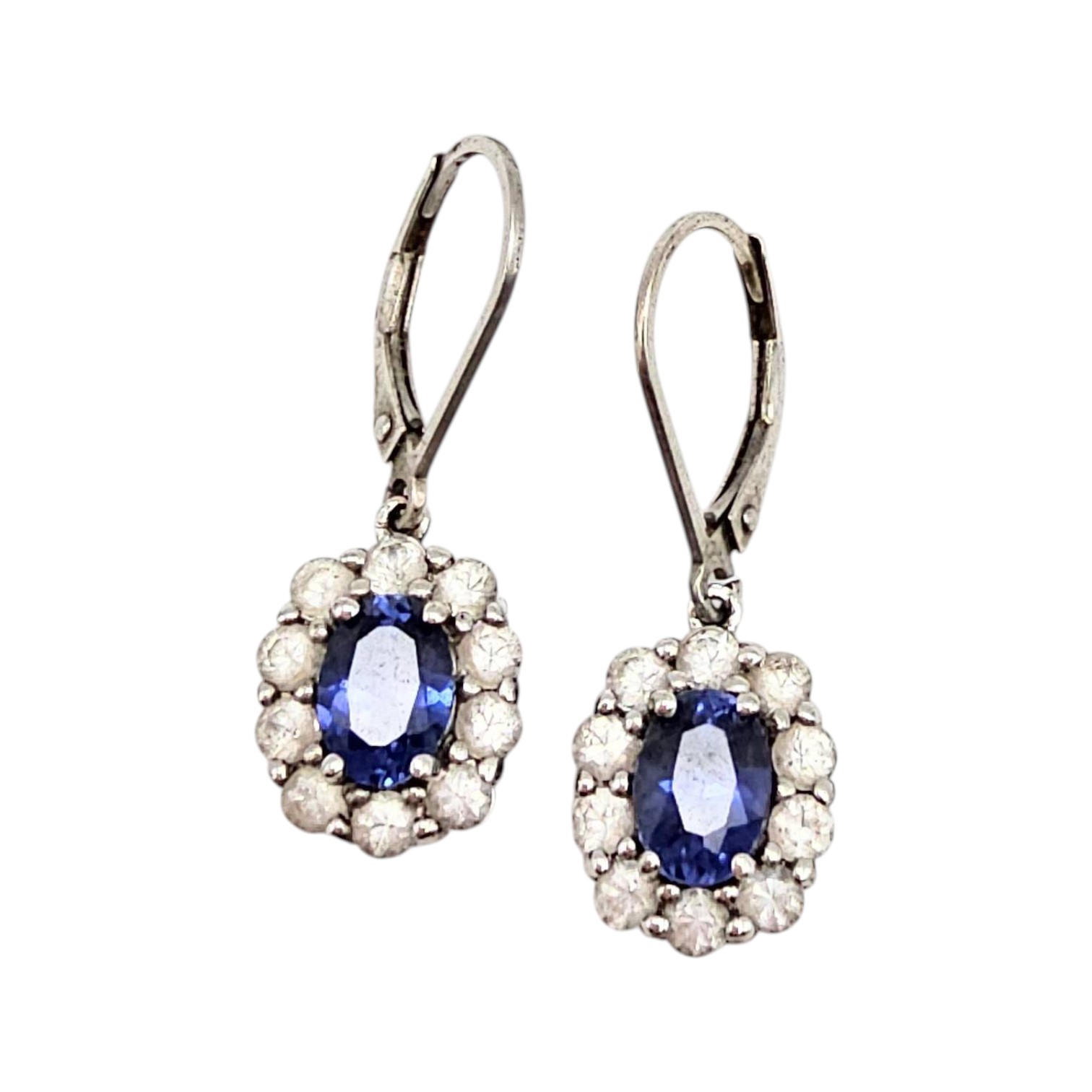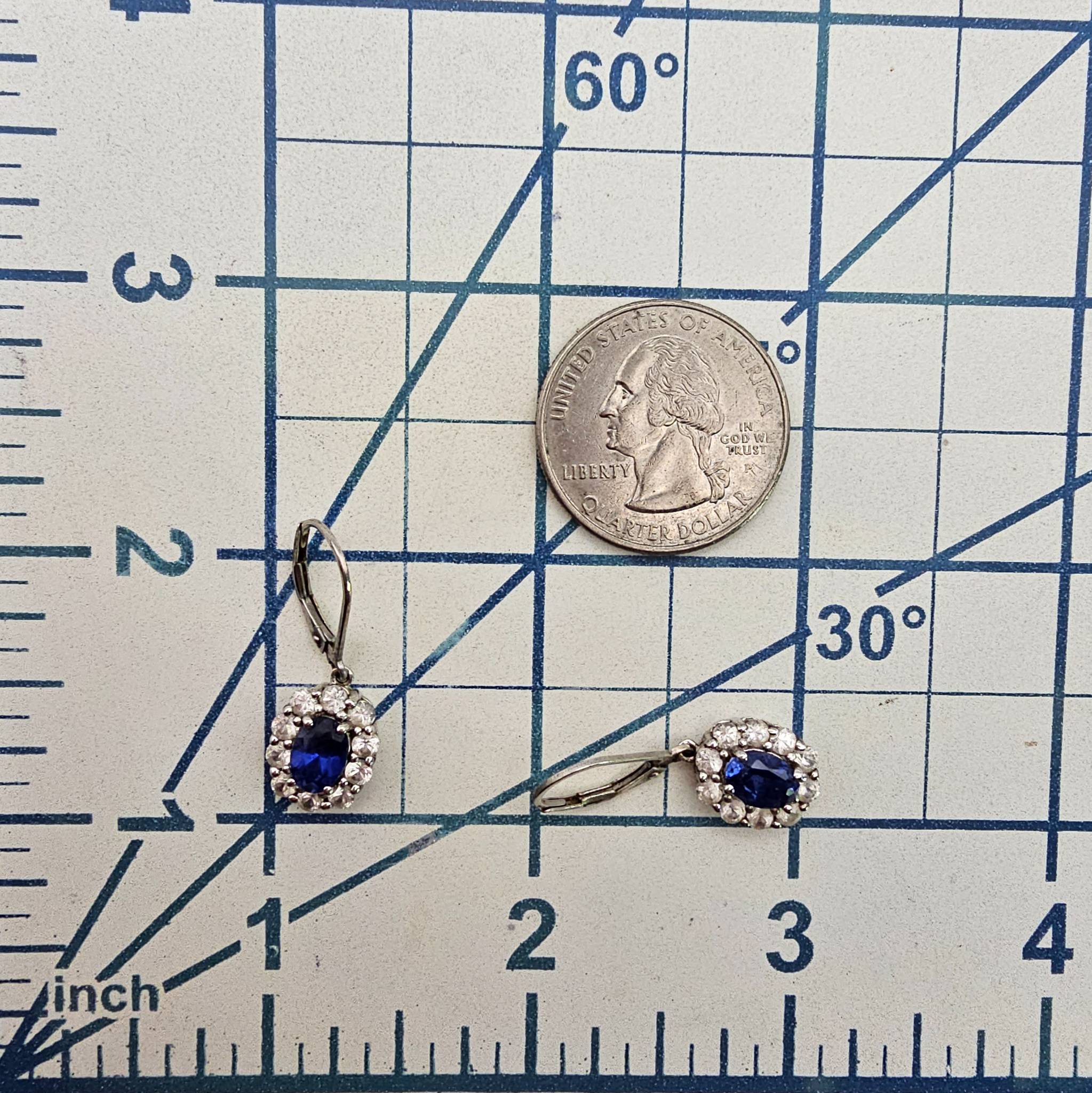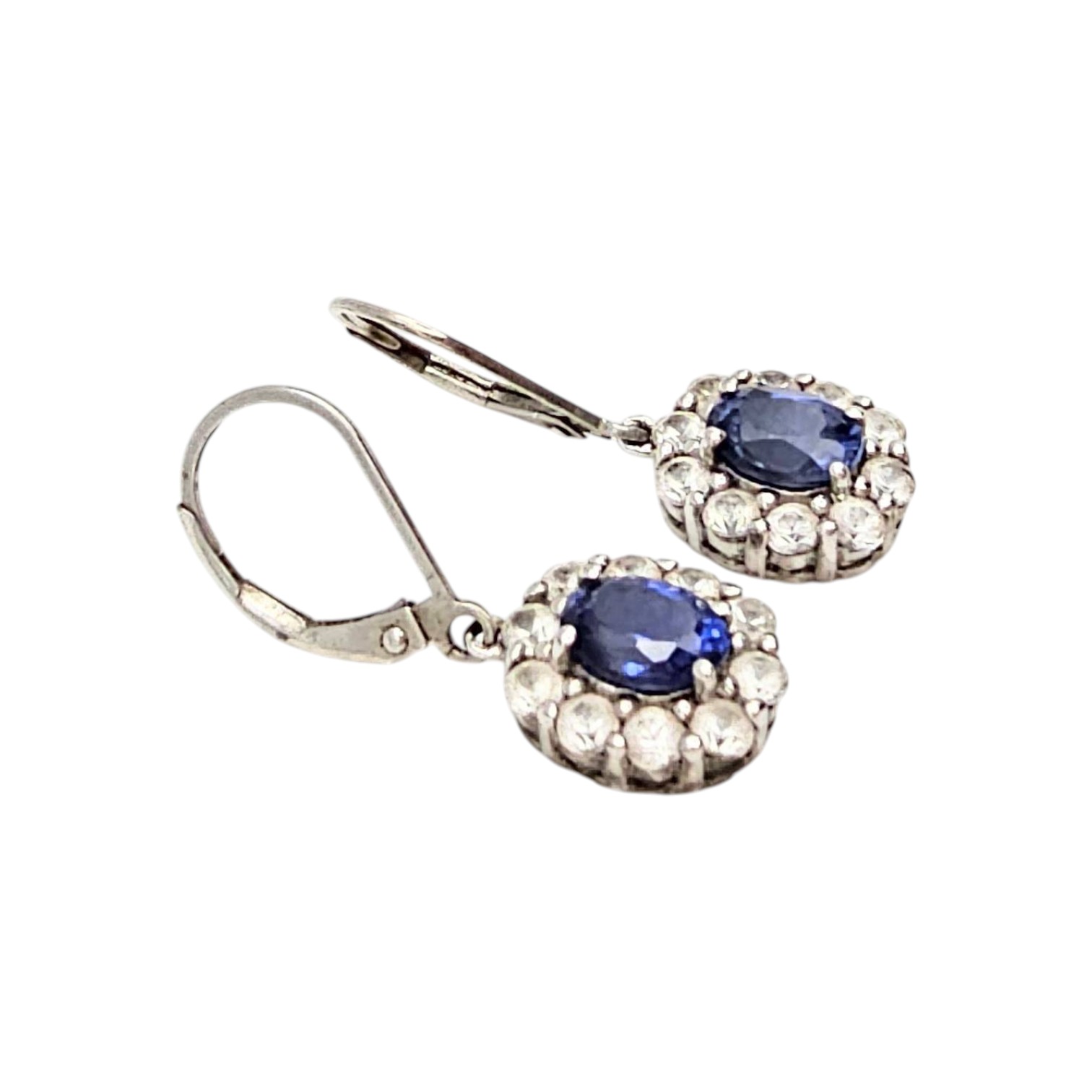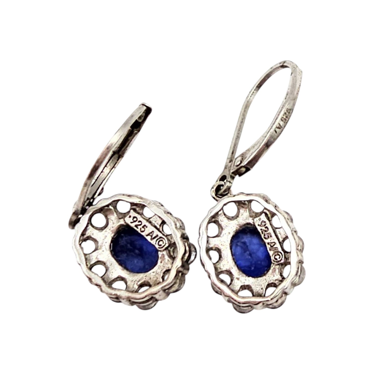 AJI drop earrings crafted in sterling silver, each featuring an oval-shaped blue stone surrounded by a halo of clear accents. The earrings weigh 3.9 grams and include lever-back closures for secure wear. The AJI and 925 markings are visible on the back, confirming the maker and silver purity. The size and elegant design make them suitable for versatile wear.