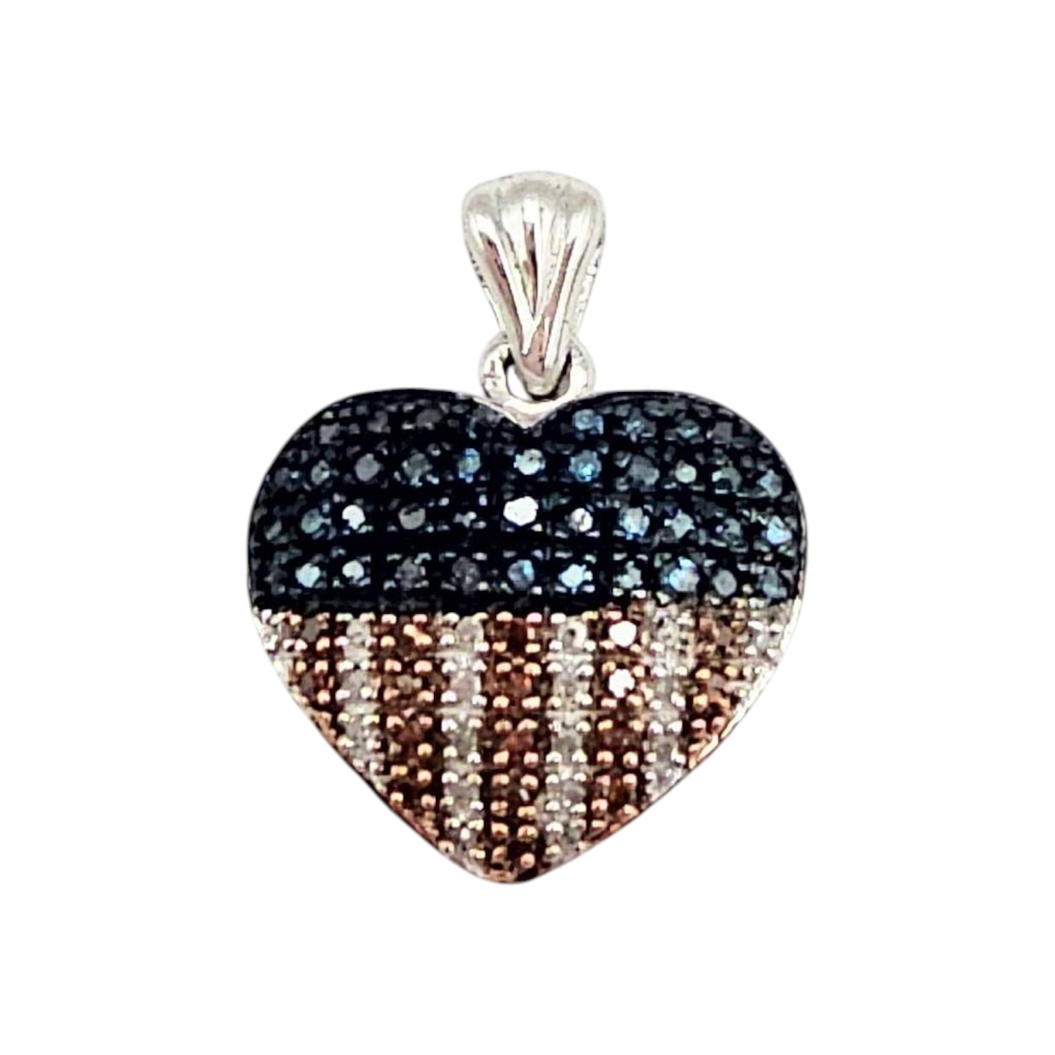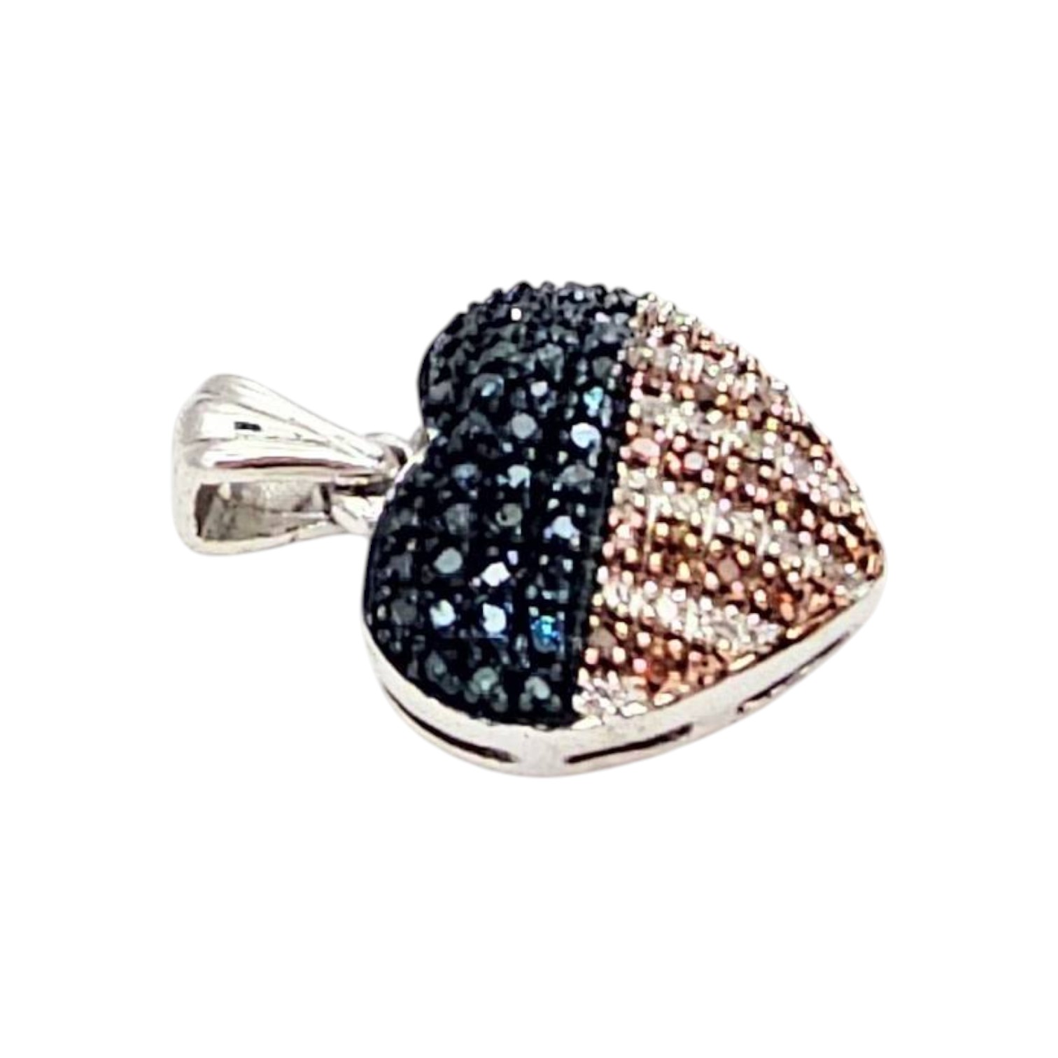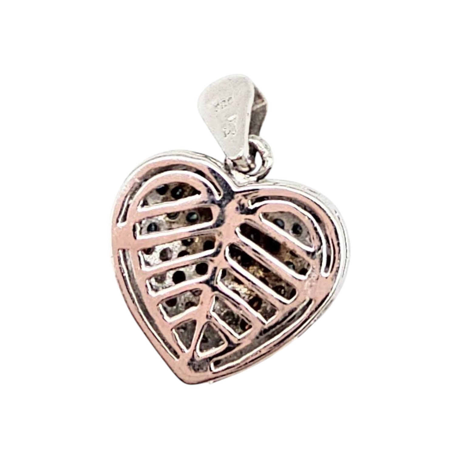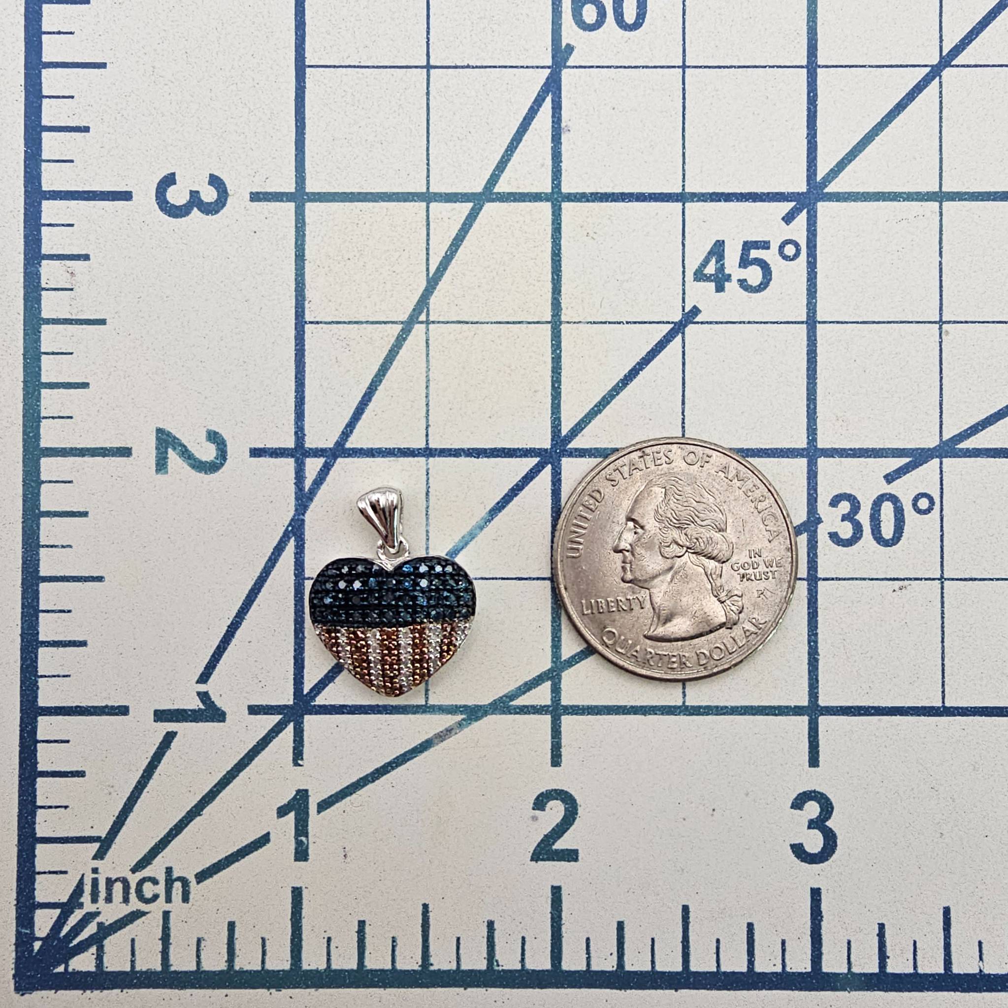 Signed sterling silver heart-shaped pendant in an American flag design, featuring blue, red, and clear diamond accents. Weighs approximately 3.4 grams. The back showcases a cutout design. Includes a bale for ease of attachment to chains. Excellent craftsmanship and suitable for various chain styles.