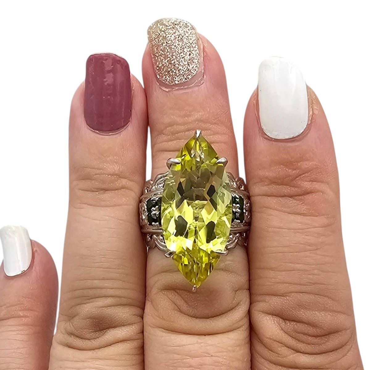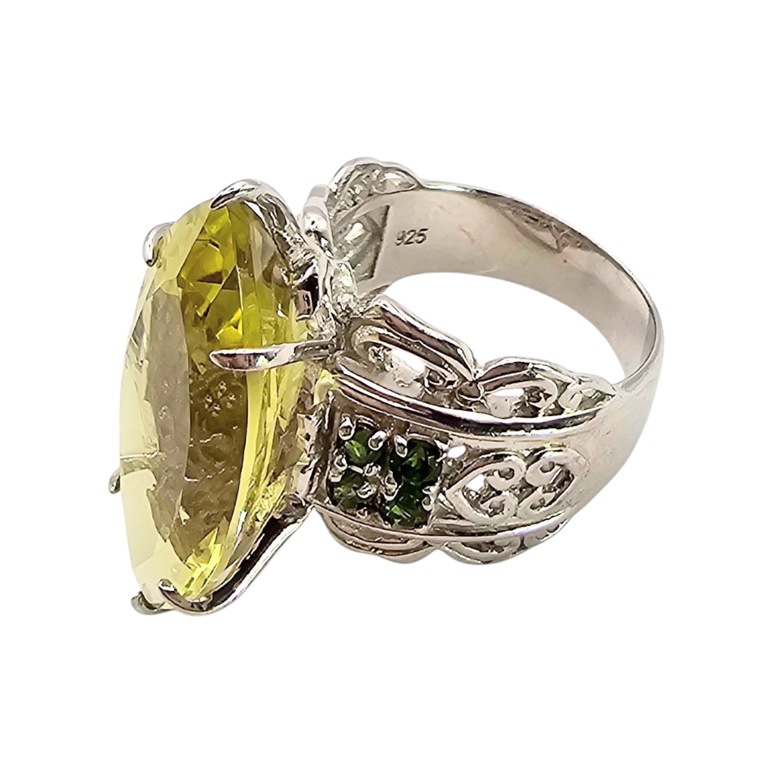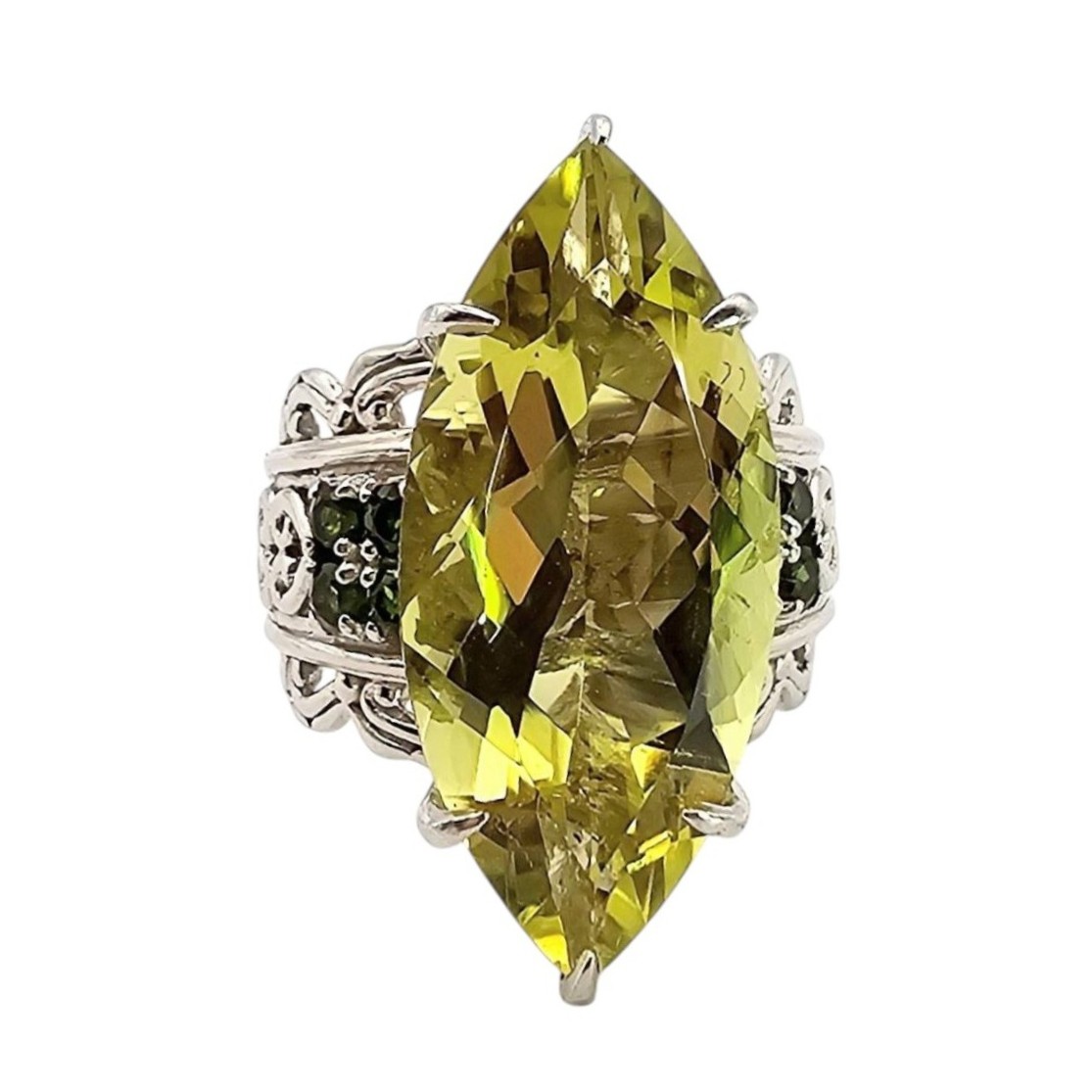 D’Joy sterling silver ring featuring a marquise-cut peridot centerpiece surrounded by green tourmaline accents. The ring band features intricate decorative detailing, stamped with ‘925’ for sterling silver authenticity. Weighing 10.2 grams and sized at 6.5, this elegant ring combines vibrant gemstones with high-quality craftsmanship.