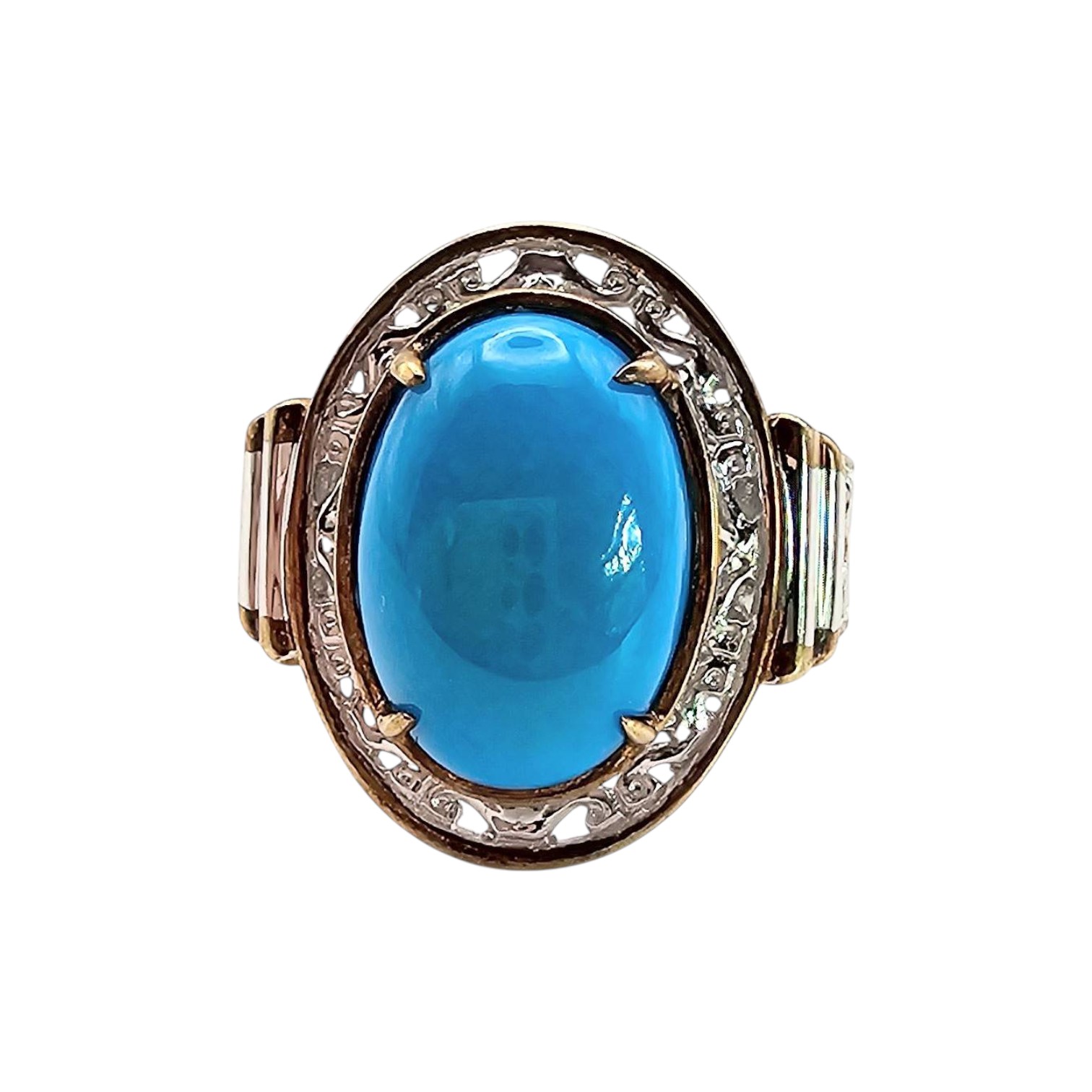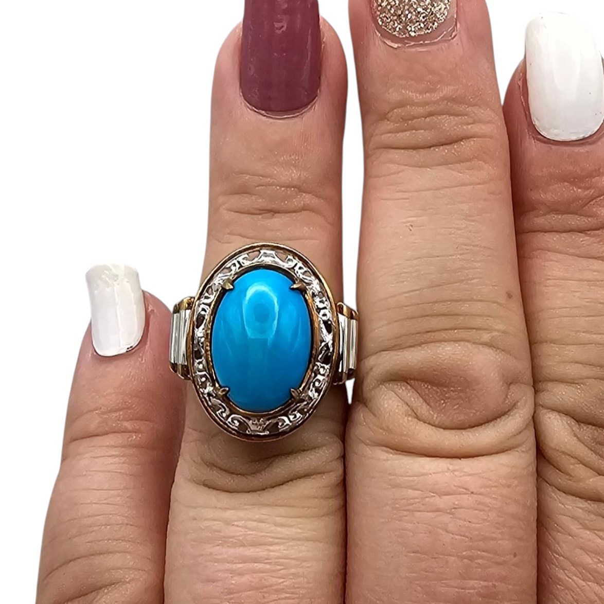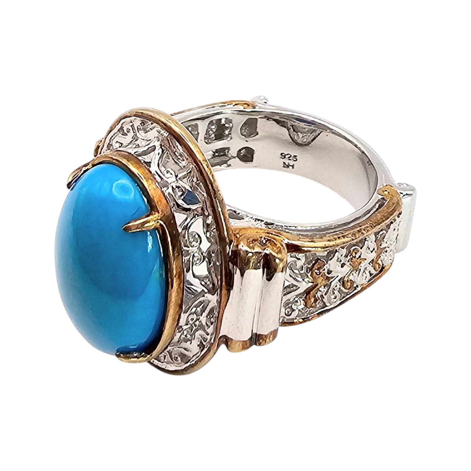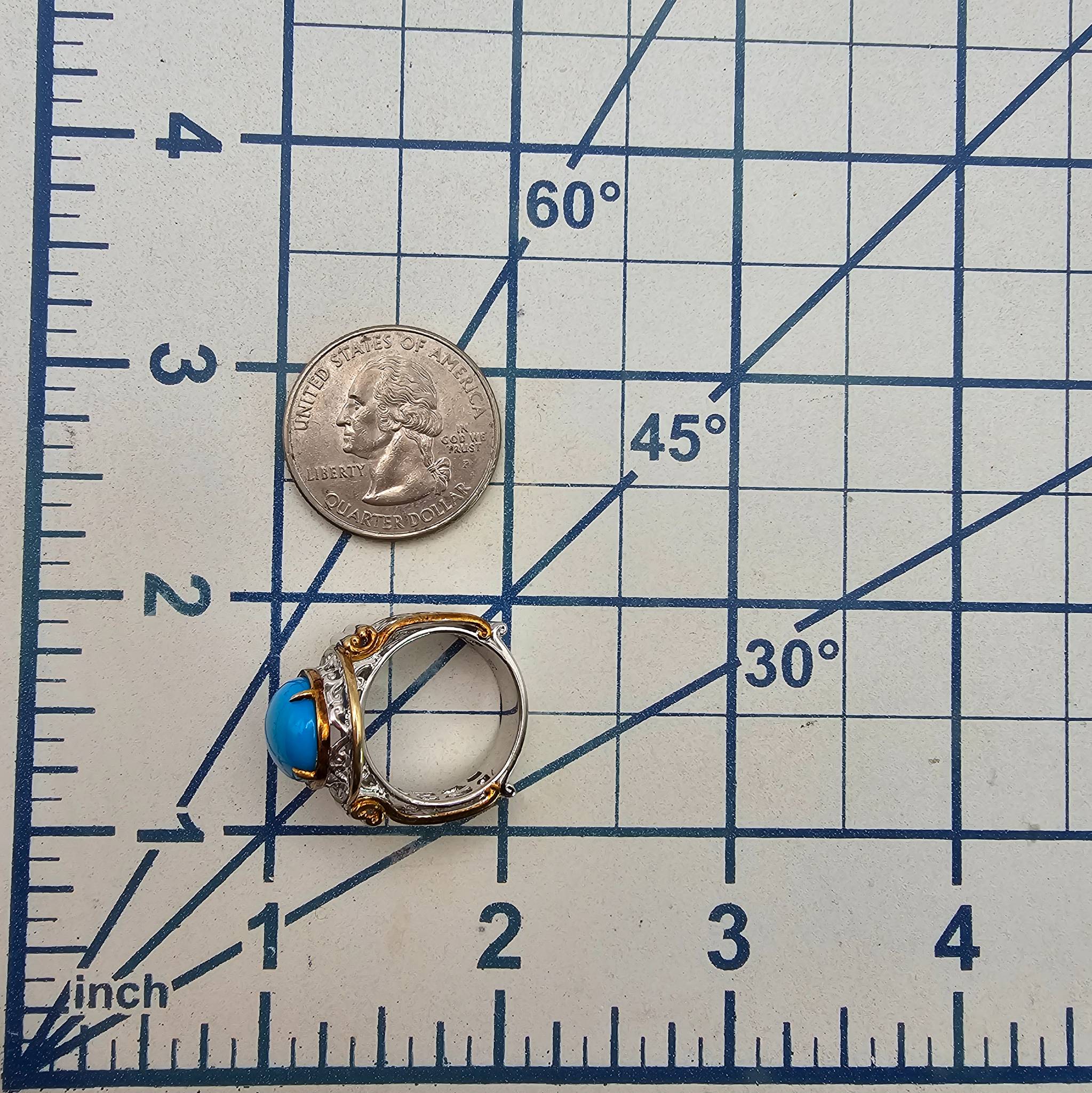 Sterling silver ring hallmarked with ‘925’ and signed. Features a vibrant oval turquoise center stone, framed by detailed accents surrounding the setting. Weighs approximately 7.1 grams and is a size 5.5. Constructed with two-tone metalwork and detailed craftsmanship.