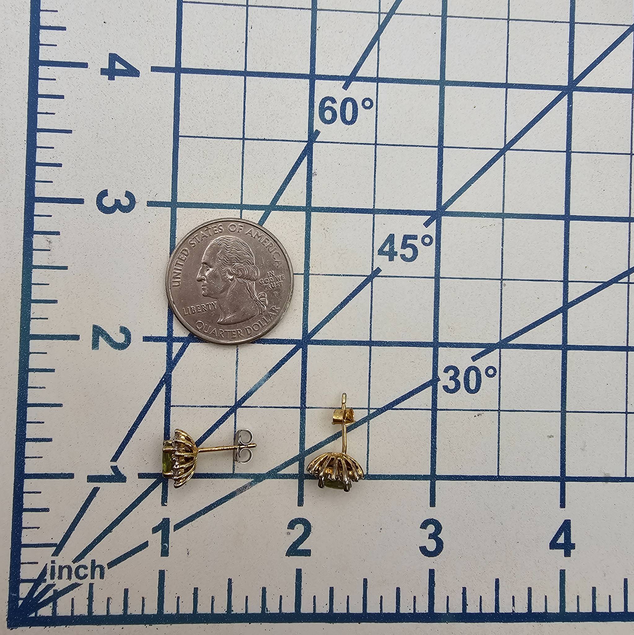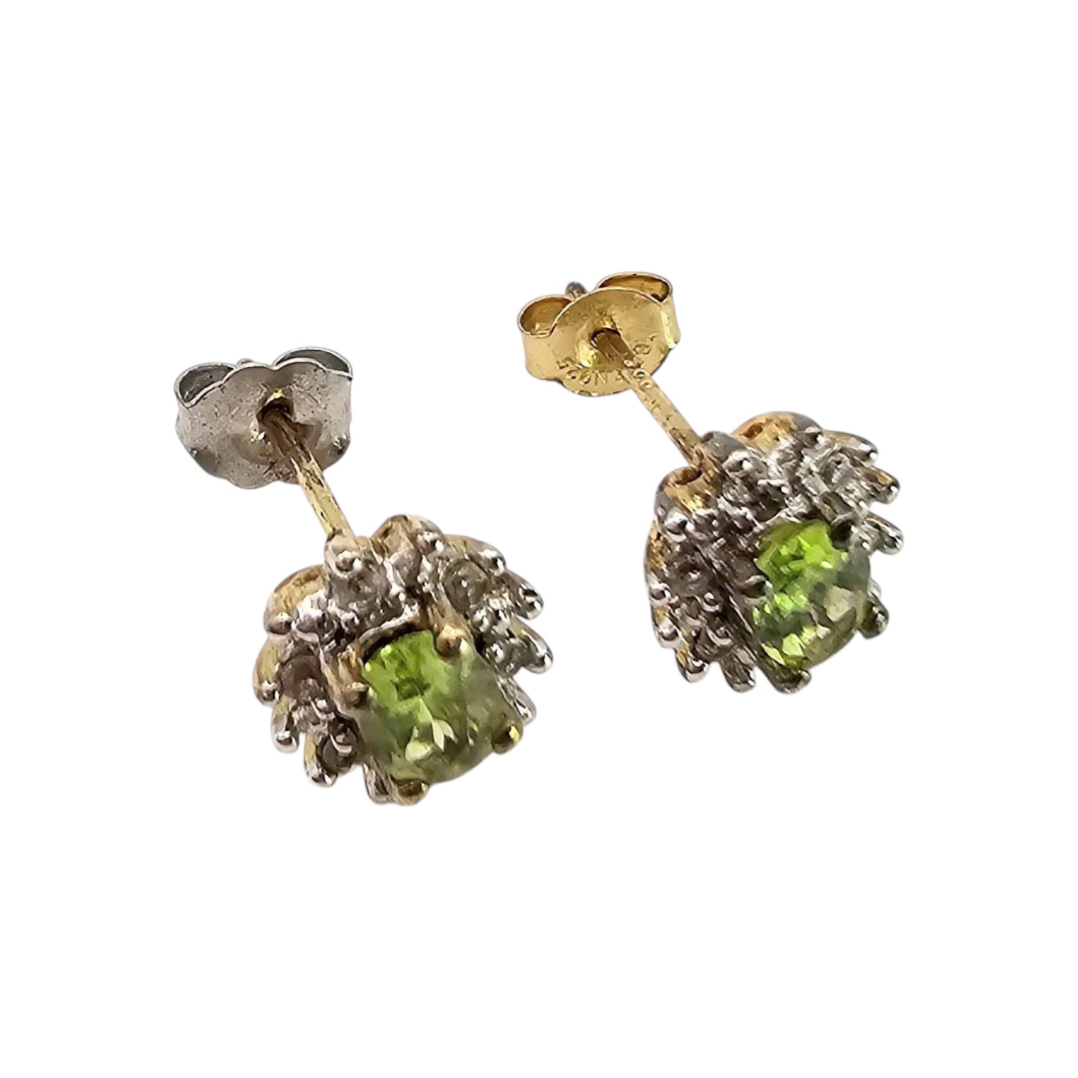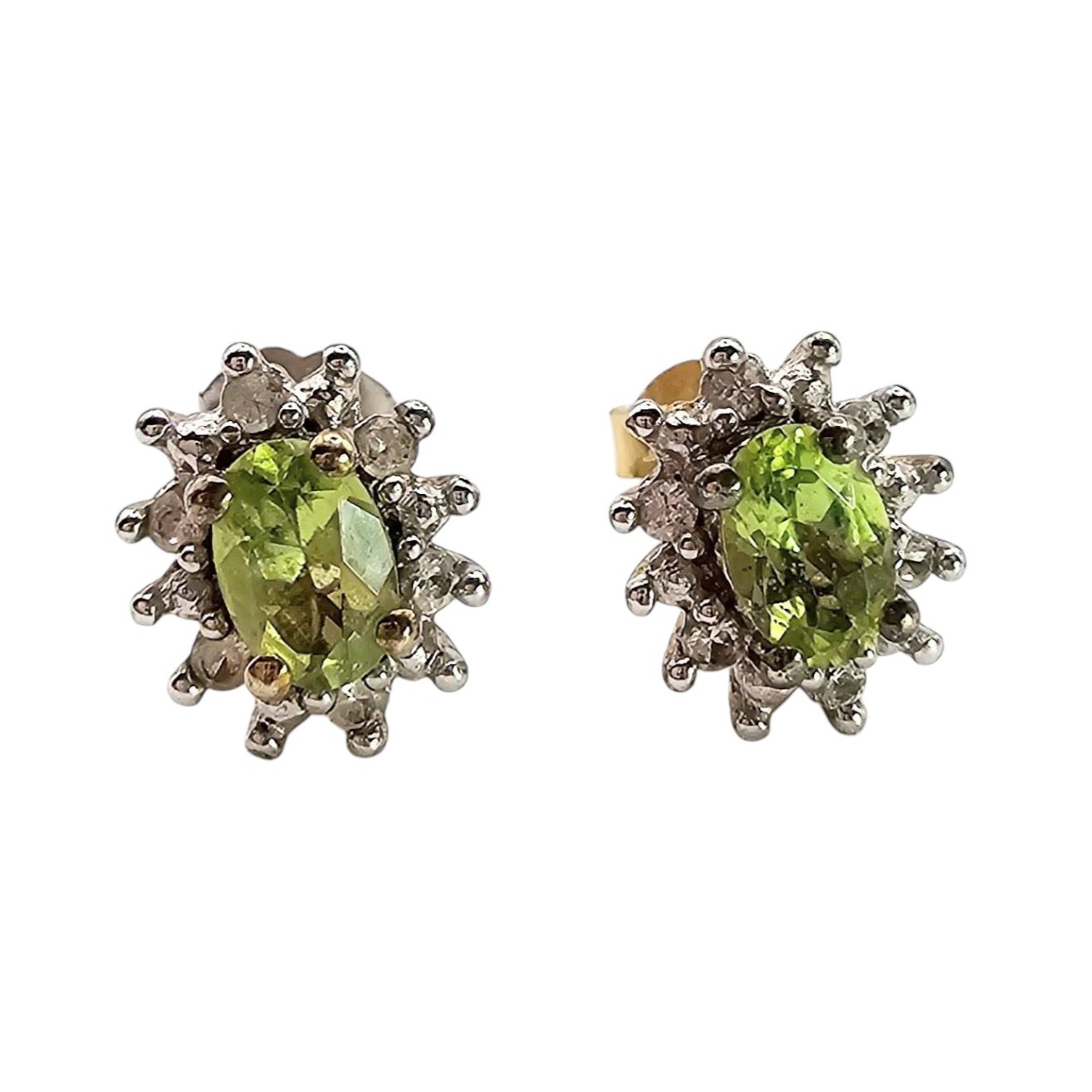 Stud earrings featuring oval-shaped peridot gemstones mounted on sterling silver settings stamped ‘925’. The earrings are enhanced with a halo of silver accents and have a combined weight of approximately 2.2 grams. The earrings measure approximately a quarter inch in diameter. Includes standard silver-tone butterfly backs.