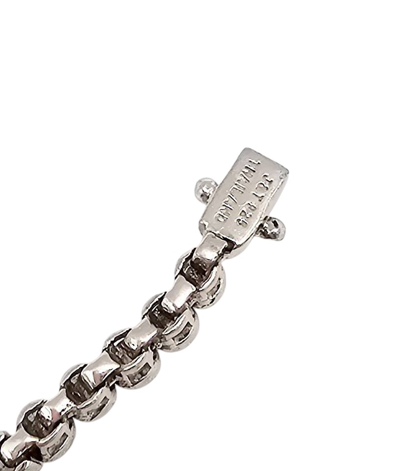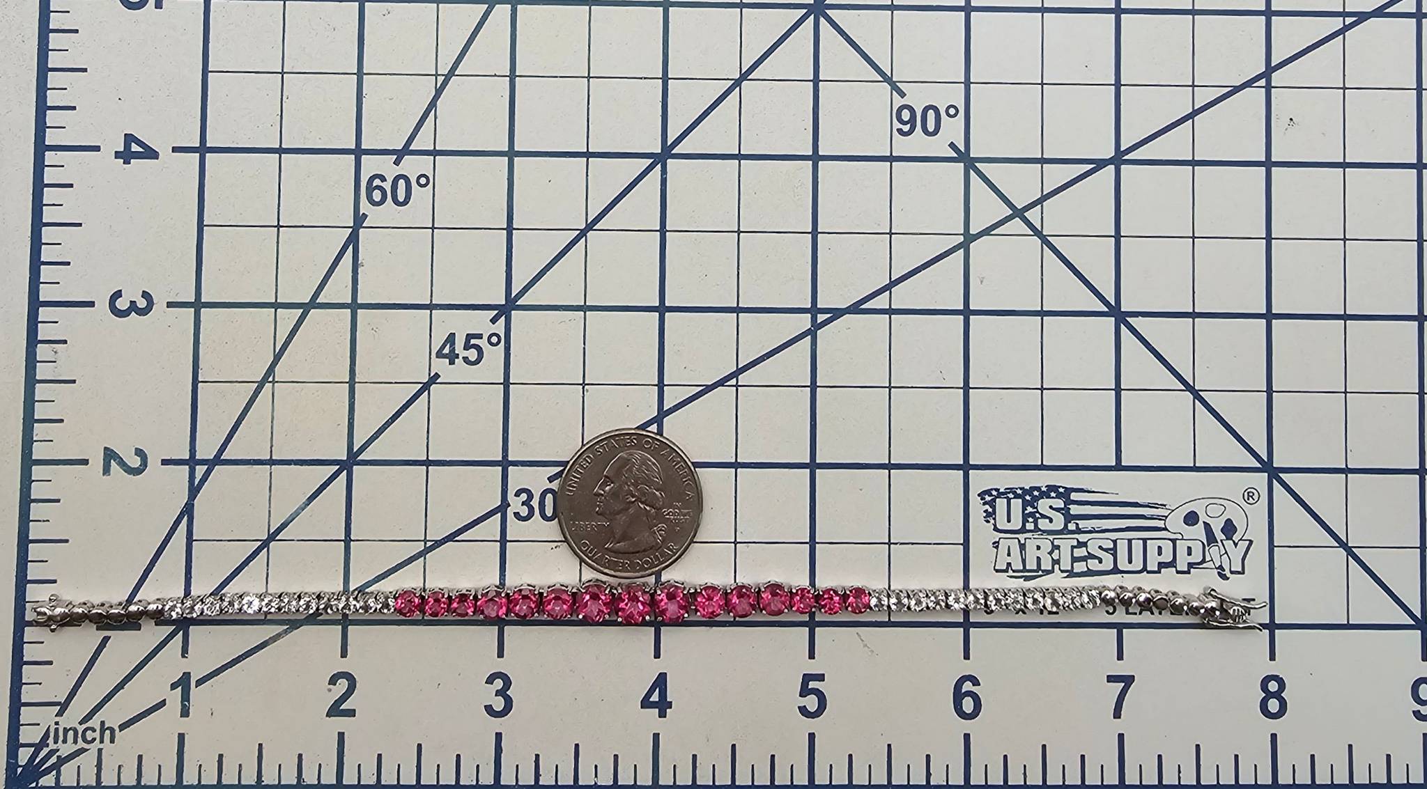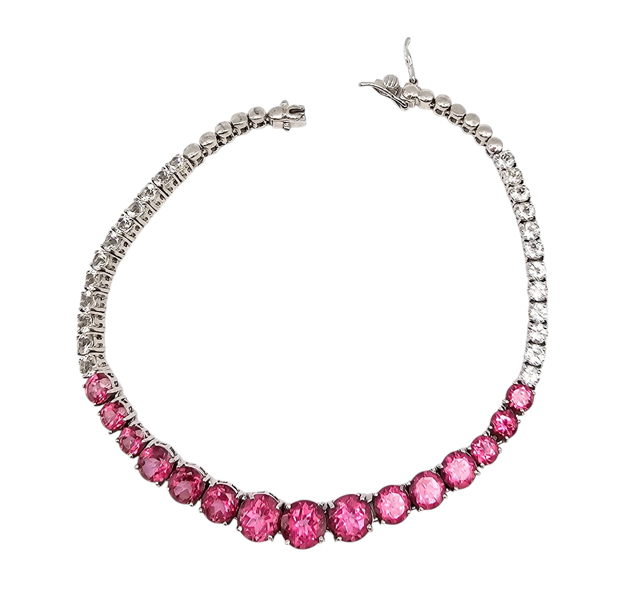 J&T sterling silver tennis bracelet featuring pink and white topaz stones. The bracelet is marked ‘925’ and measures approximate inches shown with ruler. The design incorporates a series of pink oval-cut topaz stones flanked by white topaz accents. Secure clasp closure. A refined and elegant jewelry piece. 10.6 grams.