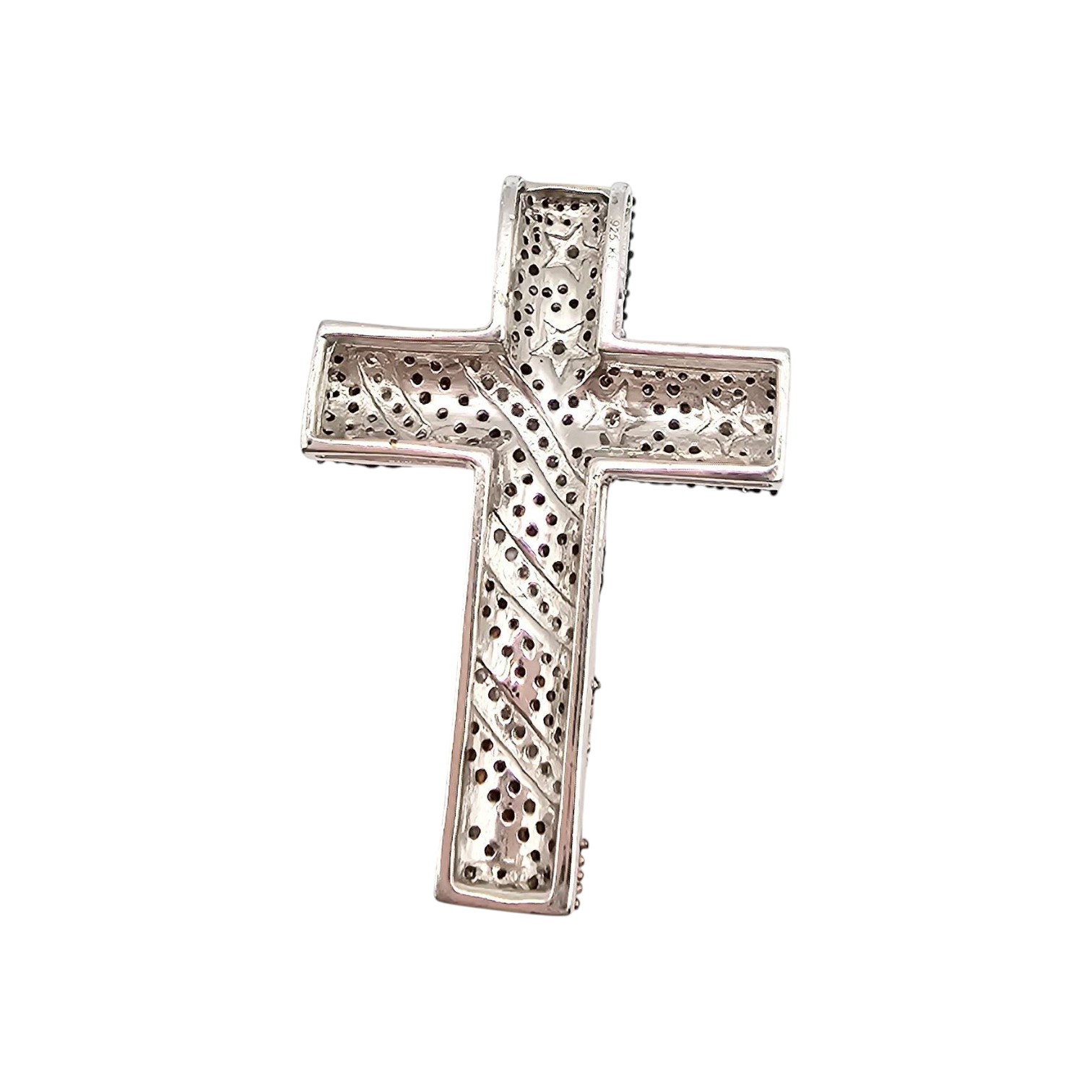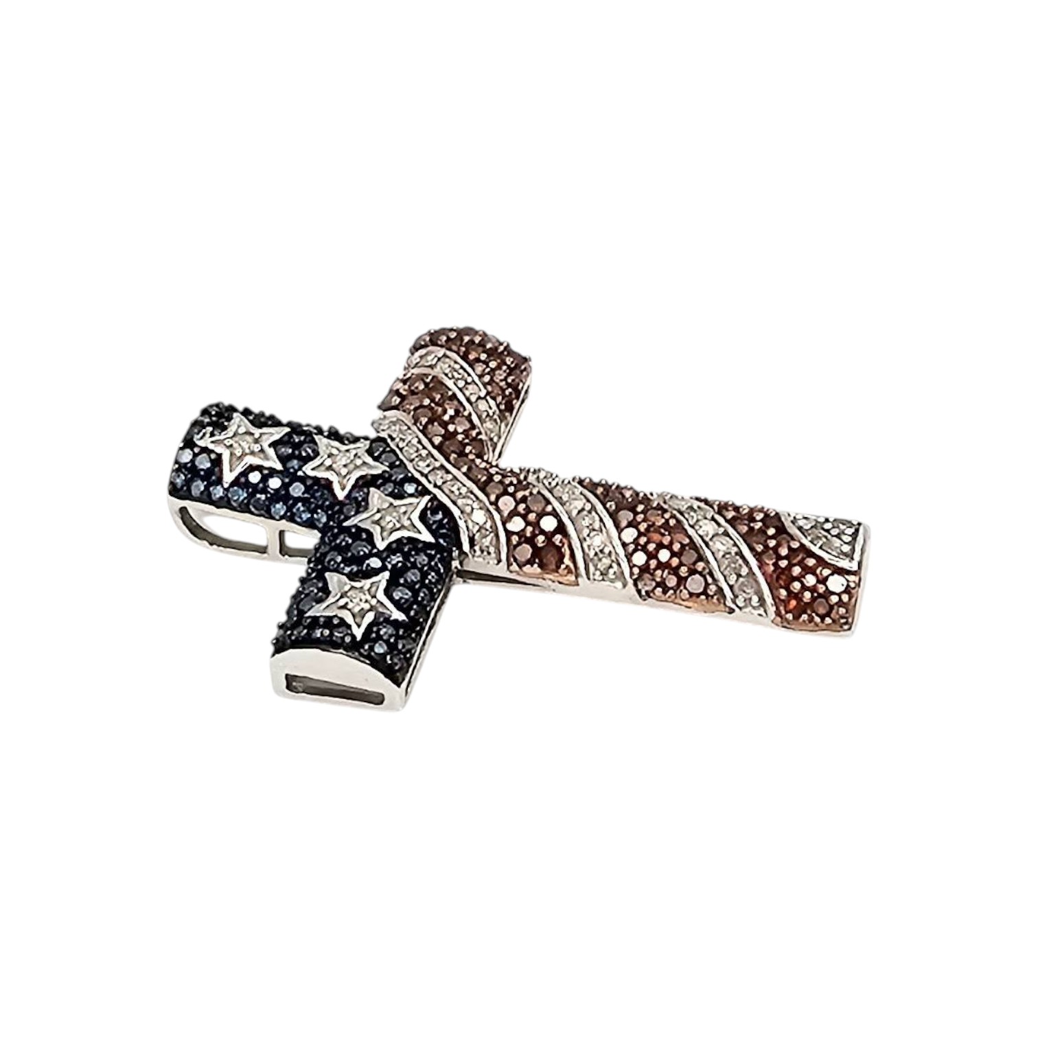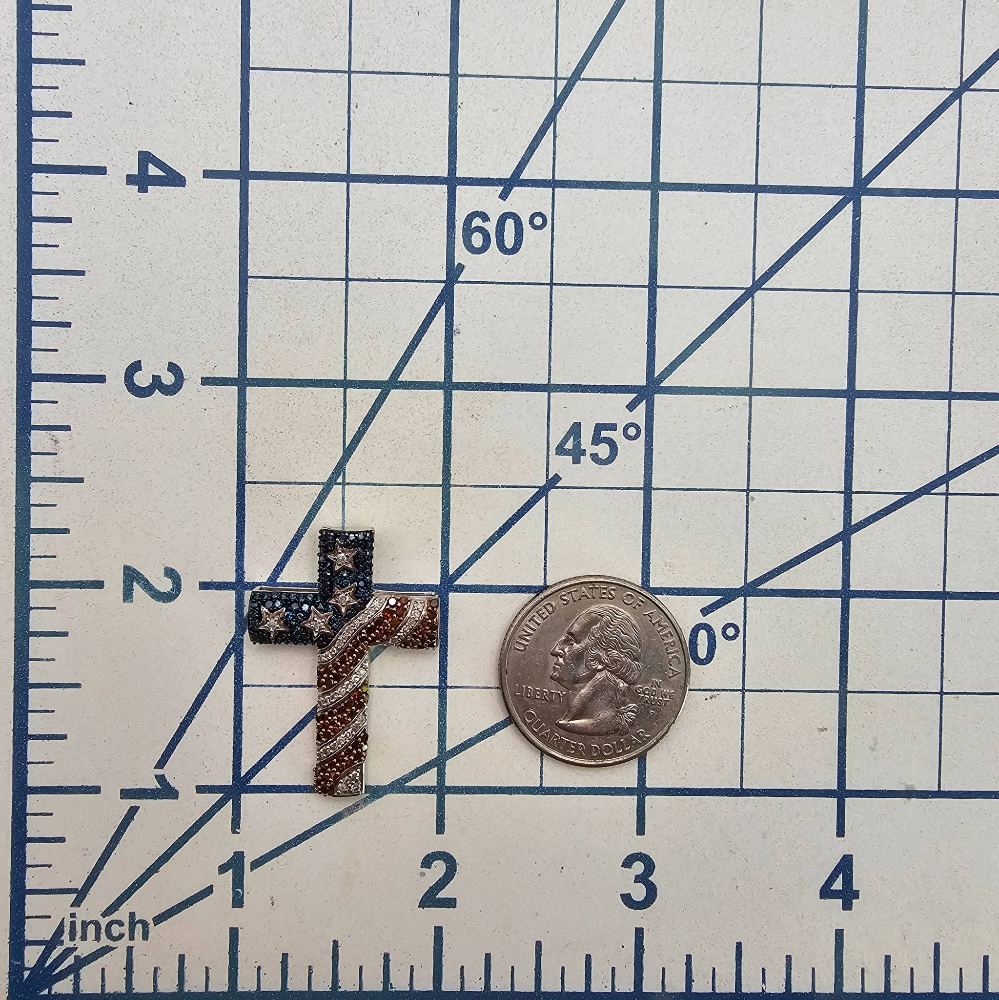 Sterling silver cross pendant designed with an American flag motif, featuring blue, red, and white embellishments to mimic the flag’s stars and stripes. Marked 925, indicating sterling silver construction. Approximate weight of 4 grams. Elegant and patriotic design. Quarter shown for size comparison.