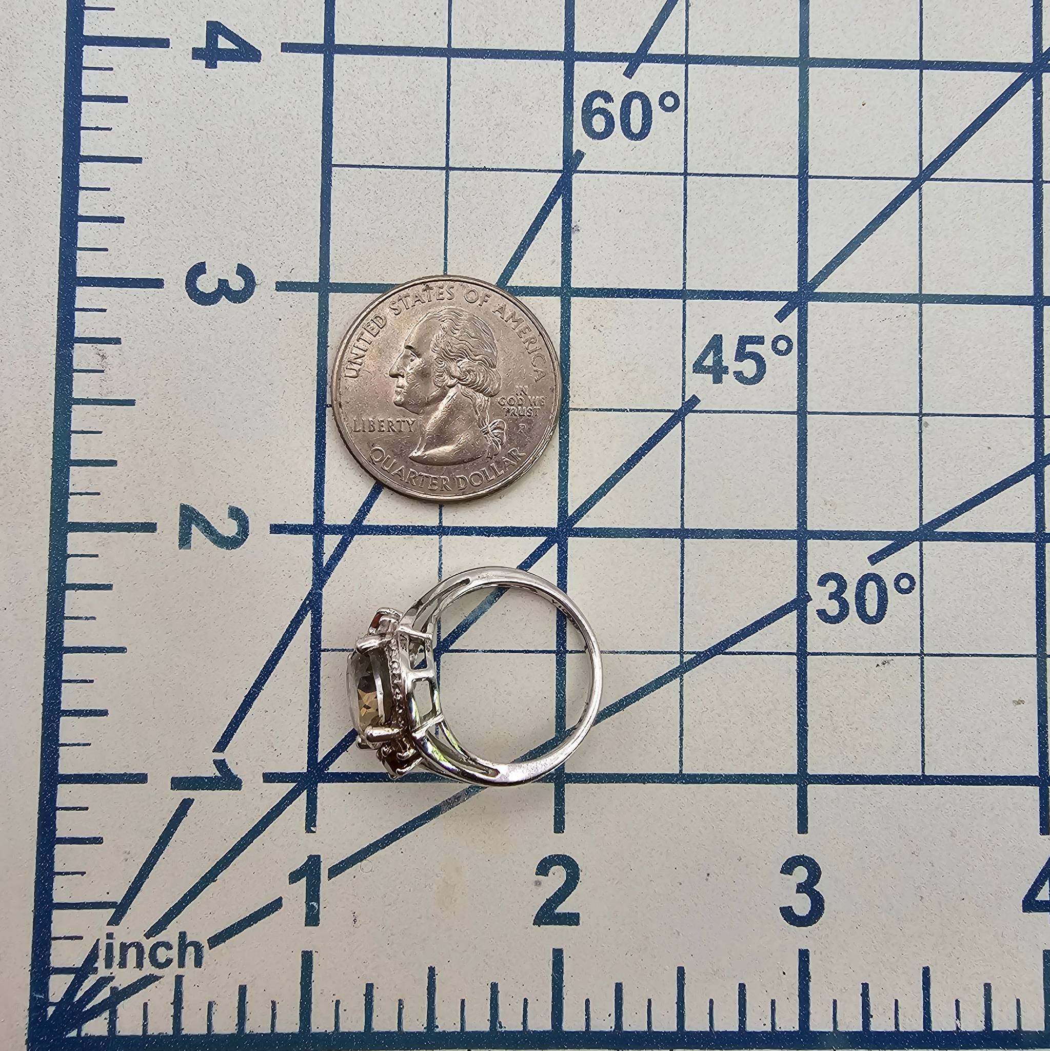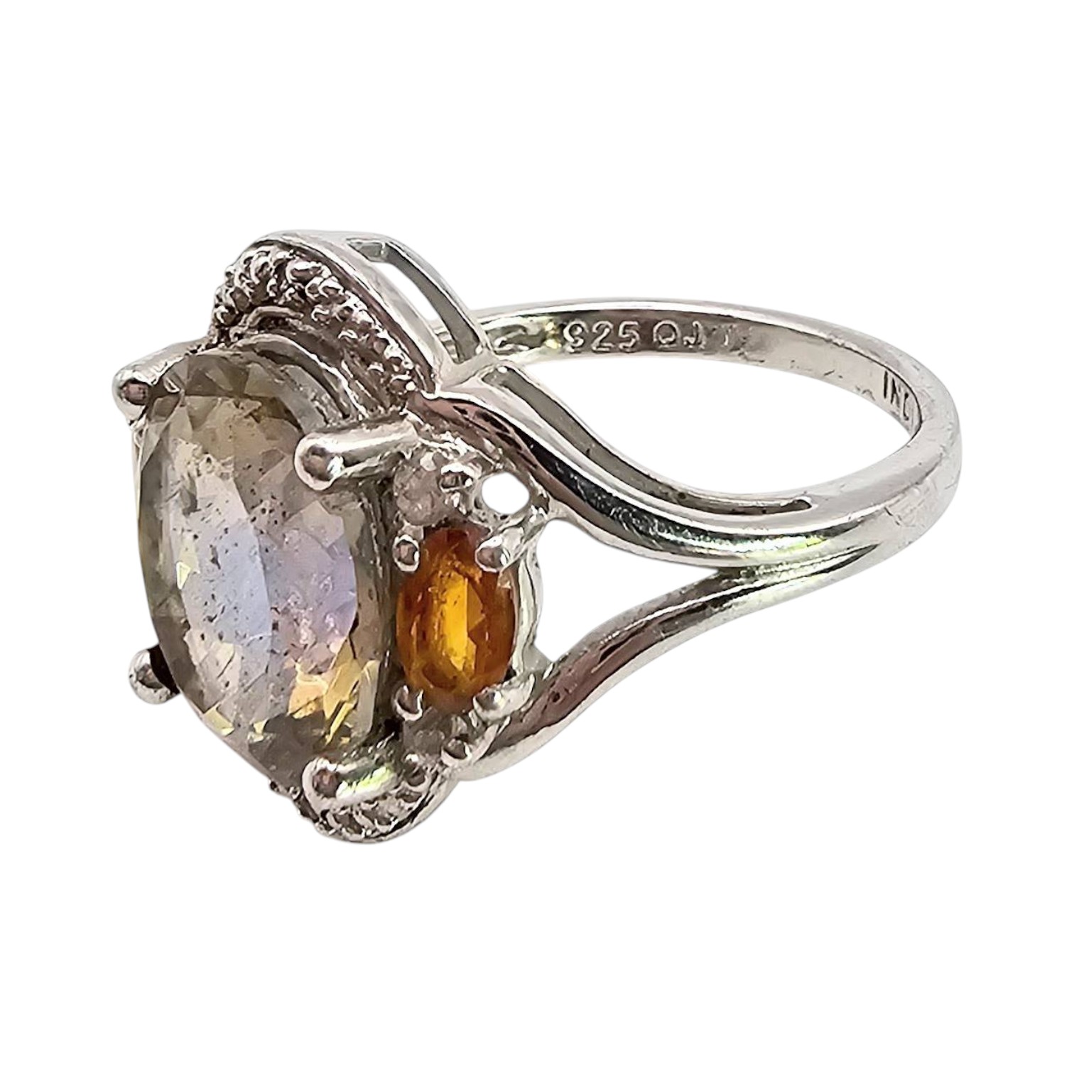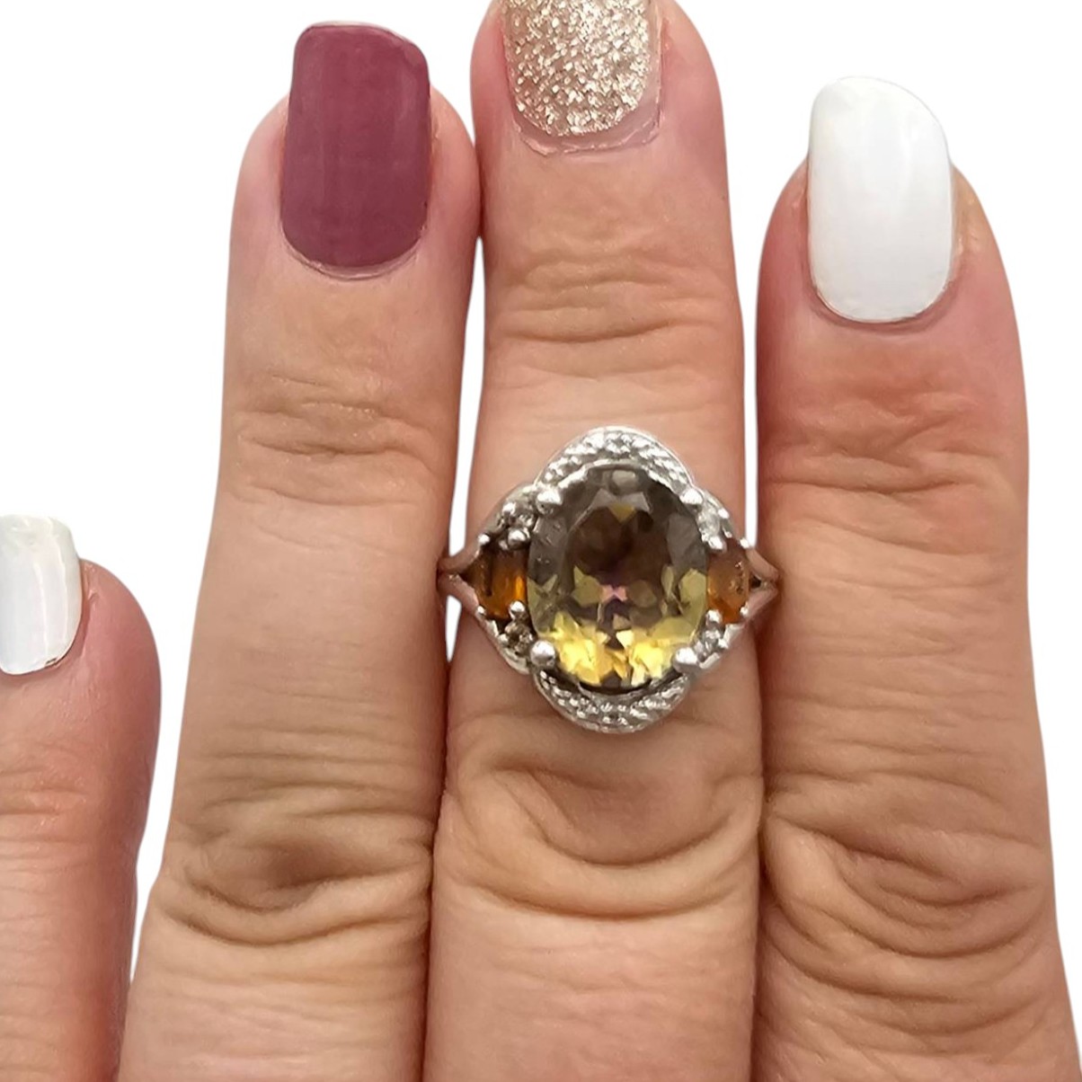 Sterling silver ring marked ‘QJ 925’ with a central faceted oval gemstone flanked by two smaller gemstones. Features decorative detailing around the main setting. Size 6.5 and weighs 4.8 grams. Includes yellow and clear stones, with an intricate setting design. Measures approximately 1 inch in length. Suitable for jewelry collectors.