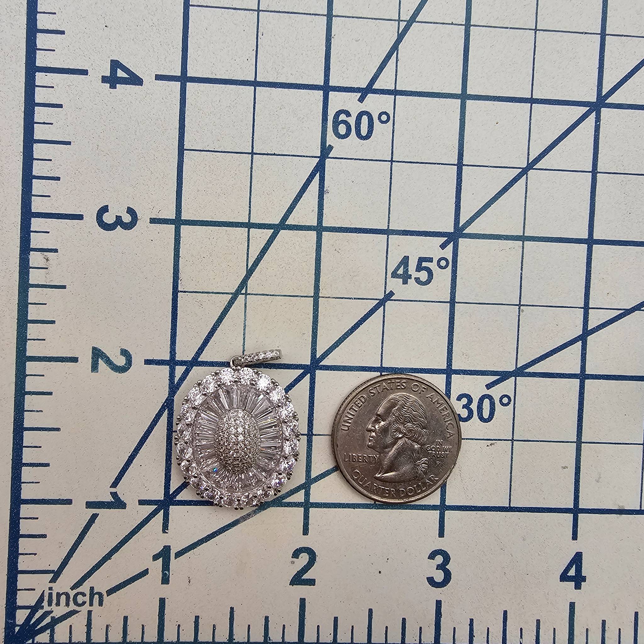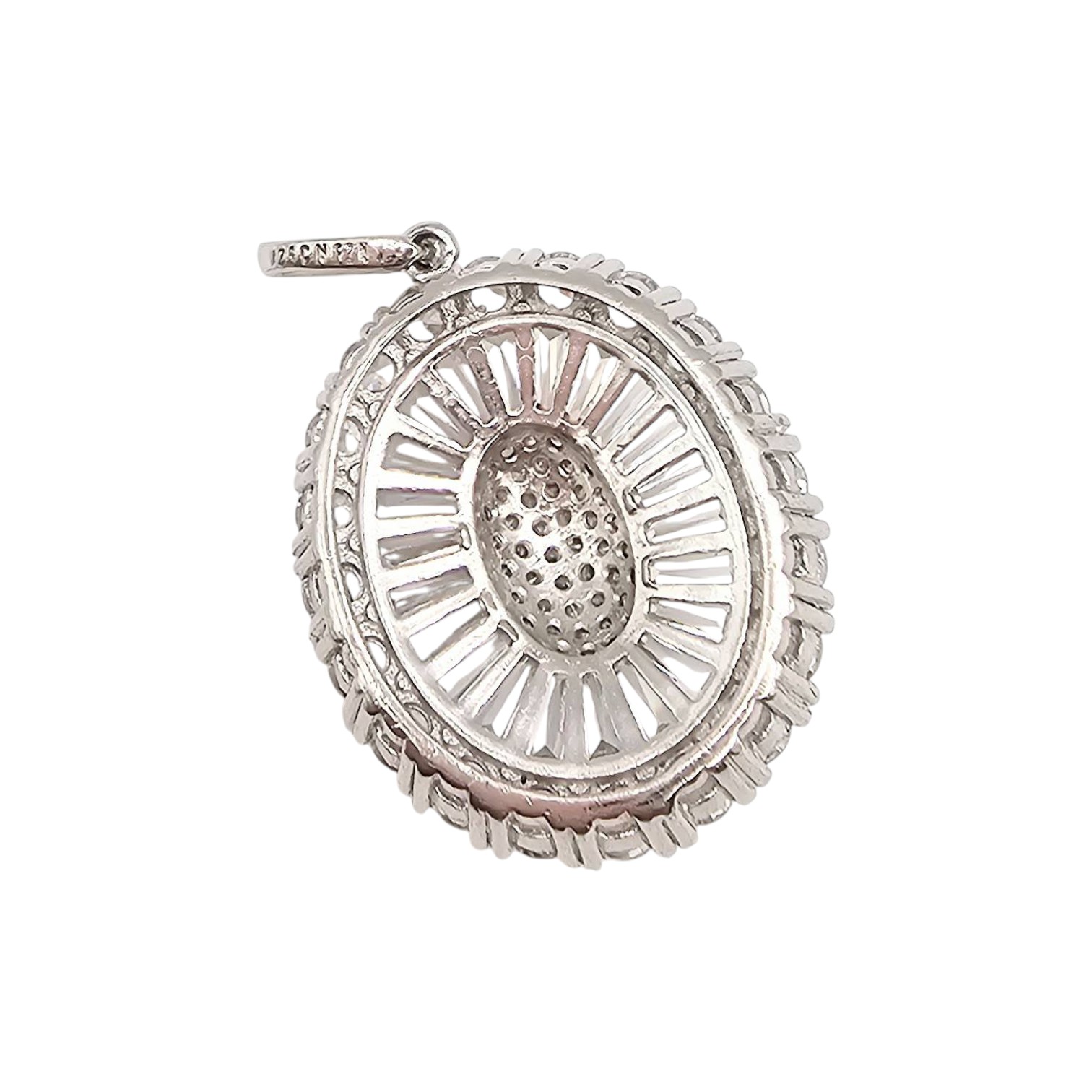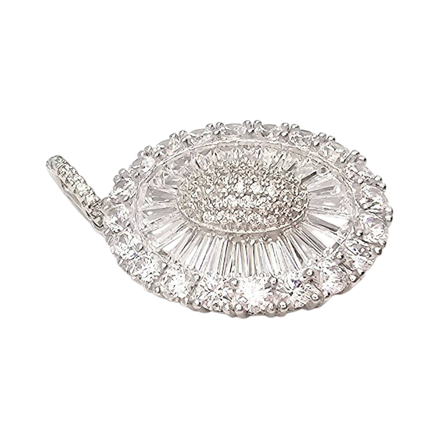 FZN sterling silver pendant featuring clear stones in an oval design. The piece weighs 5.8 grams and showcases intricate detailing with a central cluster surrounded by baguette-style stones and a border of additional clear stones. The pendant includes a textured bail for chain attachment.