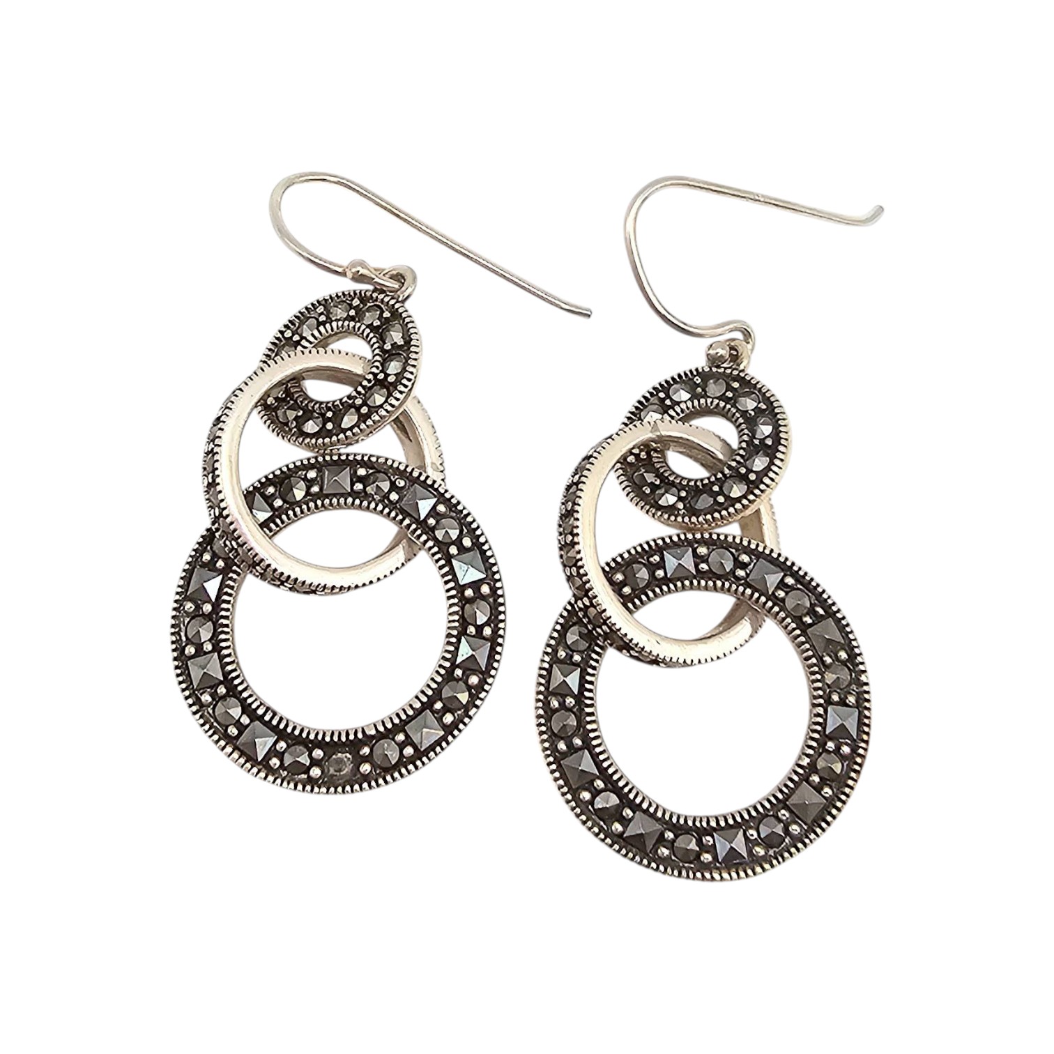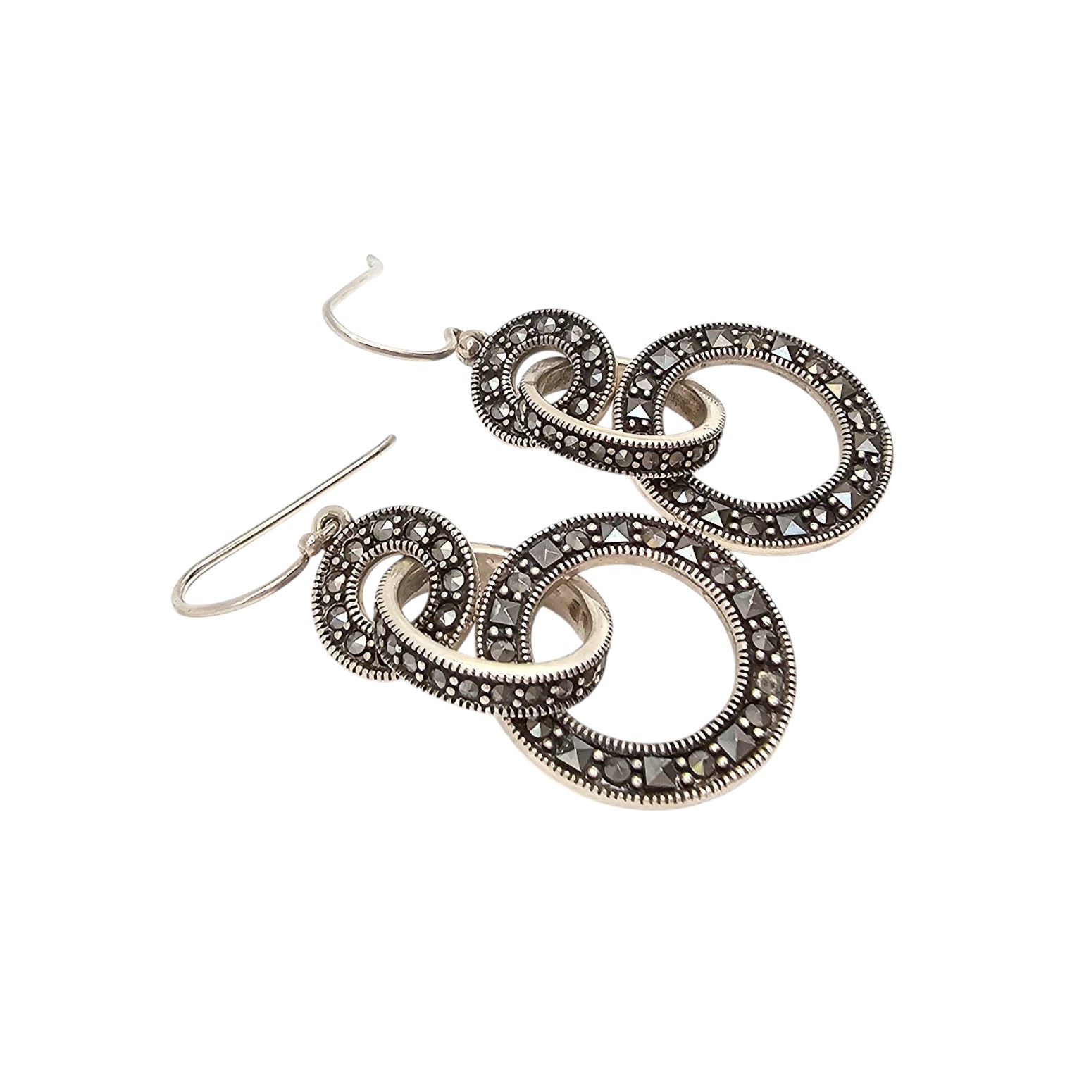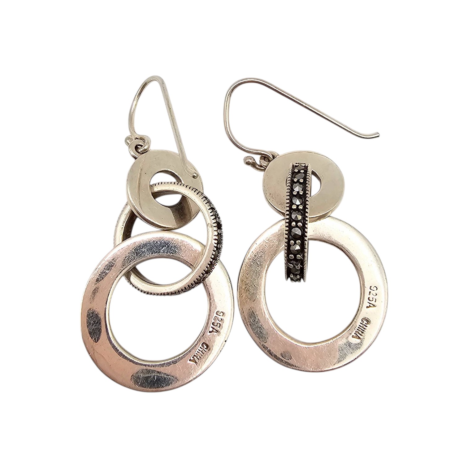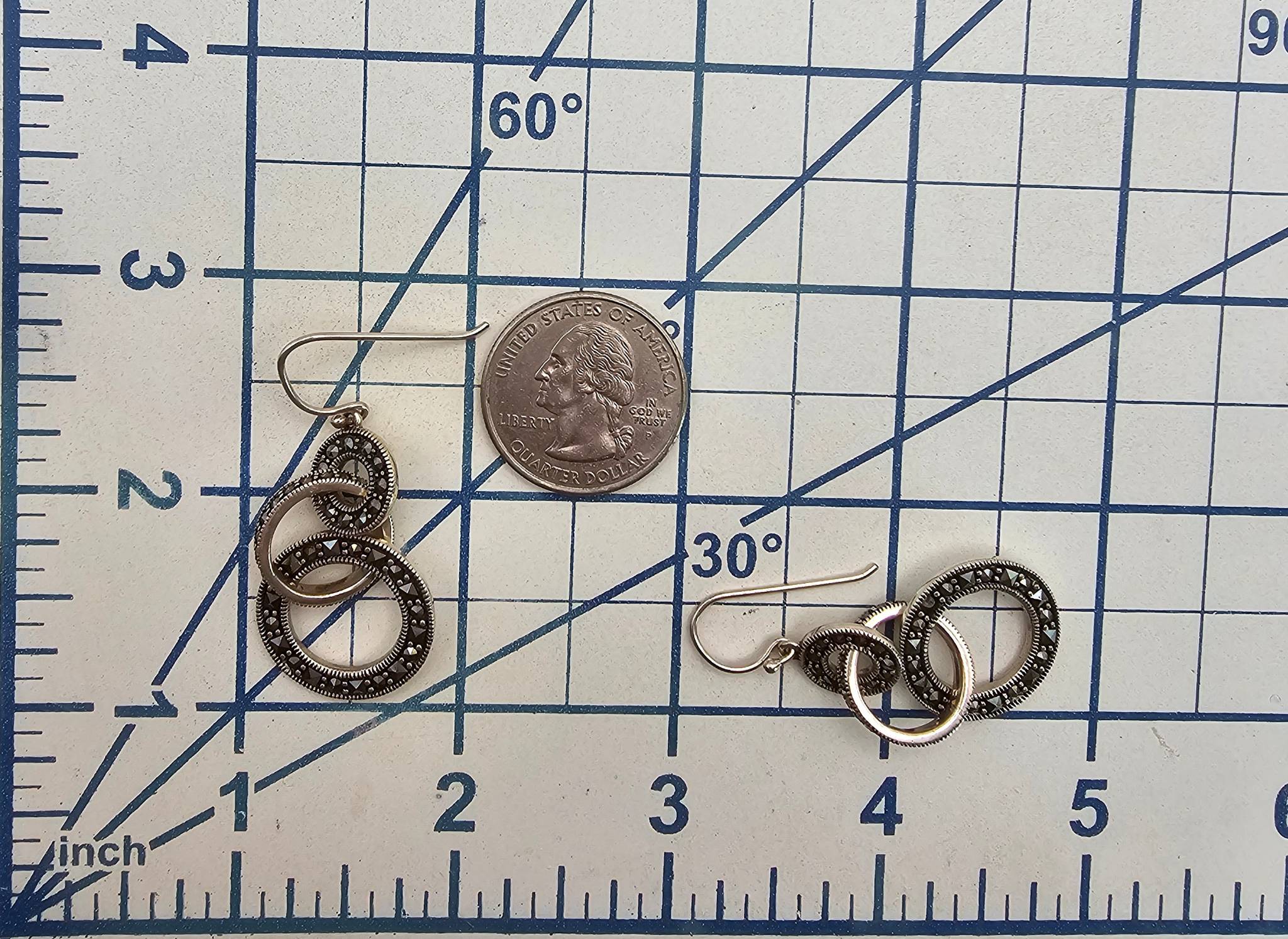 Sterling silver drop earrings featuring a circular design adorned with marcasite accents. The earrings are lightweight, weighing 10.9 grams. They have a hook closure and are in good condition, showing light wear consistent with use. Measures approximately 2.5 inches in length.