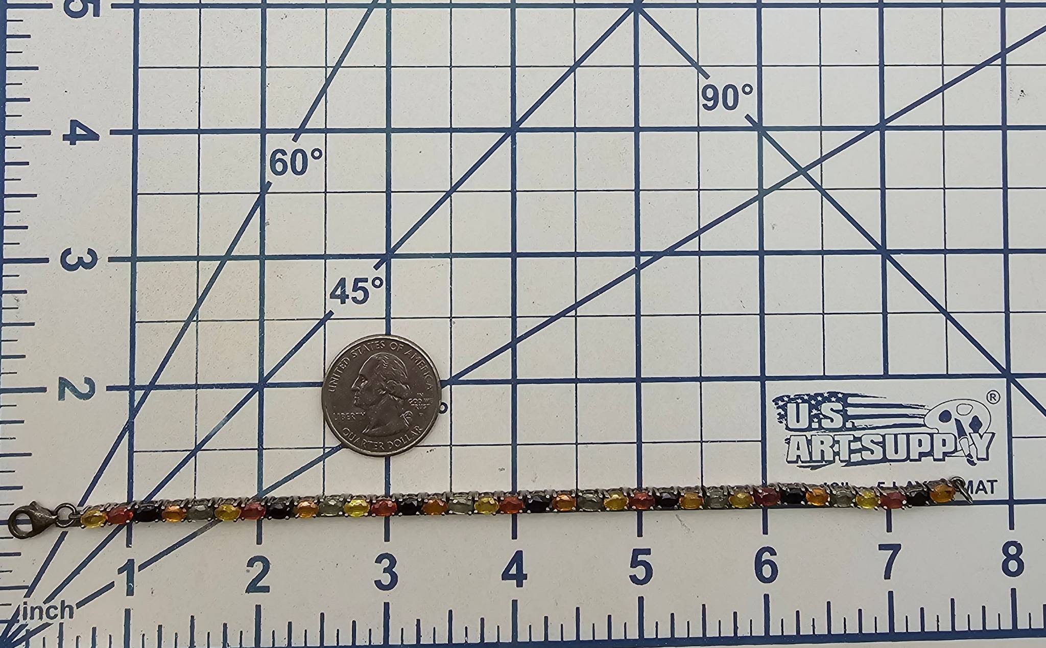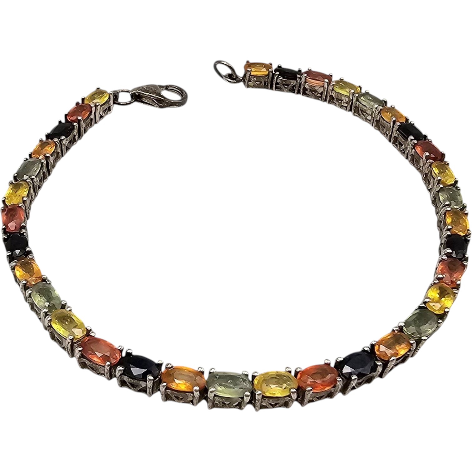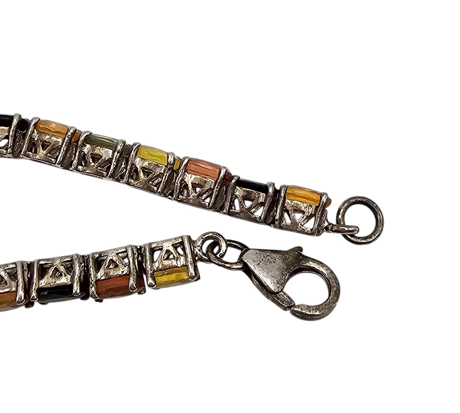 A sterling silver tennis bracelet featuring multi-colored gemstones. The piece weighs 9.7 grams and exhibits alternating, bezel-set oval gemstones in hues of yellow, orange, green, and black. The bracelet is equipped with a secure lobster claw clasp. Measurements are included in the images, referencing standard ruler gauges.