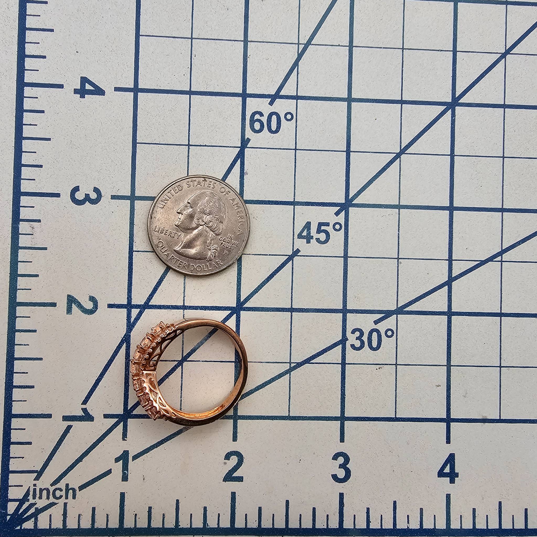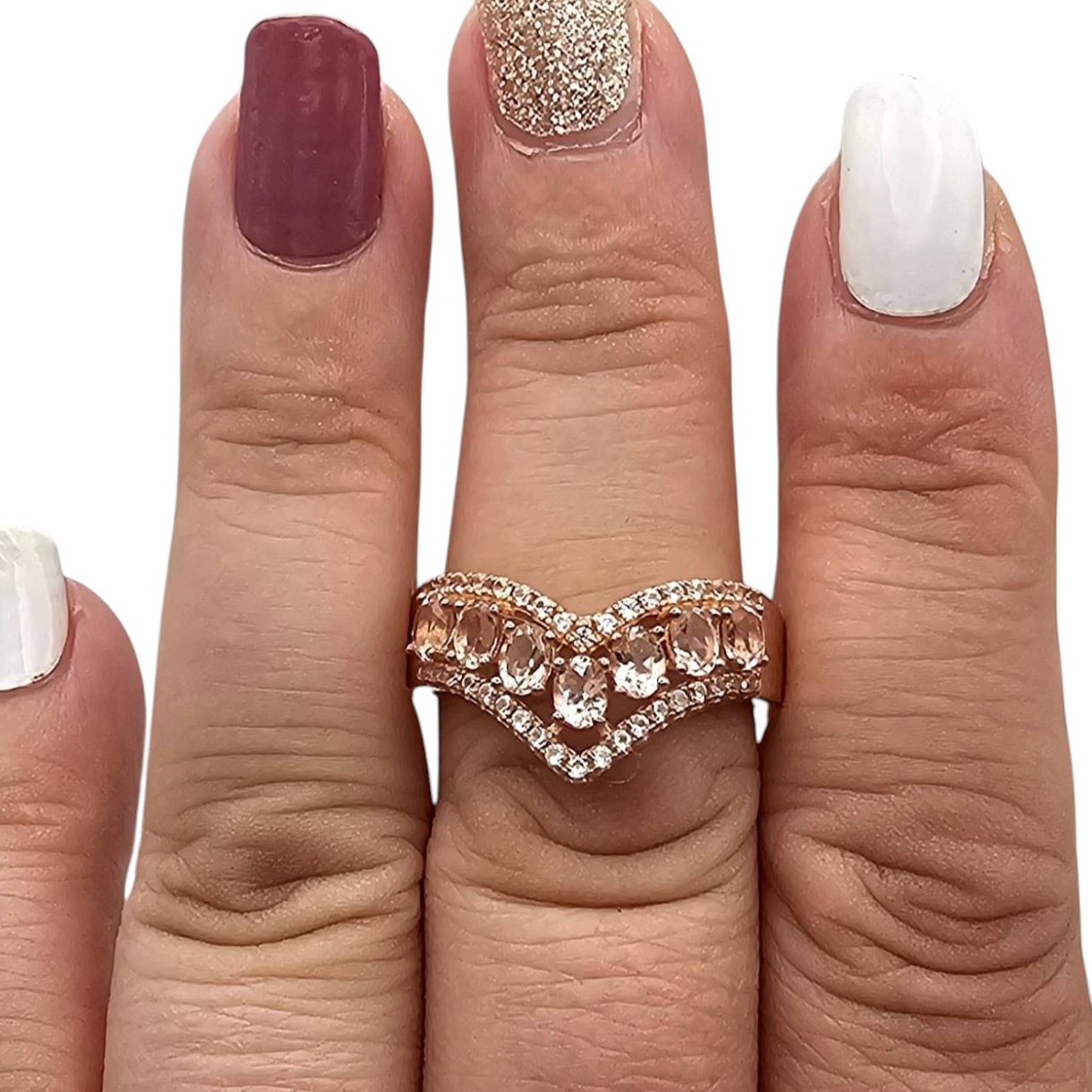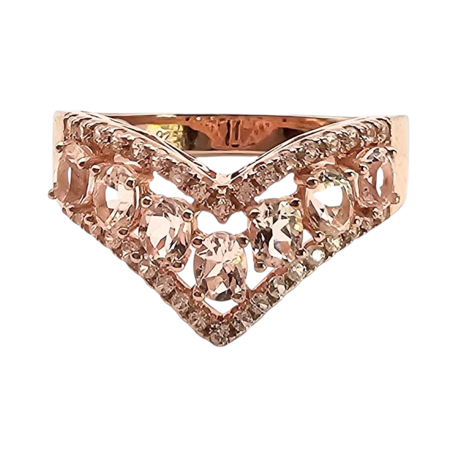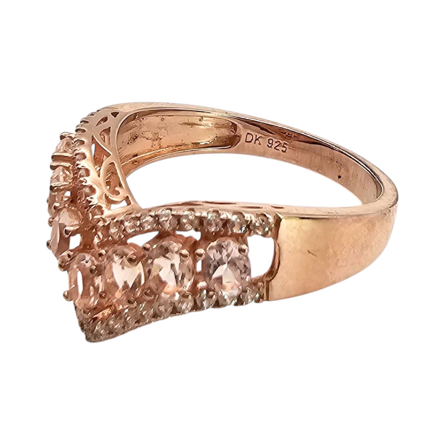 Rose gold-plated sterling silver ring featuring a V-shaped design adorned with morganite or similar pink stones and accented with petite clear gemstones. The ring is marked ‘DK 925,’ indicating sterling silver, weighs 4.1 grams, and is a size 9.5. Its elegant rose tone complements the stones for a refined look.