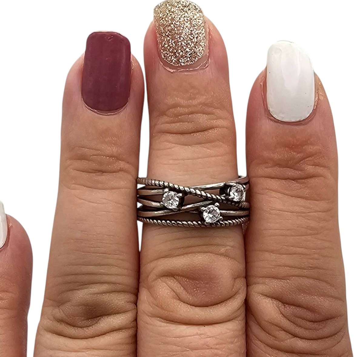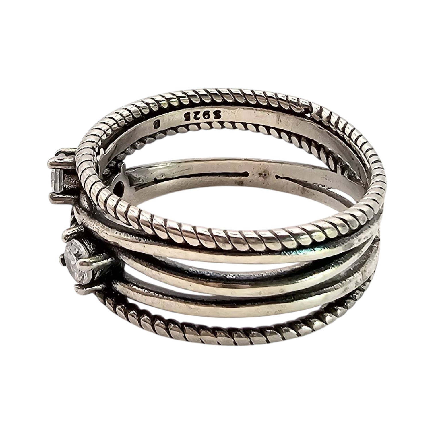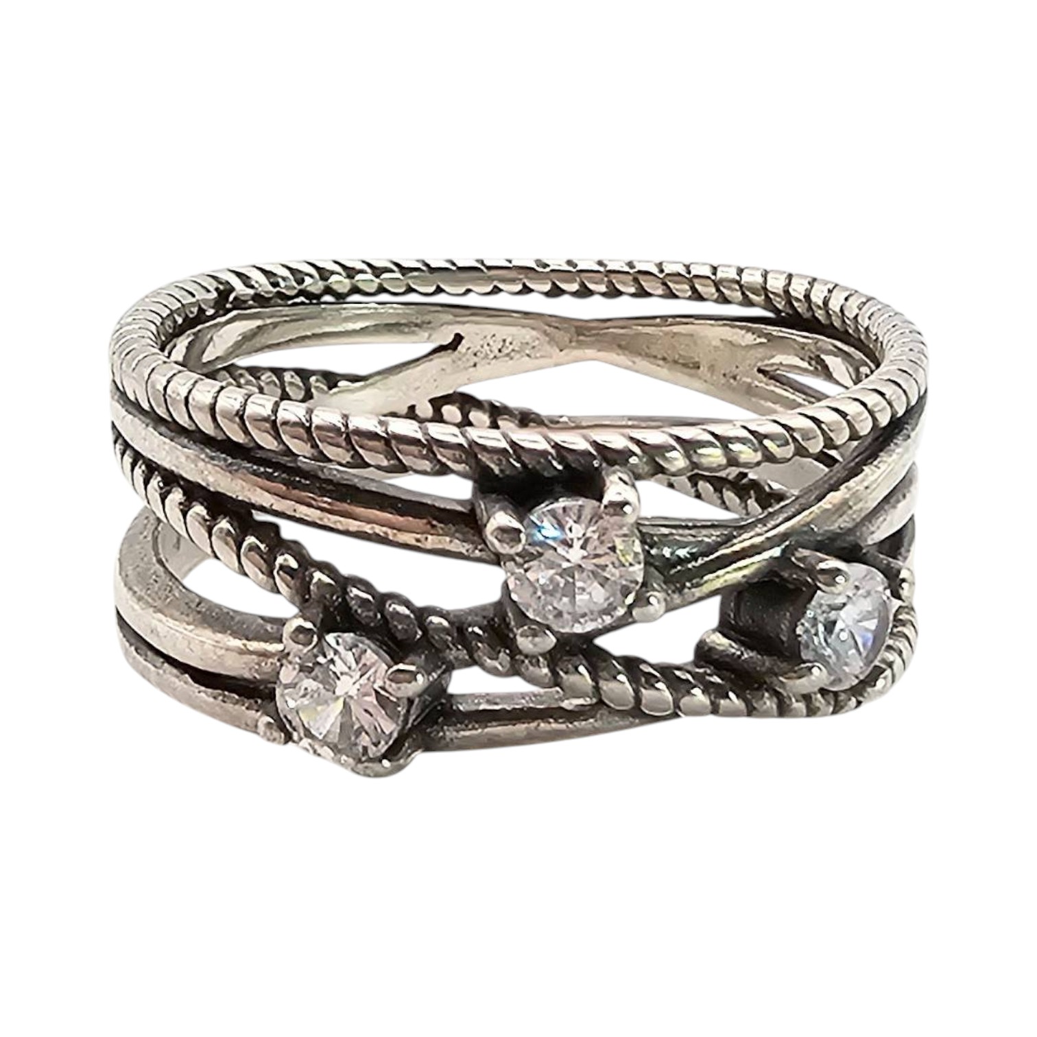 Sterling silver ring featuring a multi-band design with three rhinestones in an elegant setting. The ring has a size of 7.75 and weighs 3.5 grams. It showcases detailed rope-texture bands, adding to its unique style. The inner band is stamped with ‘925,’ indicating sterling silver content. Suitable for various occasions.